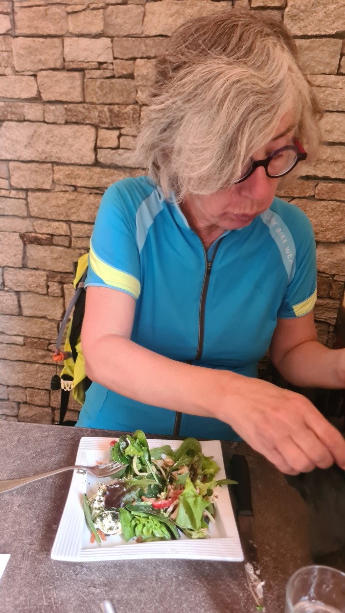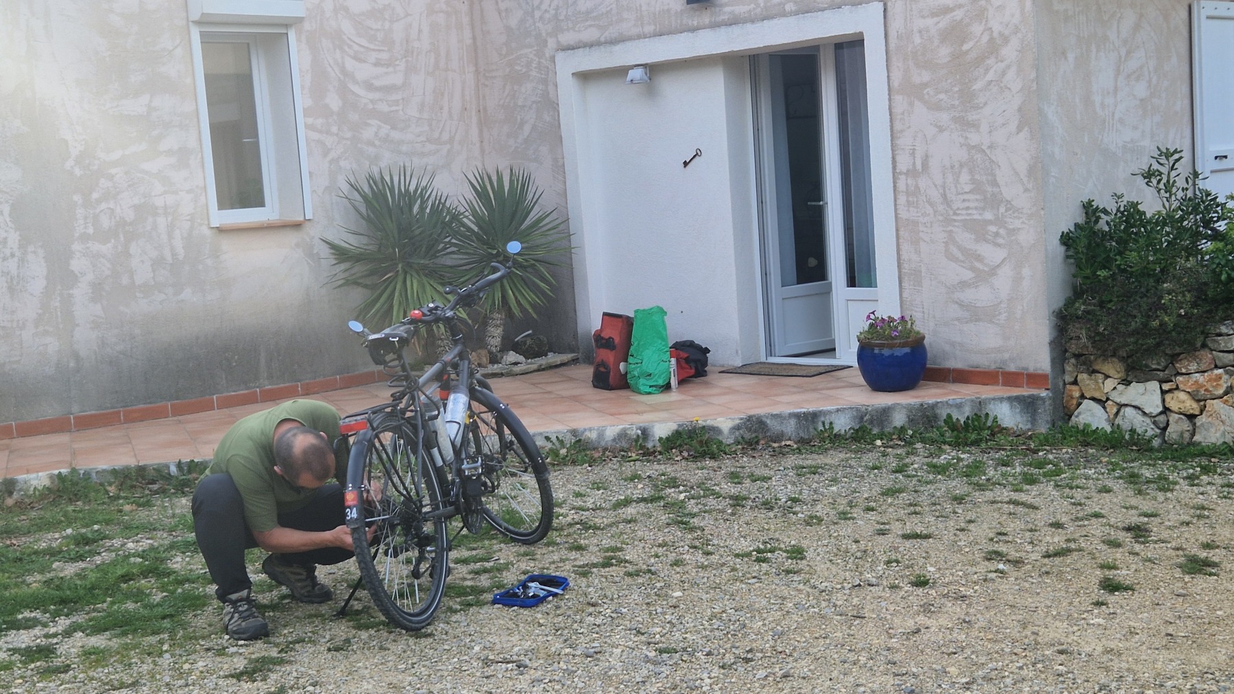 En repartant de la cascade Gisèle a remarqué que mon porte bagage arrière bougeait beaucoup. Après examen, un boulon que j’avais perdu l’année dernière et remplacé s’est cassé net. J’ai retiré la tête sans problème mais le corps reste vissé dans l’insert de mon cadre et il faudra que je trouve un mécanicien quelque part qui perce avec un petit forêt pour espérer le retirer. En attendant j’ai fixé le porte bagage avec du fil de fer…