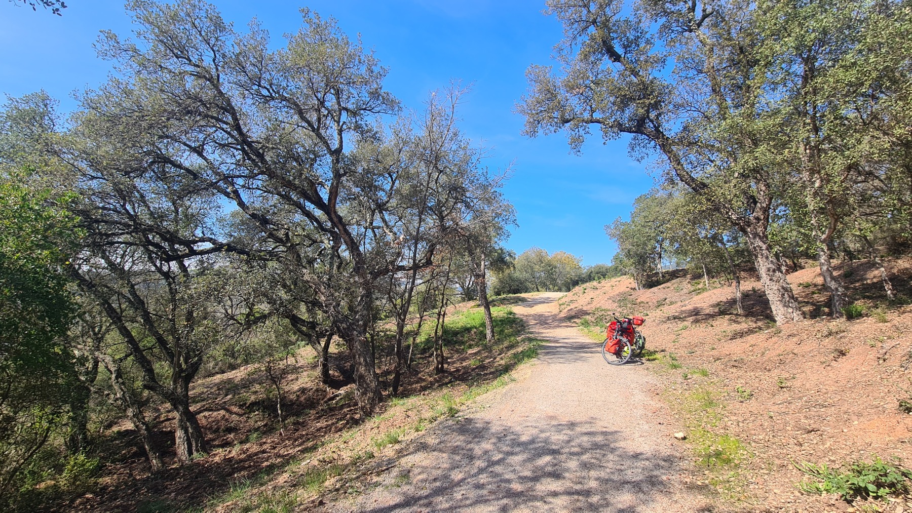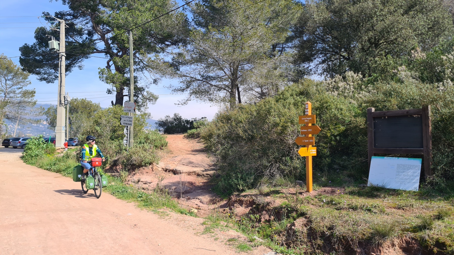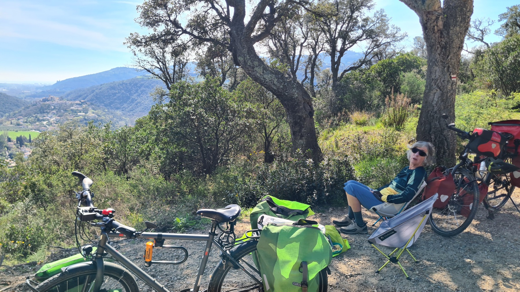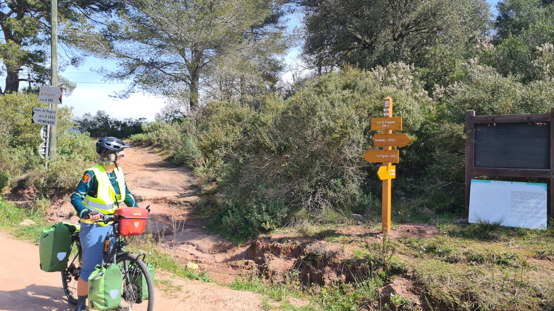 Au Col de Peygros, l’Eurovelo emprunte le GR51 sur pour une belle descente un peu « gravel » pour nos vélos de cyclotourisme. Nous avons picniqué dans une boucle de ce GR sur une belle terrasse avec vus sur mer.