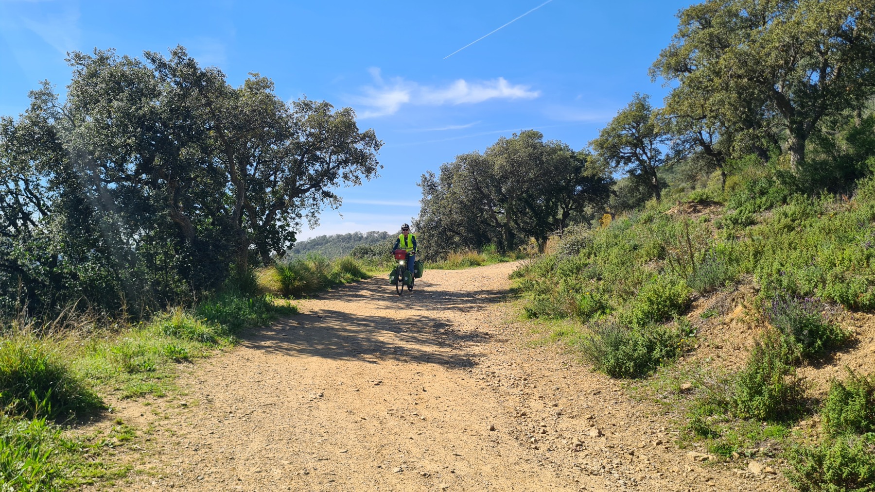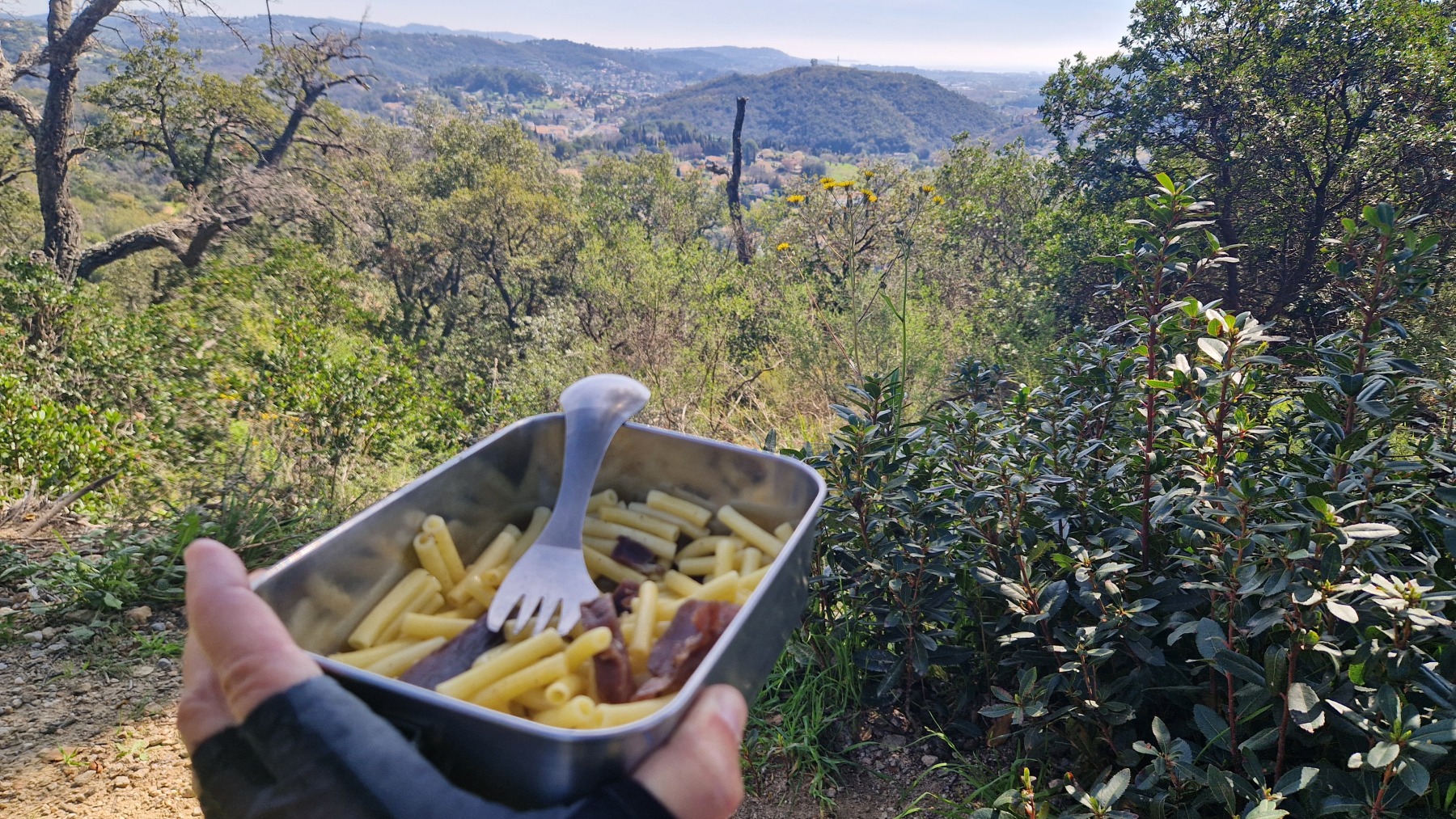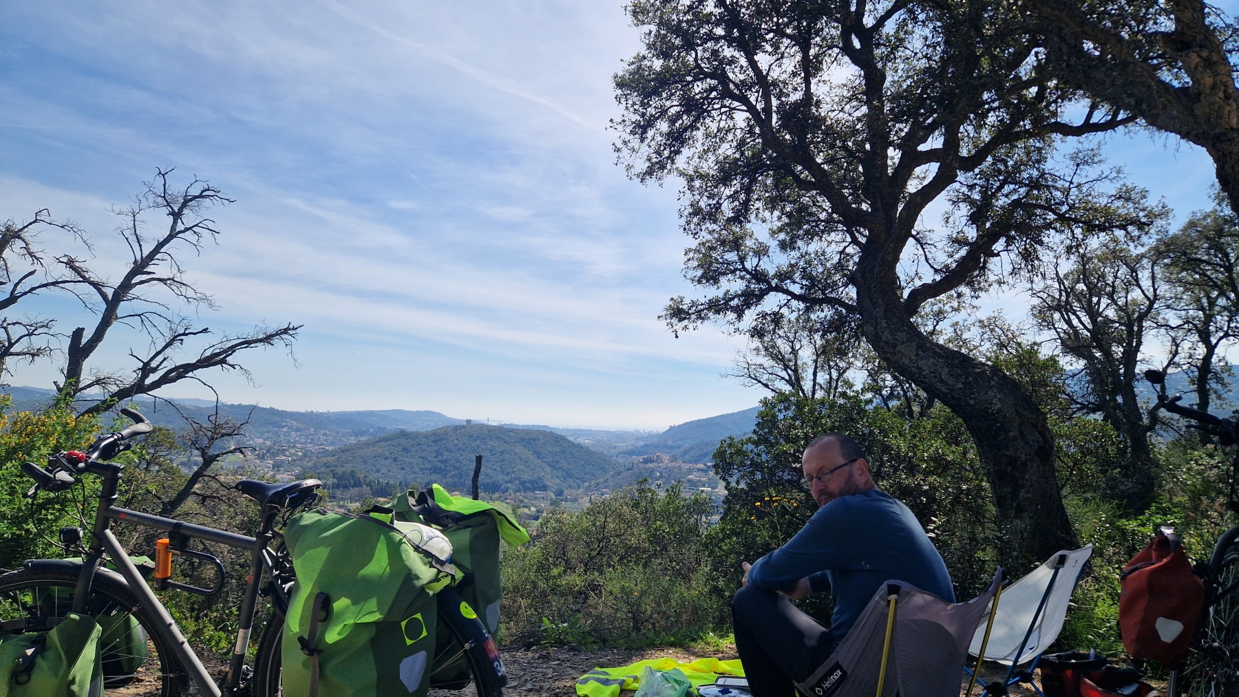 Au Col de Peygros, l’Eurovelo emprunte le GR51 sur pour une belle descente un peu « gravel » pour nos vélos de cyclotourisme. Nous avons picniqué dans une boucle de ce GR sur une belle terrasse avec vus sur mer.