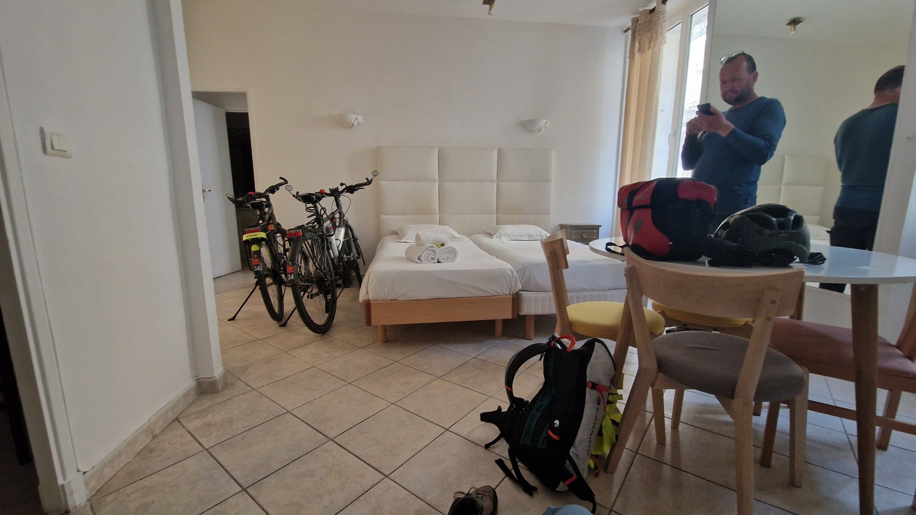 Nous logeons dans un hôtel labellisé « accueil vélo » qui prend la chose au pied de la lettre et nous a surclassé dans un deux pièces pour que nous puissions y ranger les vélos !