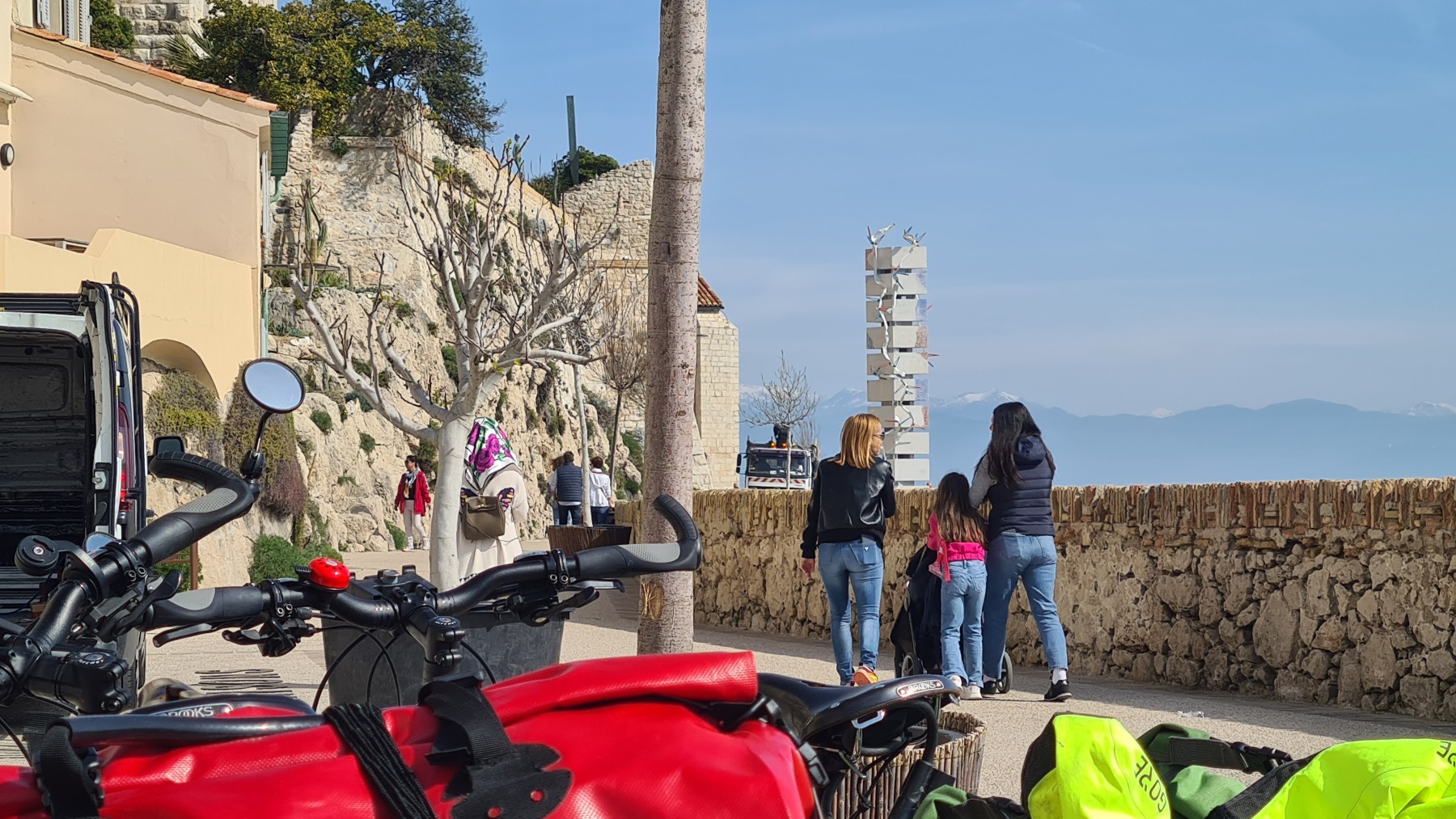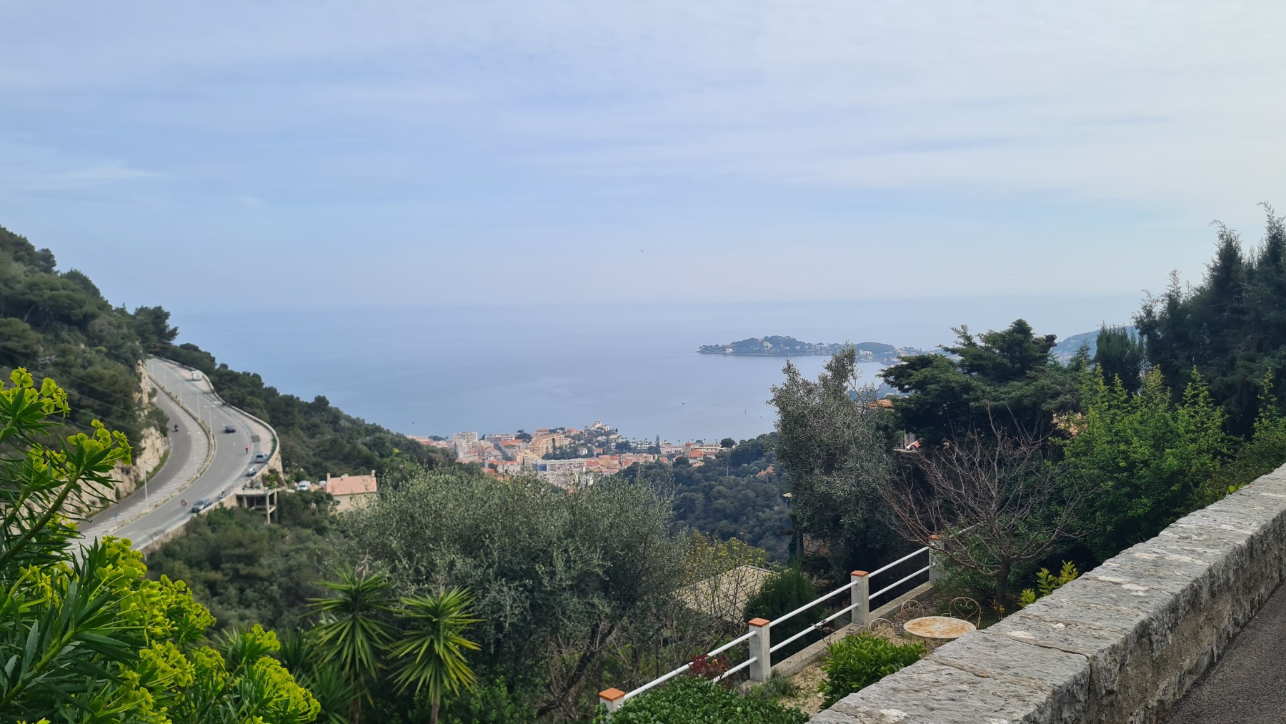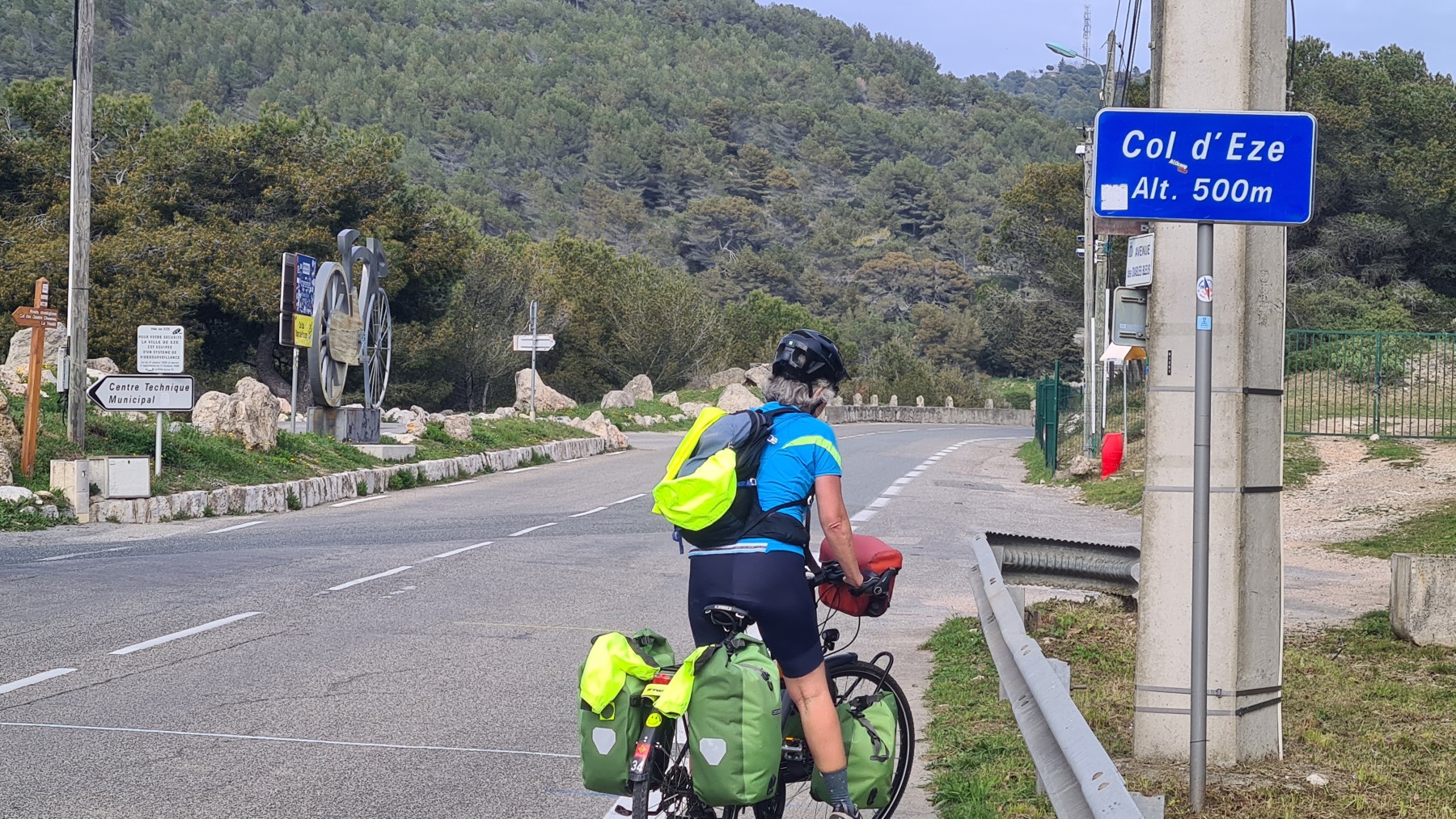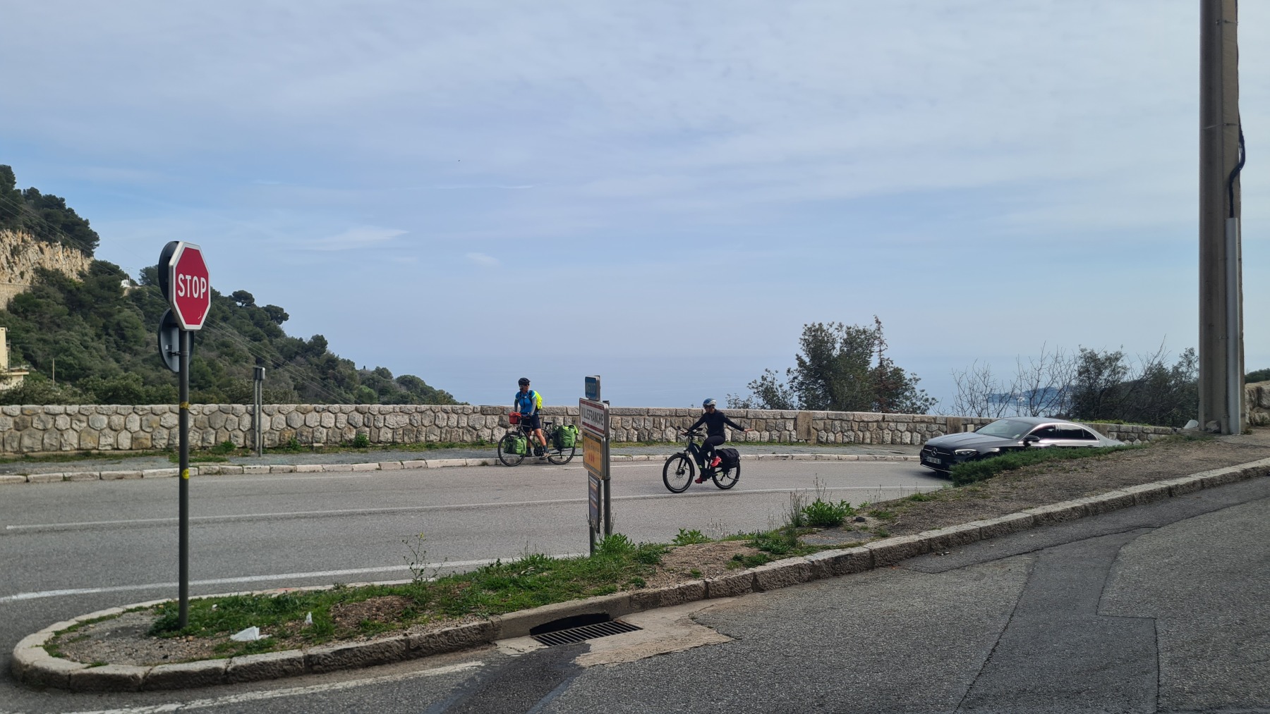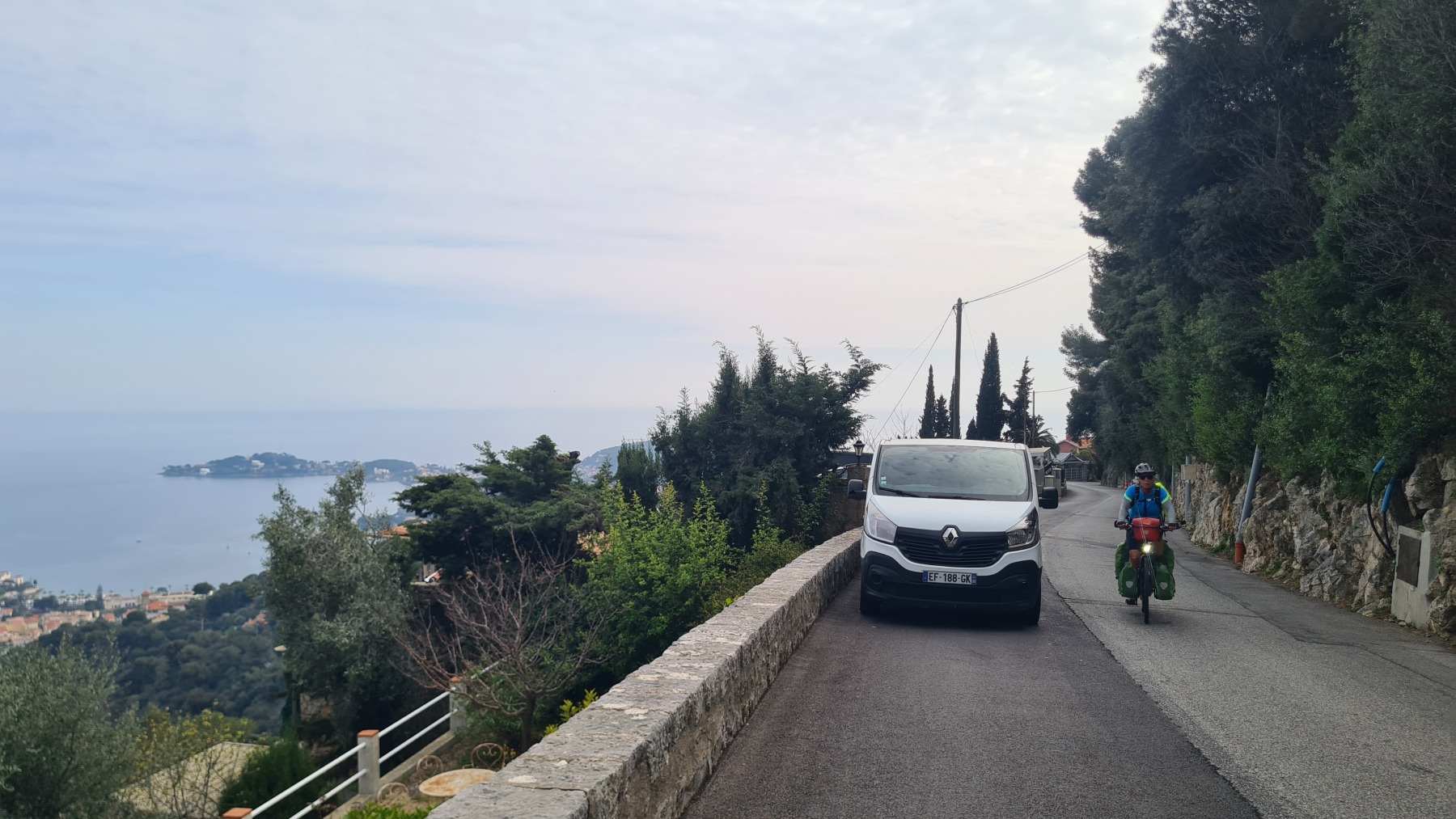 Le contraste entre les 35 kms plats et bien aménagés pour les vélos jusqu’à Nice et les 15 derniers km et leurs 550m de dénivelé sur une route de montagne est impressionnant mais la beauté des paysages sur la fameuse « haute corniche » nous a bien récompensé.