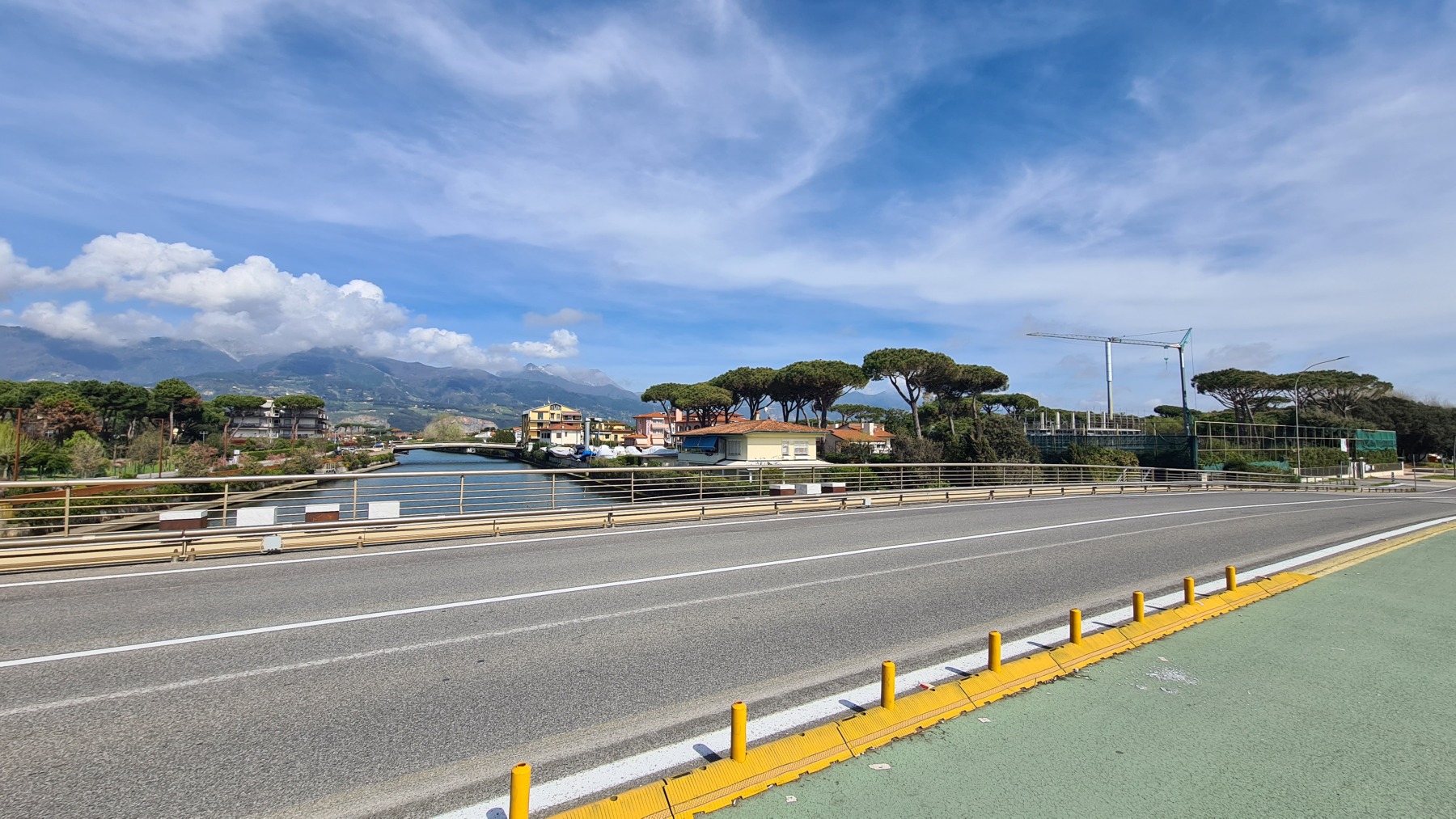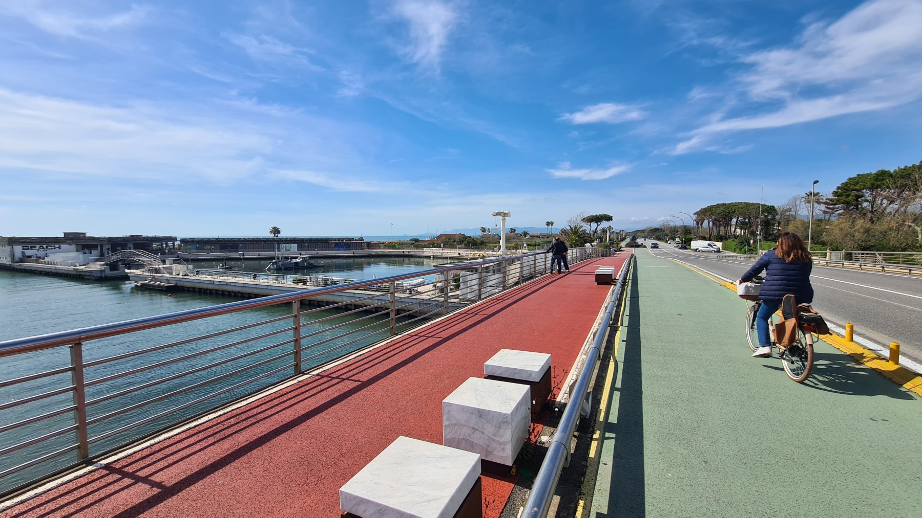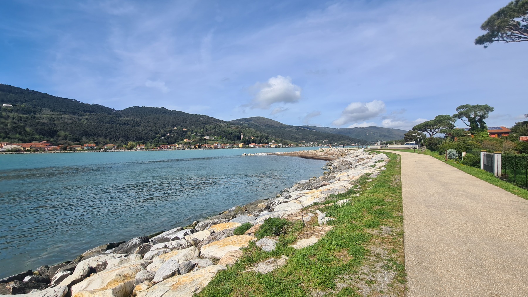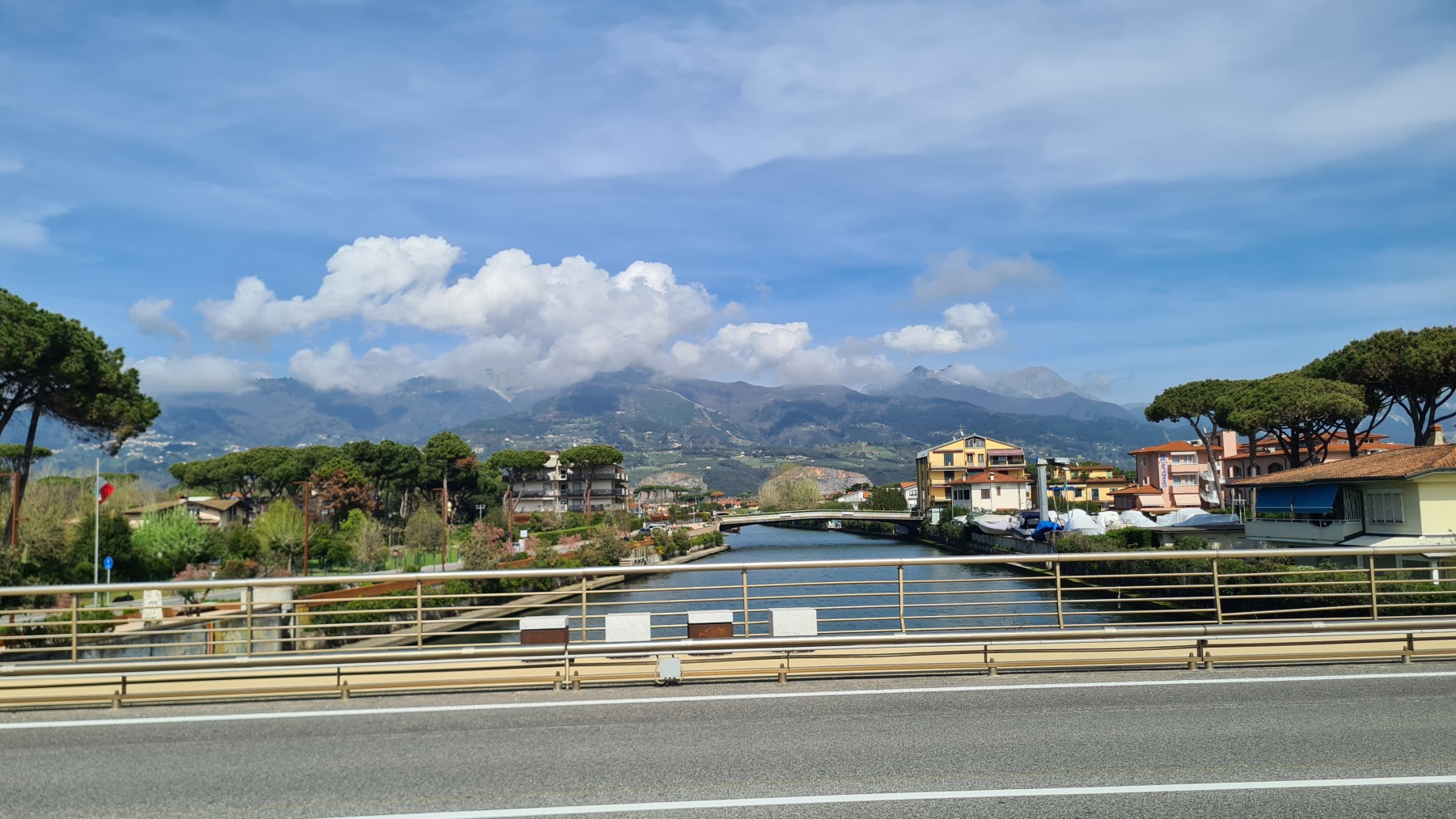 Après un peu de relief pour rejoindre la vallée de la Magra qui forme la frontière entre Ligurie et Toscane, notre itinéraire a suivi la côte pendant plus de 30 km. Une côte toscane bien différente de la Riviera ligure que nous avons suivi depuis Vintimille puisque le relief a disparu, que la côte est très rectiligne et quasiment entièrement privatisée. Nous avons donc pu suivre une belle piste cyclable, à quelques mètres de la plage sans pouvoir voir la mer cachée par les bâches vertes des plages privées !