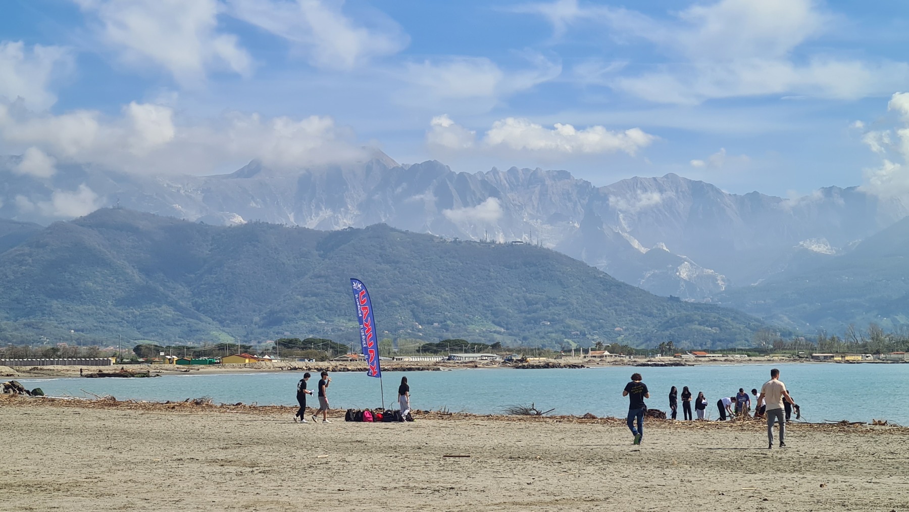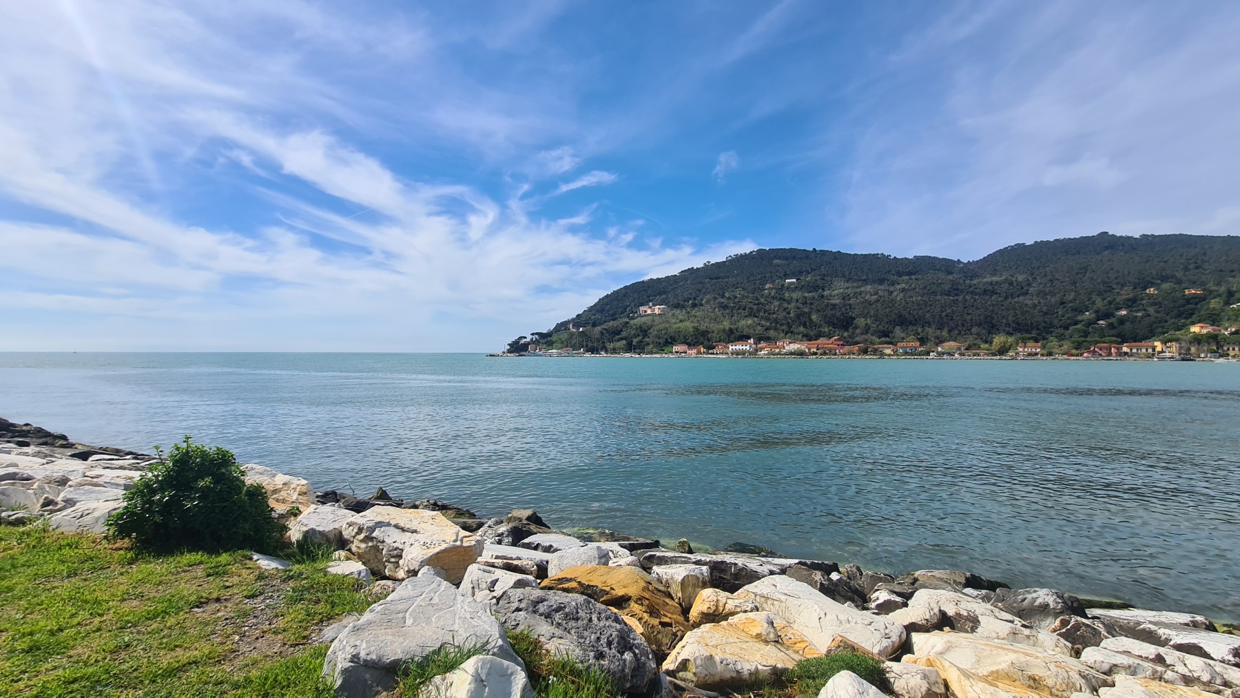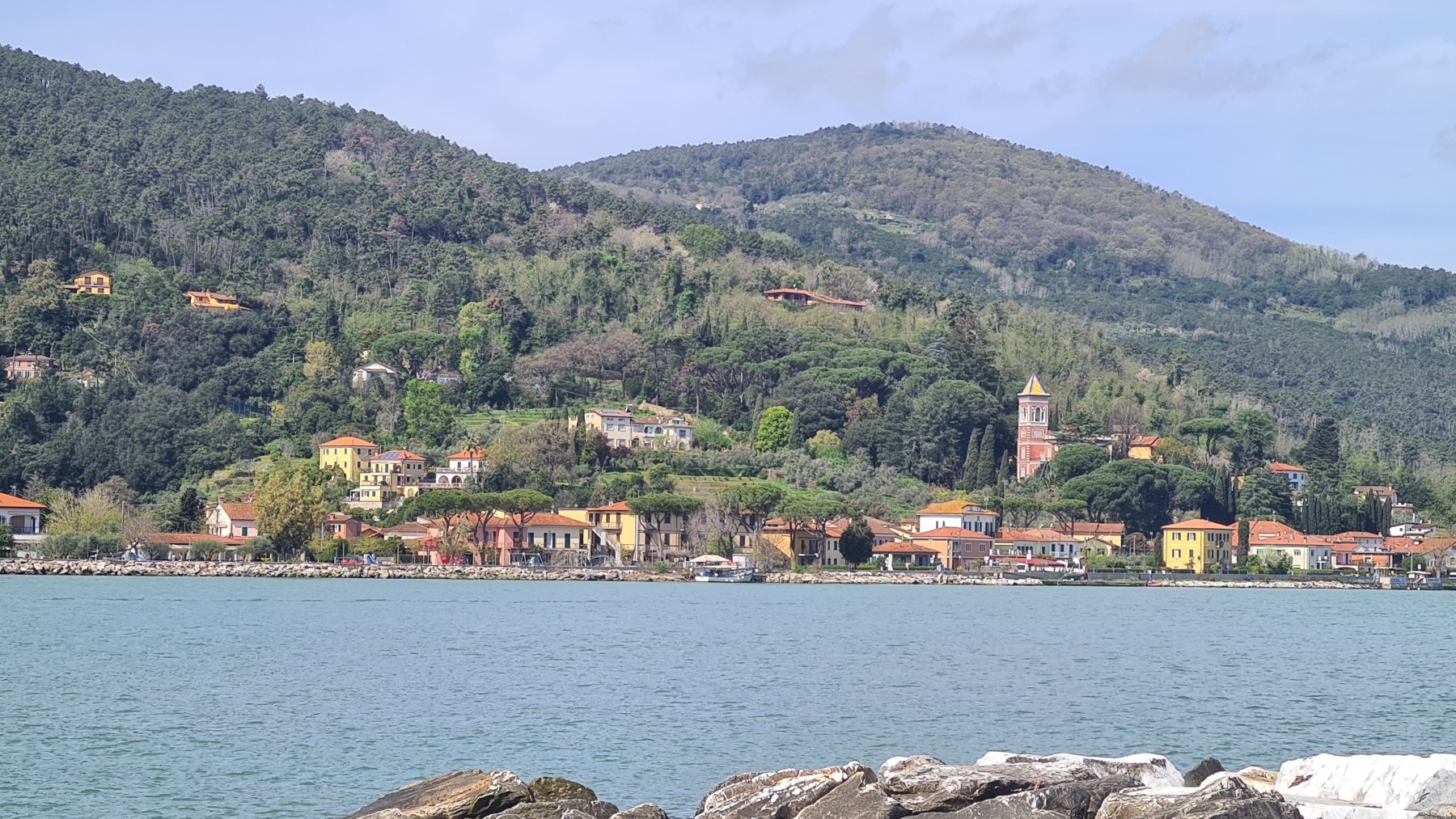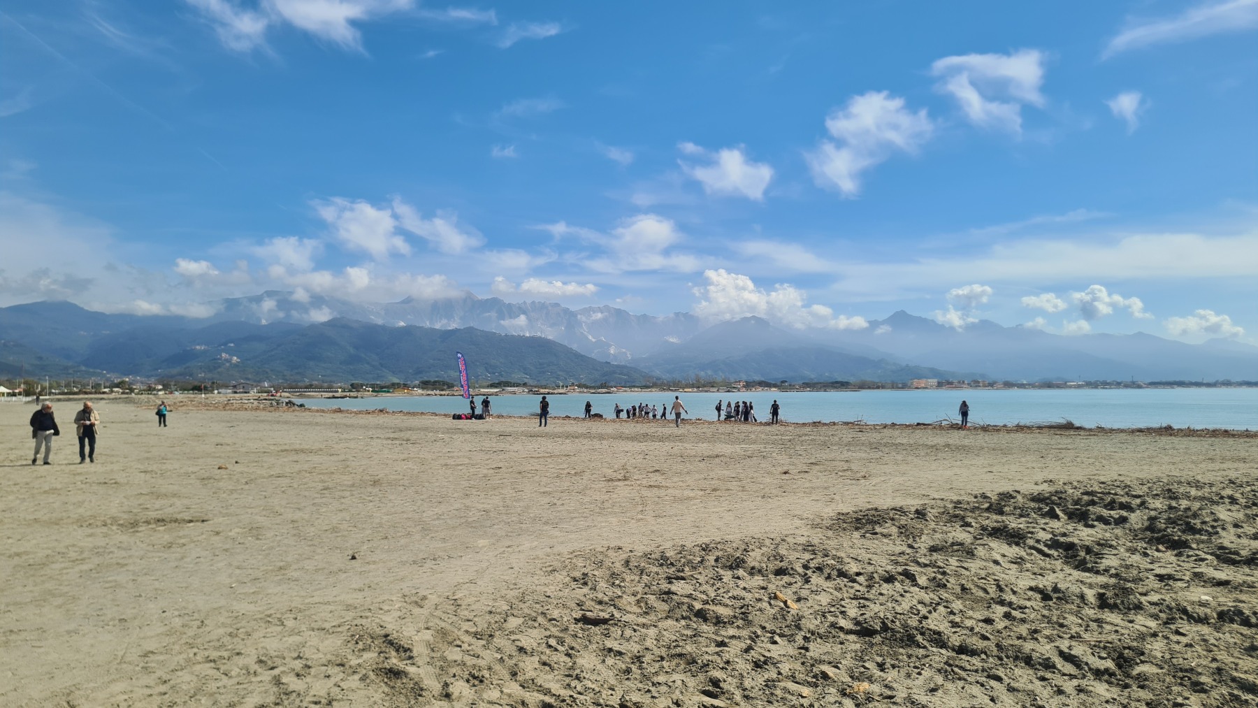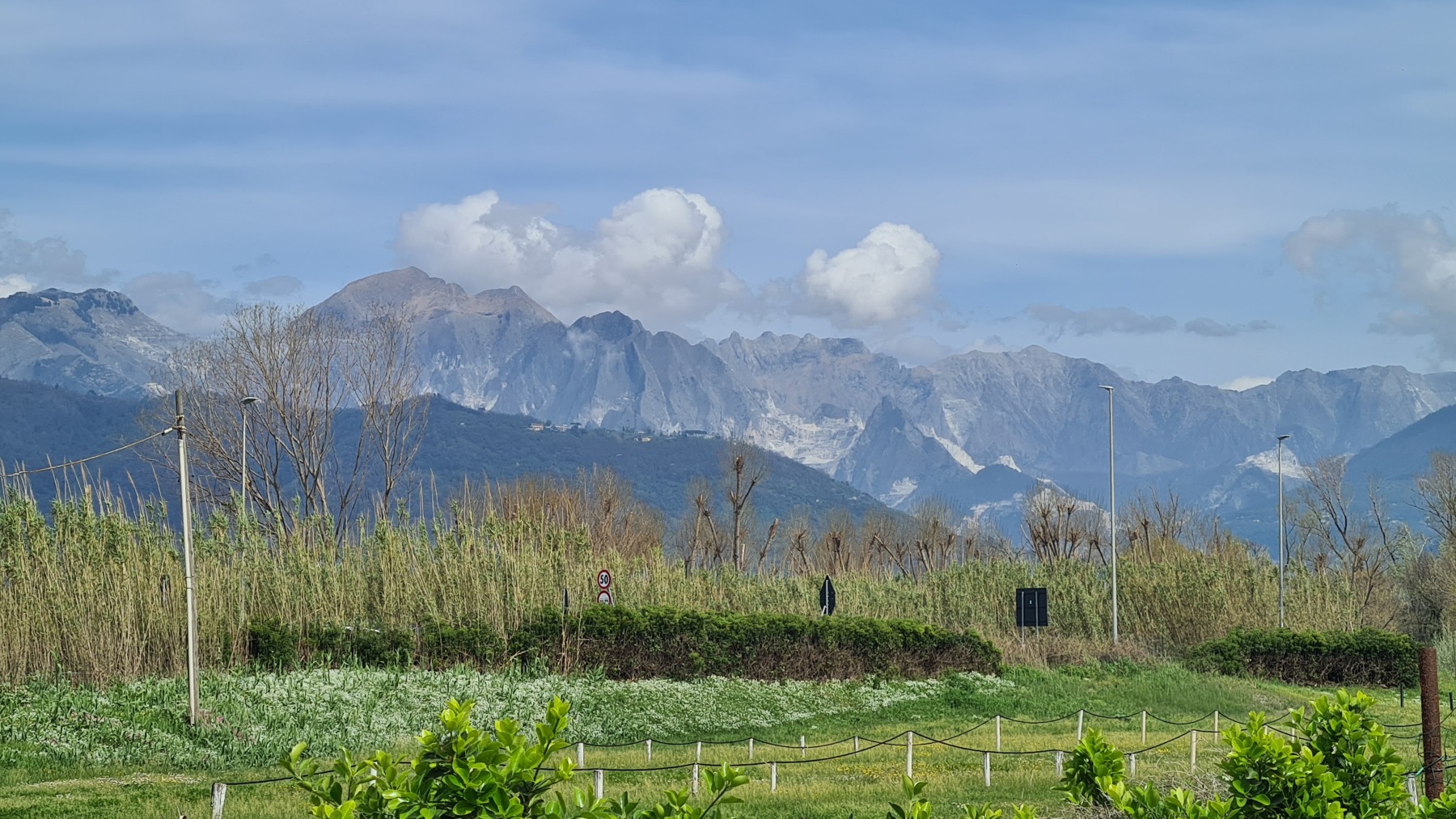 Après un peu de relief pour rejoindre la vallée de la Magra qui forme la frontière entre Ligurie et Toscane, notre itinéraire a suivi la côte pendant plus de 30 km. Une côte toscane bien différente de la Riviera ligure que nous avons suivi depuis Vintimille puisque le relief a disparu, que la côte est très rectiligne et quasiment entièrement privatisée. Nous avons donc pu suivre une belle piste cyclable, à quelques mètres de la plage sans pouvoir voir la mer cachée par les bâches vertes des plages privées !