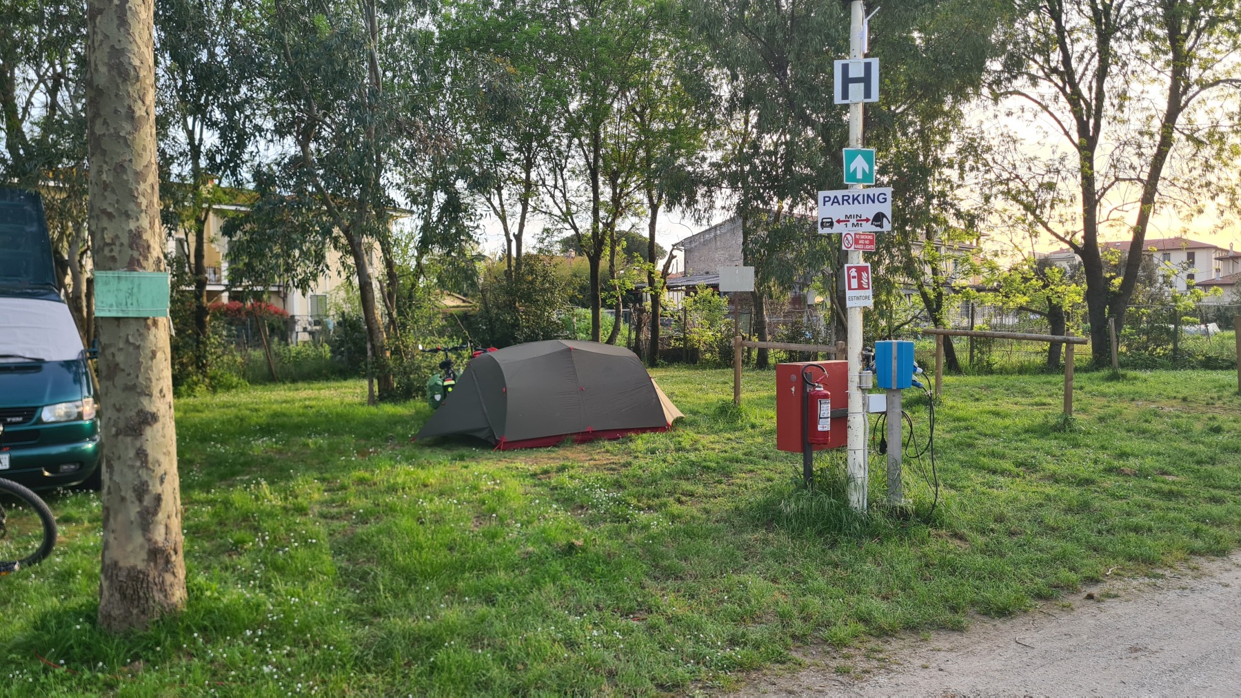 Hébergement : Camping TORRE PENDENTE (vélos à côté de la tente)