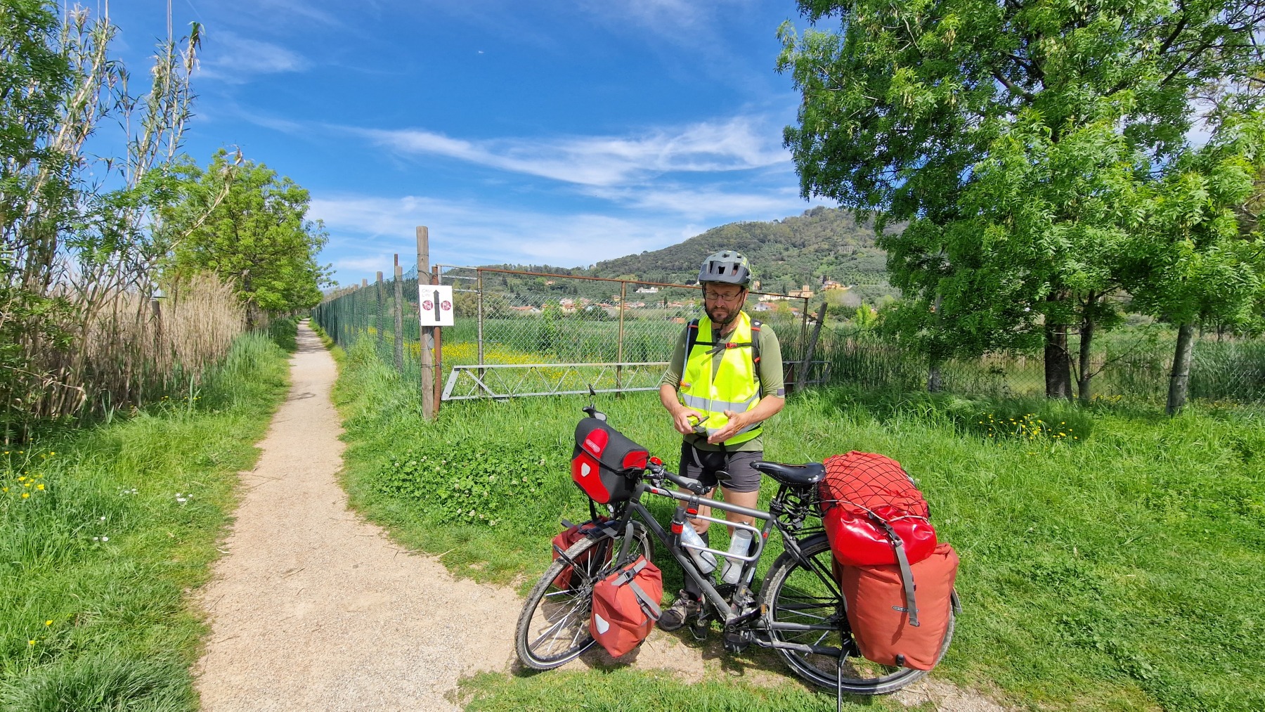 Après un crochet par Pise nous avons rejoint la Via Francigena / Eurovelo 5 à Lucques. La ville de Lucques est suffisamment belle pour qu’on y fasse étape et comme elle est proche de Pise j’ai rallongé l’itinéraire pour passer par le Lac de Massaciuccoli et les berges du Serchio.