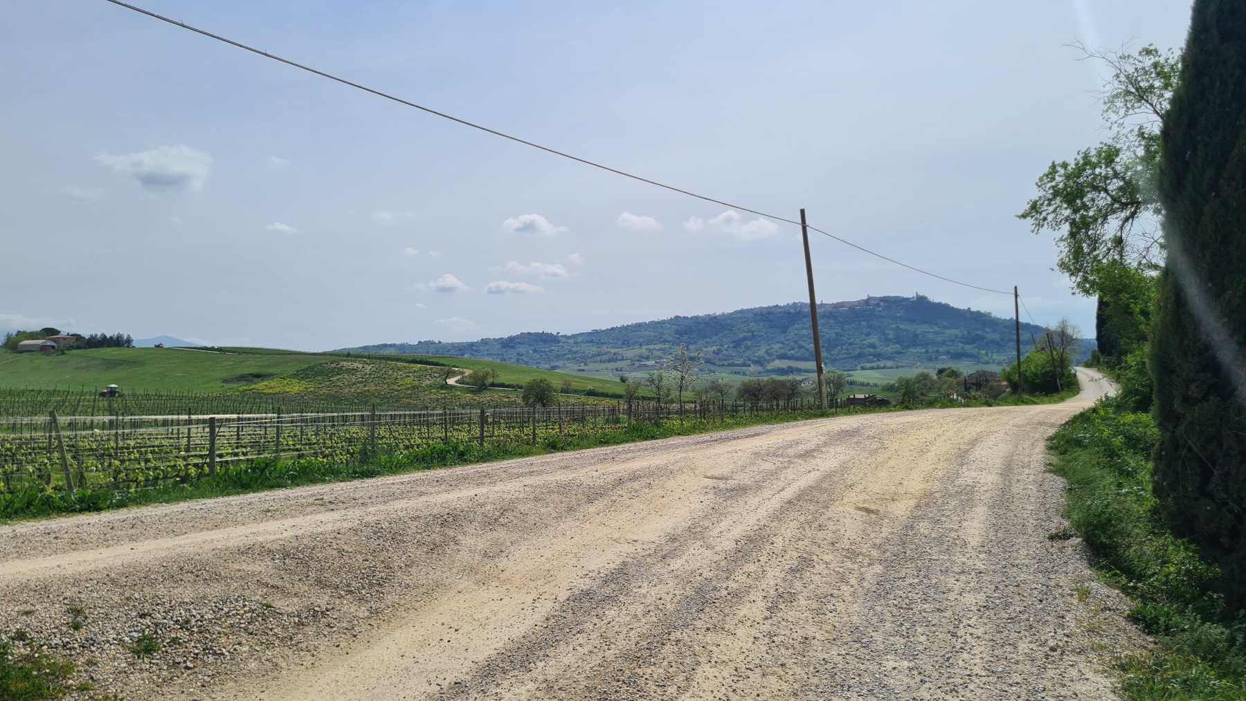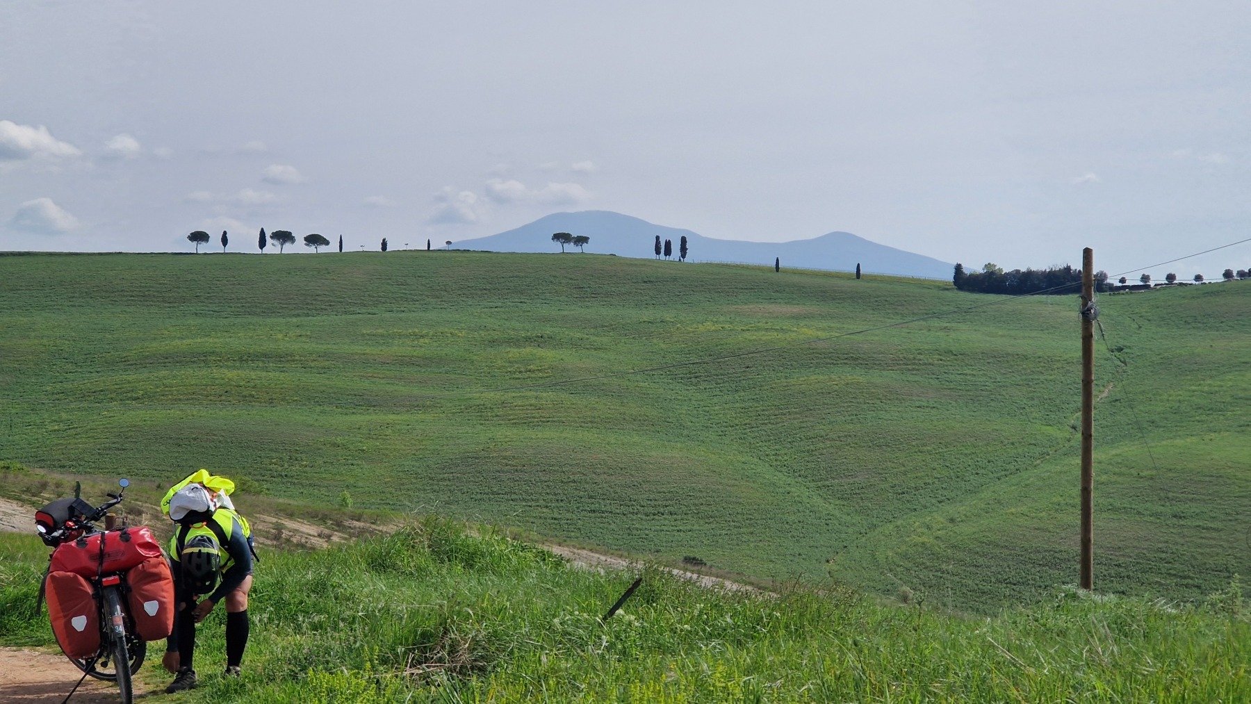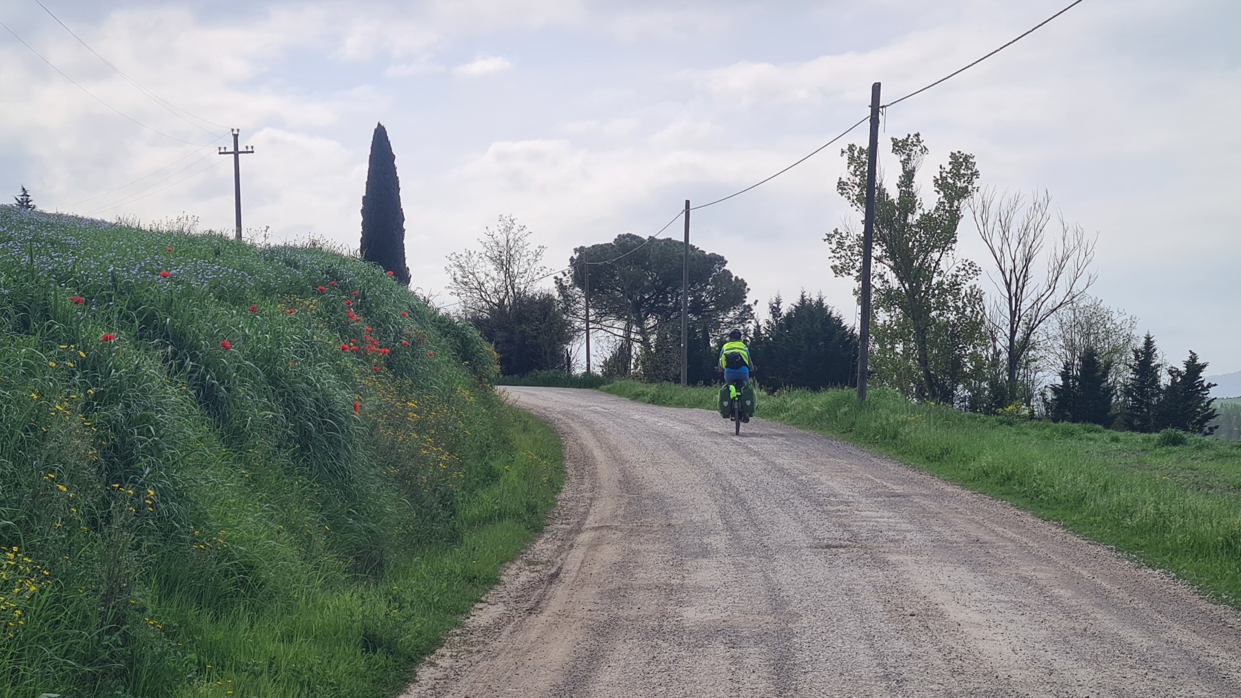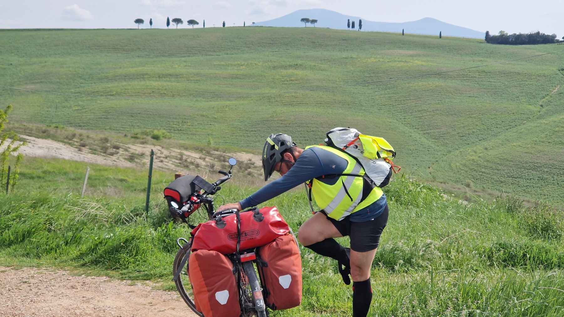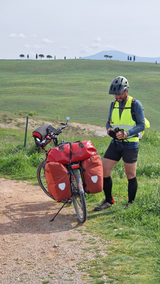 Sur cette étape entre Sienne et San Quirico, la Via Francigena évite la nationale en cheminant dans les collines du Val d’Arbia et du Val d’Orcia ce qui explique ce dénivelé. Les paysages n’en sont que plus beaux mais la progression est rendue plus difficile par le fait que l’itinéraire emprunte beaucoup de pistes gravillonnées et que les pentes sont parfois si raides que le vélo patine et que même en le poussant on dérape facilement. Mon genou apprécie d’ailleurs peu l’exercice de poussée de vélo et j’ai du mettre ma genouillère pour le soulager.