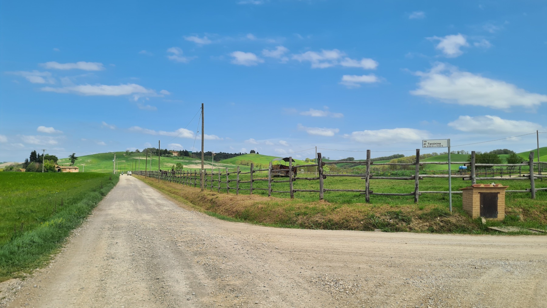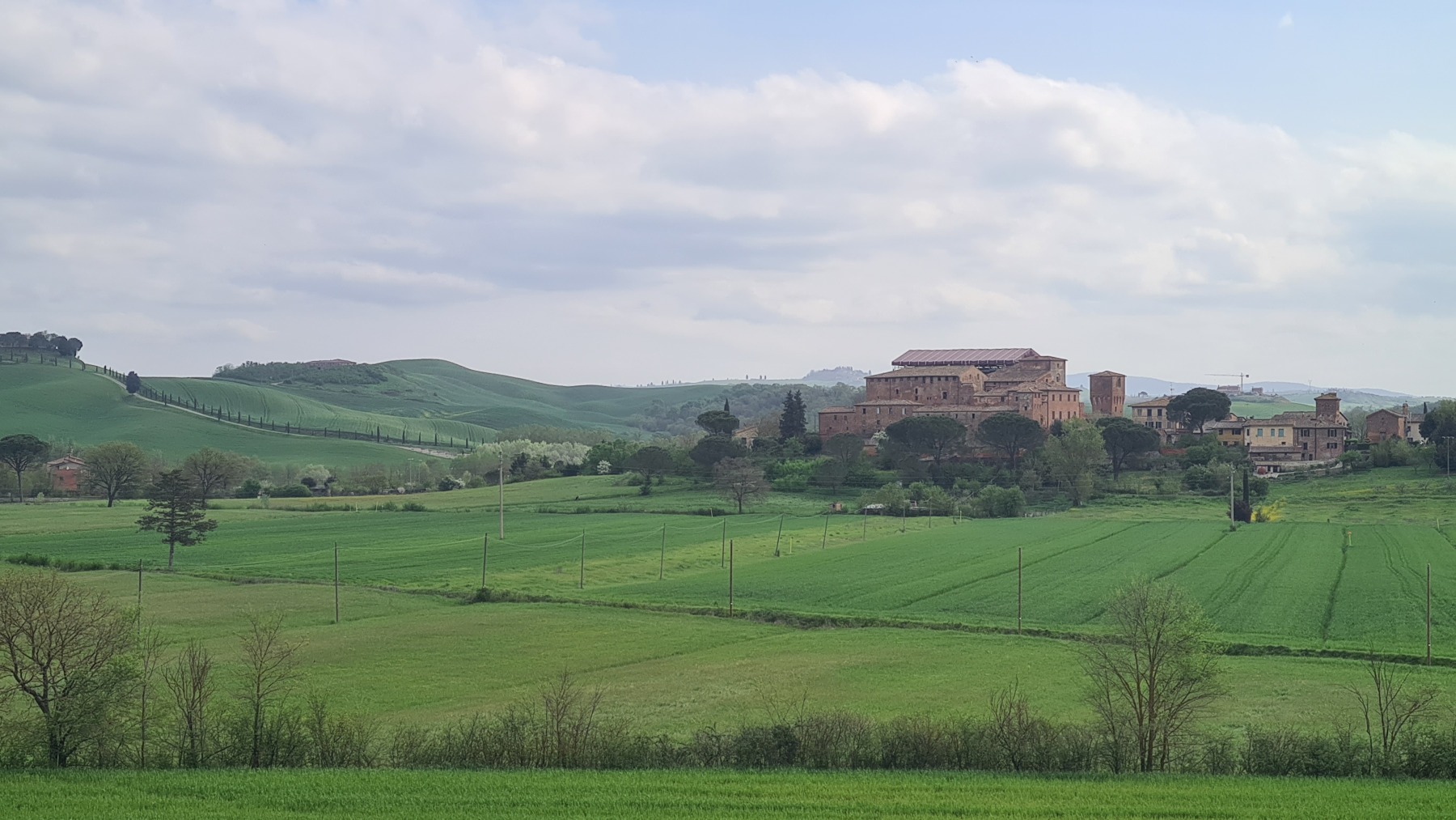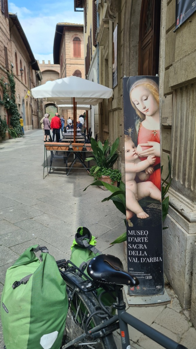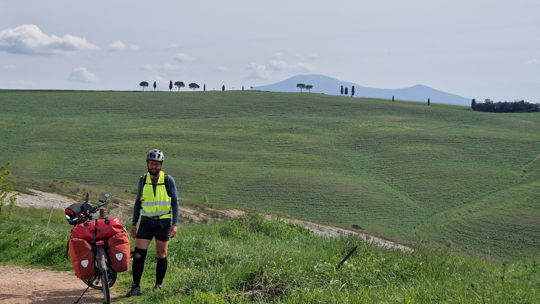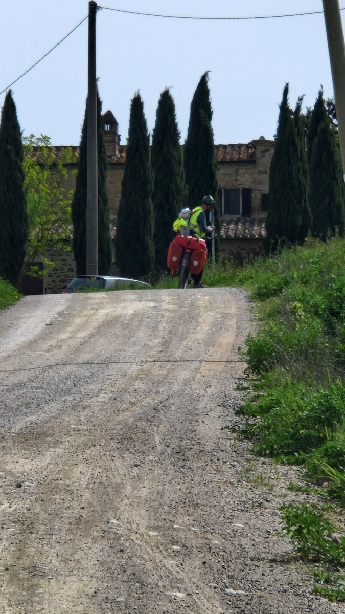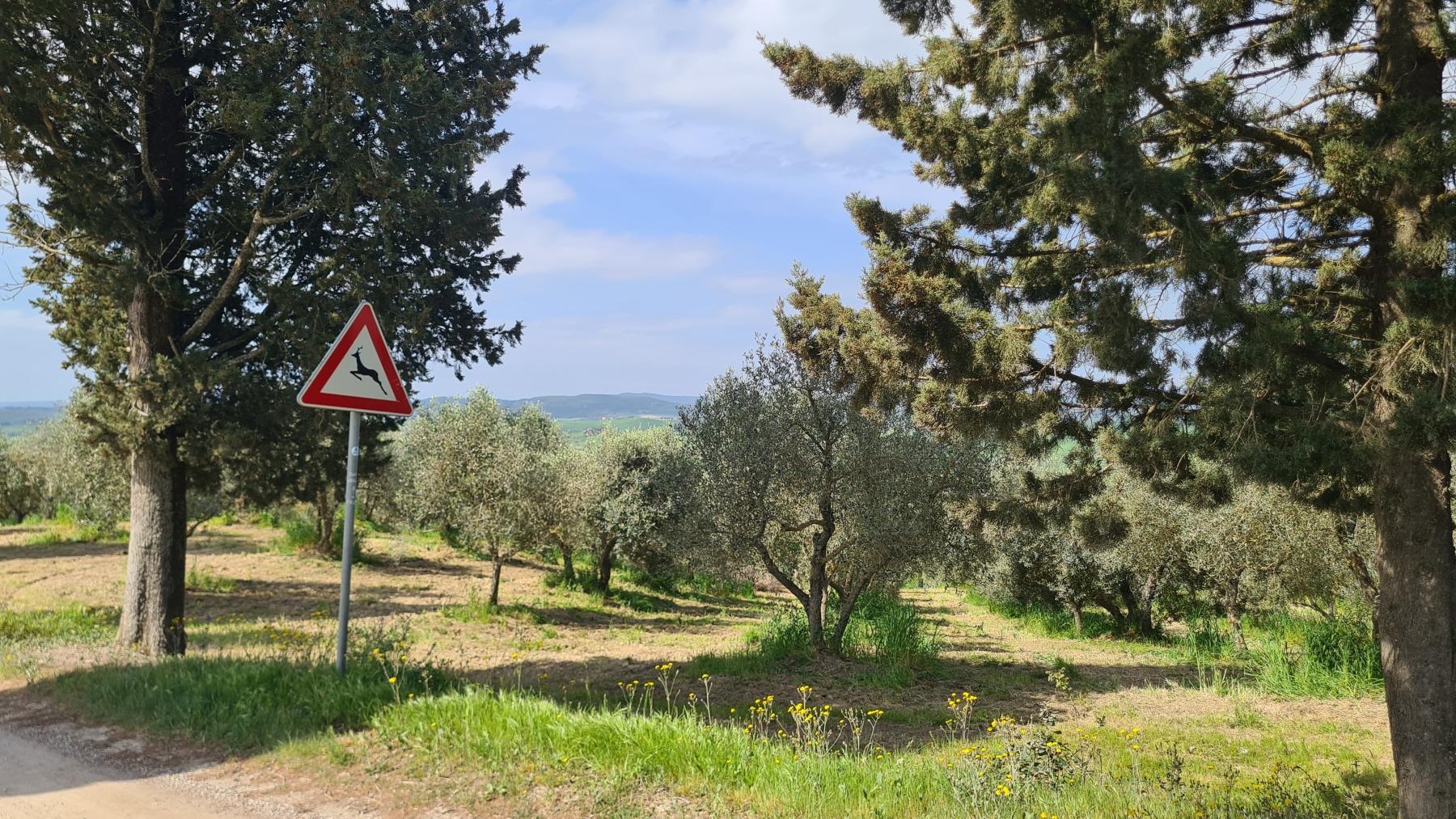 Sur cette étape entre Sienne et San Quirico, la Via Francigena évite la nationale en cheminant dans les collines du Val d’Arbia et du Val d’Orcia ce qui explique ce dénivelé. Les paysages n’en sont que plus beaux mais la progression est rendue plus difficile par le fait que l’itinéraire emprunte beaucoup de pistes gravillonnées et que les pentes sont parfois si raides que le vélo patine et que même en le poussant on dérape facilement. Mon genou apprécie d’ailleurs peu l’exercice de poussée de vélo et j’ai du mettre ma genouillère pour le soulager.