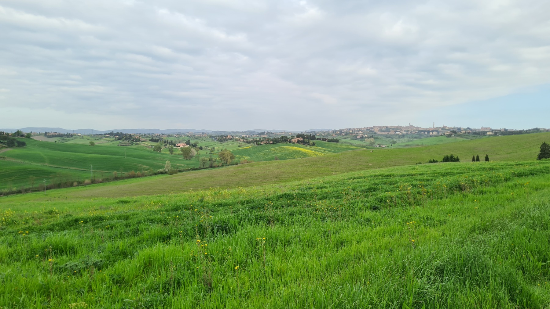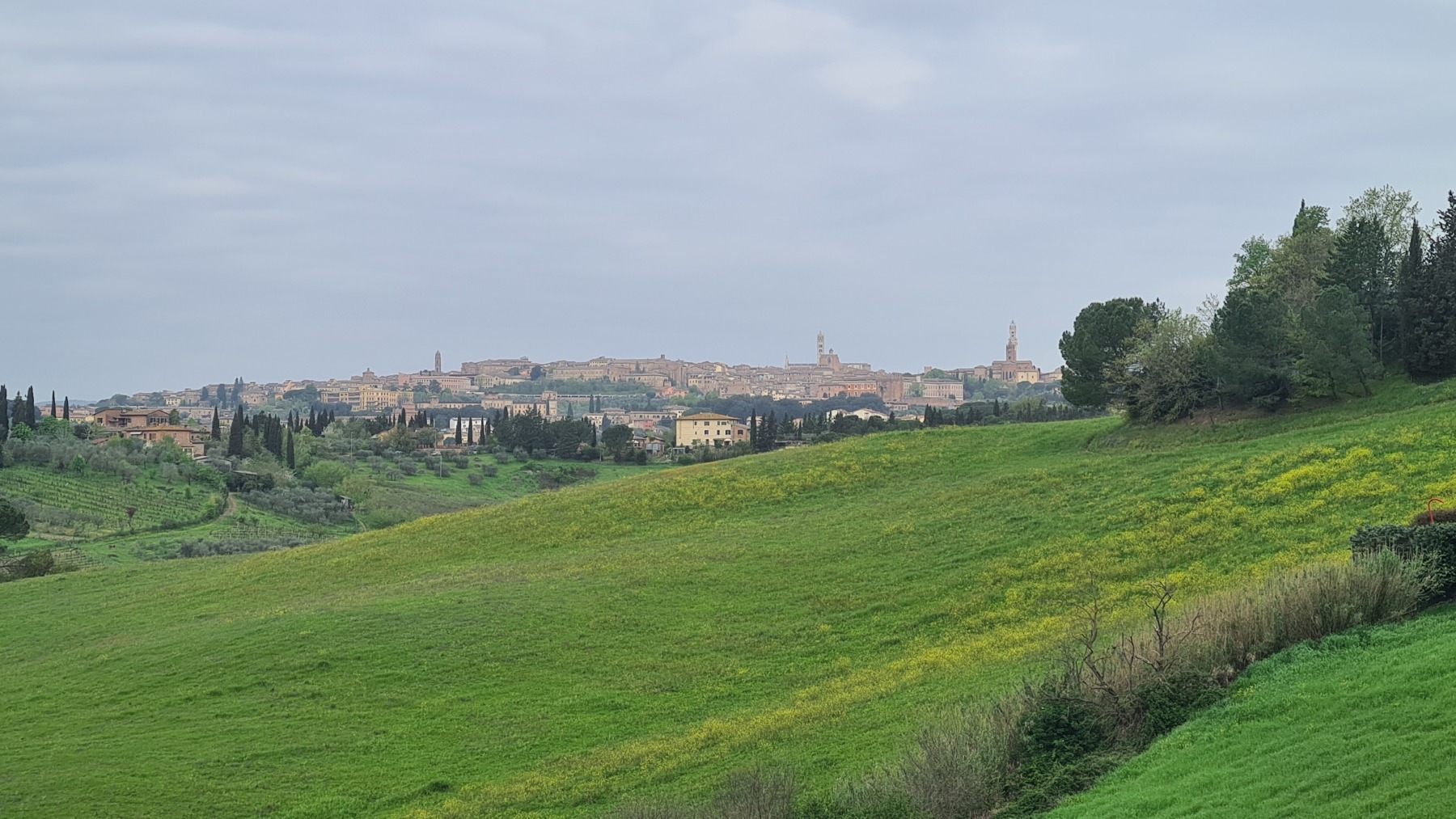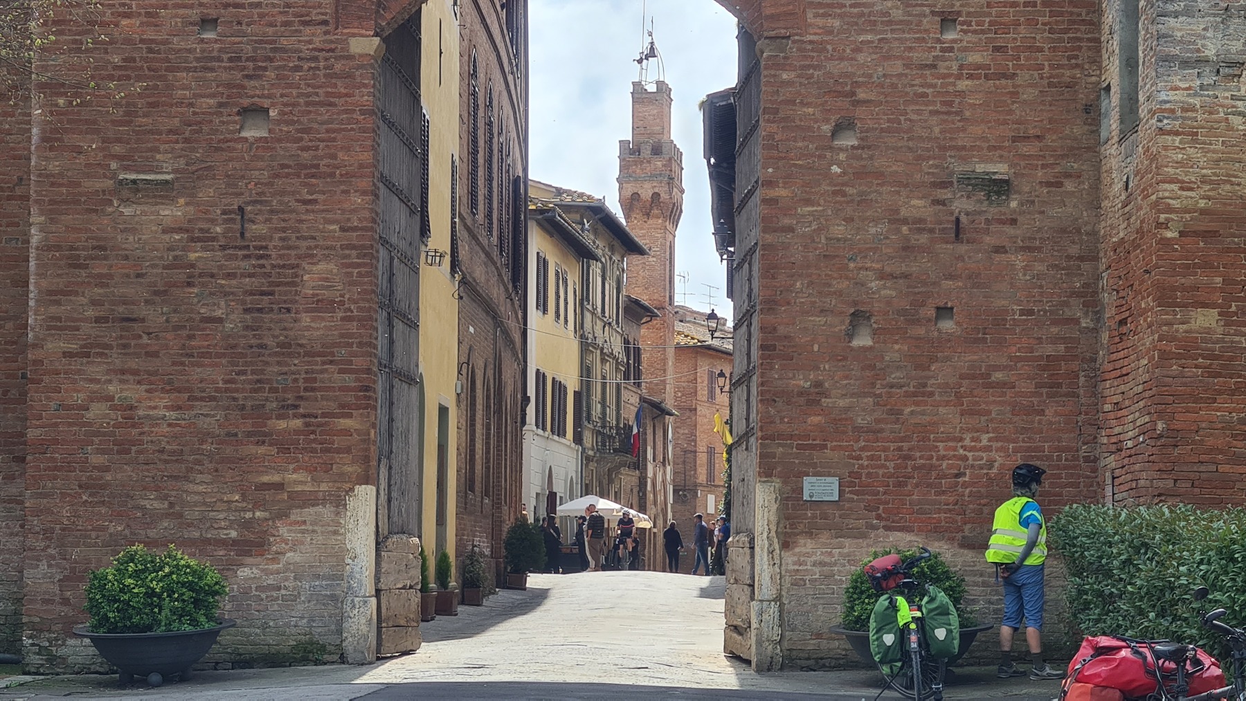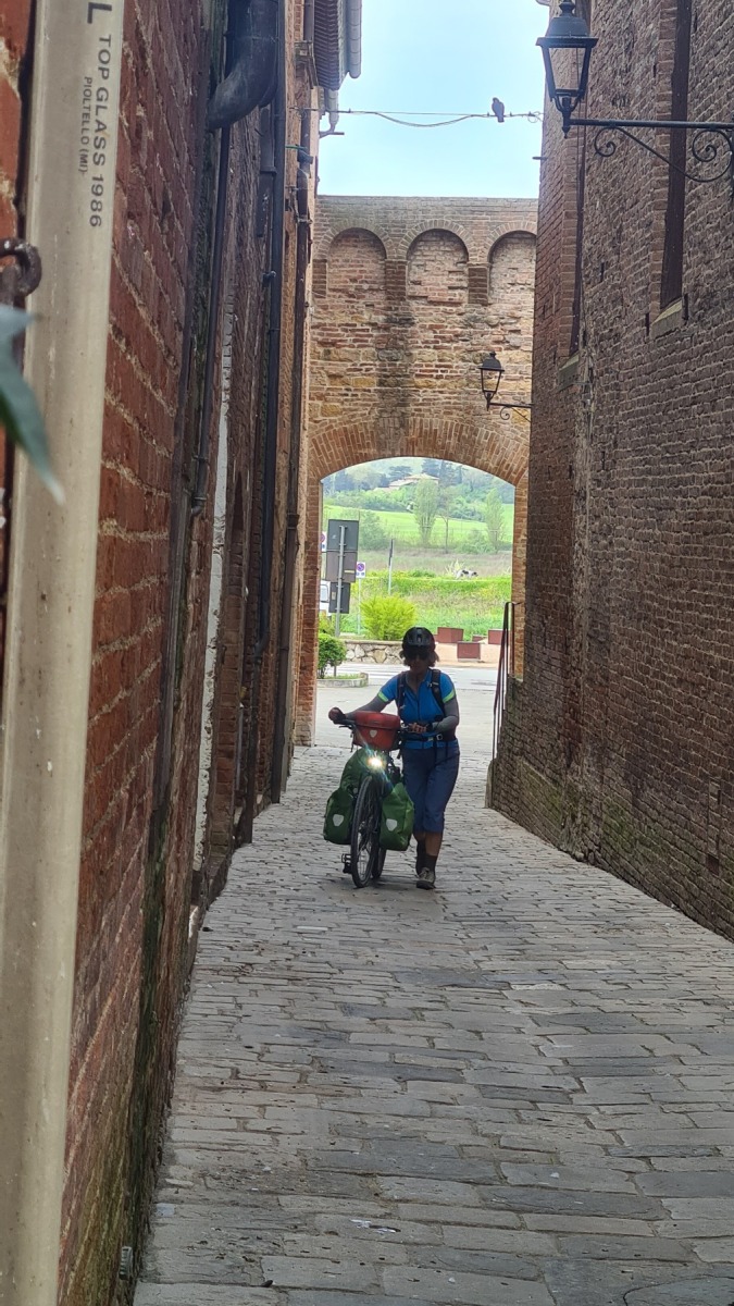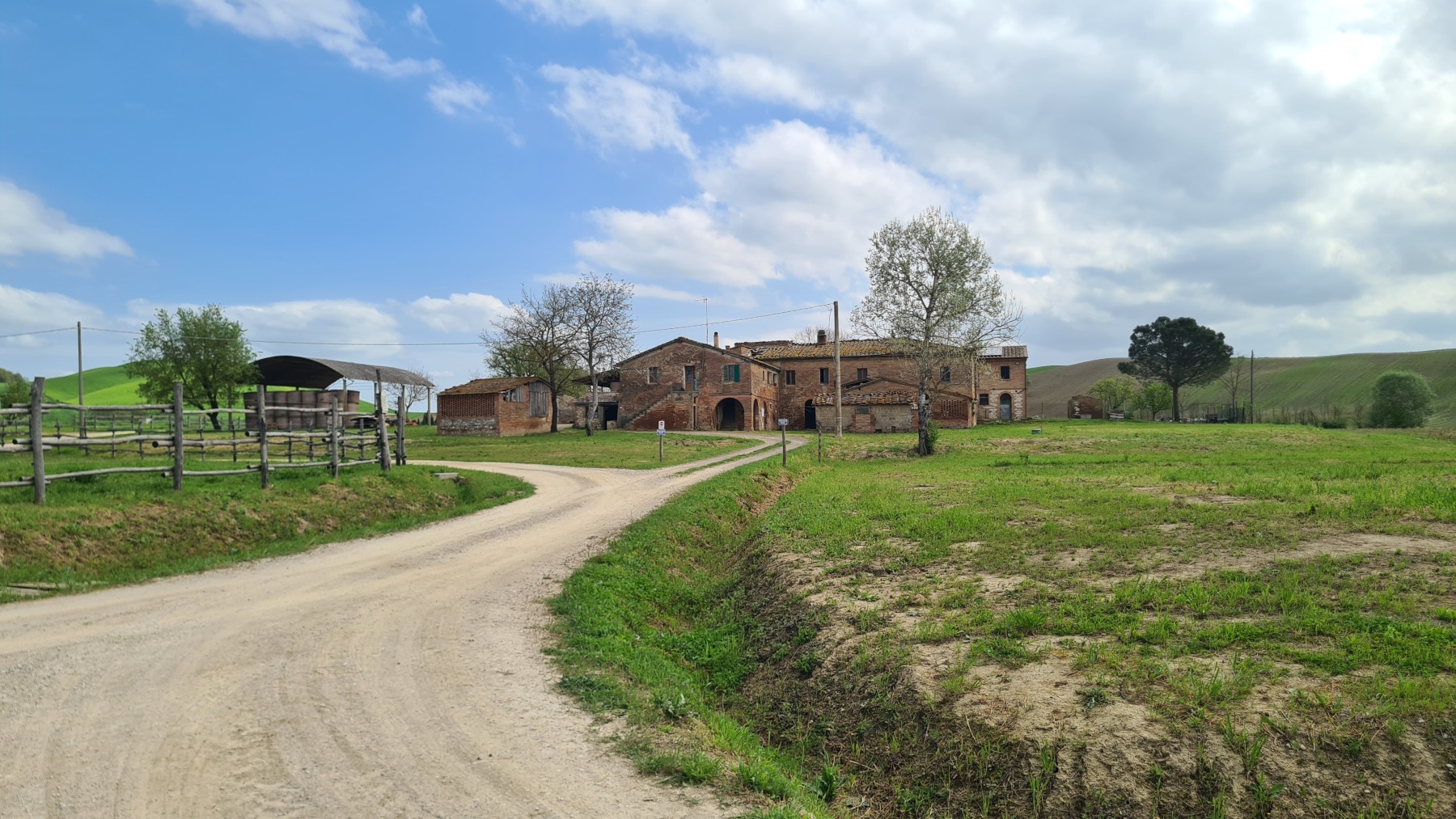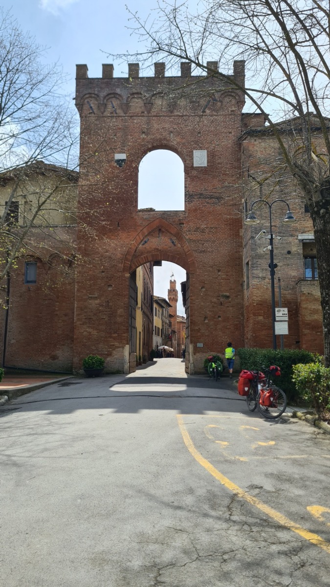 Sur cette étape entre Sienne et San Quirico, la Via Francigena évite la nationale en cheminant dans les collines du Val d’Arbia et du Val d’Orcia ce qui explique ce dénivelé. Les paysages n’en sont que plus beaux mais la progression est rendue plus difficile par le fait que l’itinéraire emprunte beaucoup de pistes gravillonnées et que les pentes sont parfois si raides que le vélo patine et que même en le poussant on dérape facilement. Mon genou apprécie d’ailleurs peu l’exercice de poussée de vélo et j’ai du mettre ma genouillère pour le soulager.