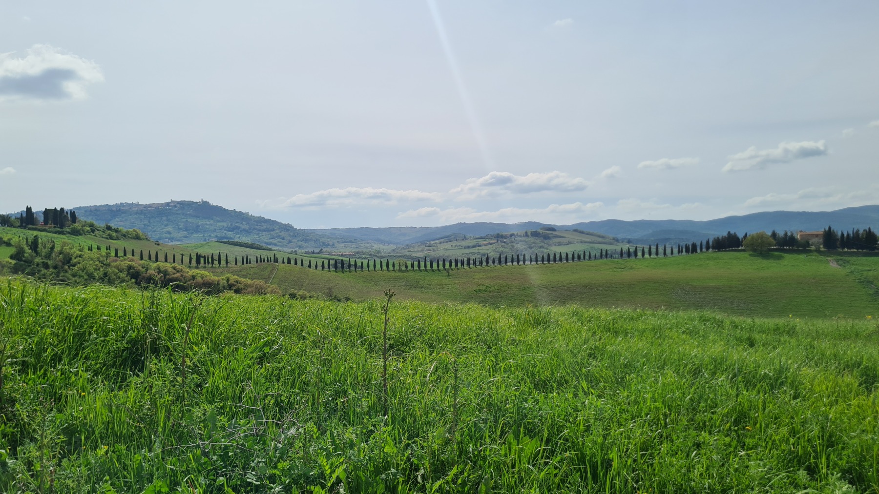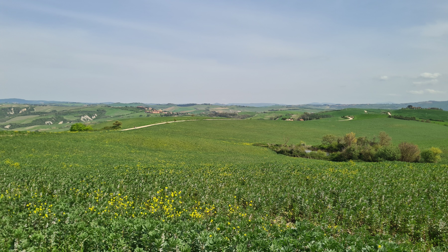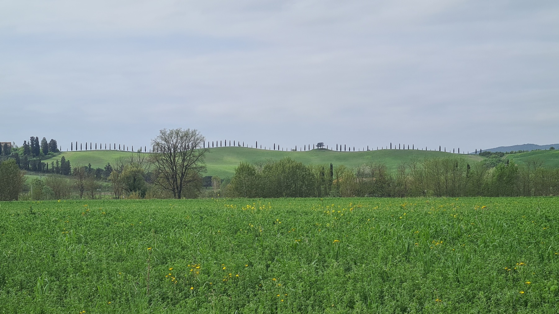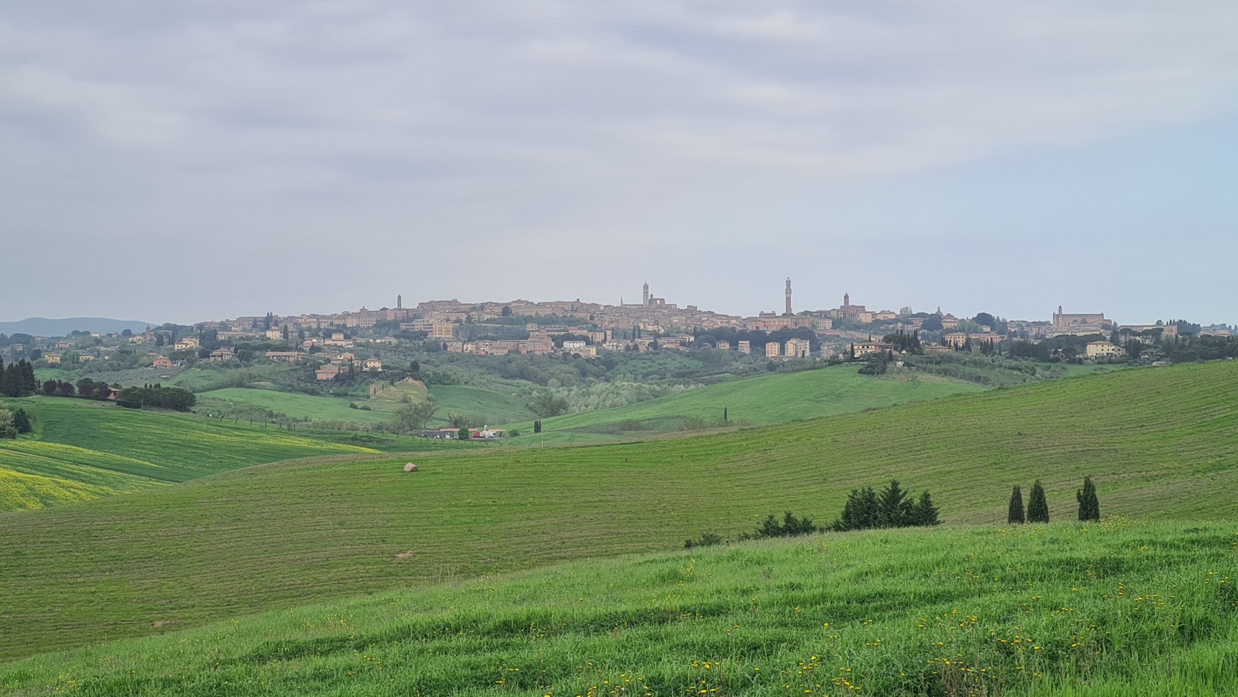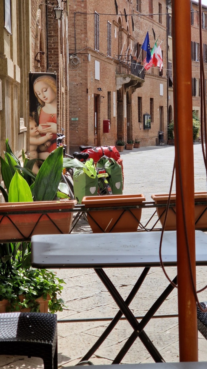 Sur cette étape entre Sienne et San Quirico, la Via Francigena évite la nationale en cheminant dans les collines du Val d’Arbia et du Val d’Orcia ce qui explique ce dénivelé. Les paysages n’en sont que plus beaux mais la progression est rendue plus difficile par le fait que l’itinéraire emprunte beaucoup de pistes gravillonnées et que les pentes sont parfois si raides que le vélo patine et que même en le poussant on dérape facilement. Mon genou apprécie d’ailleurs peu l’exercice de poussée de vélo et j’ai du mettre ma genouillère pour le soulager.