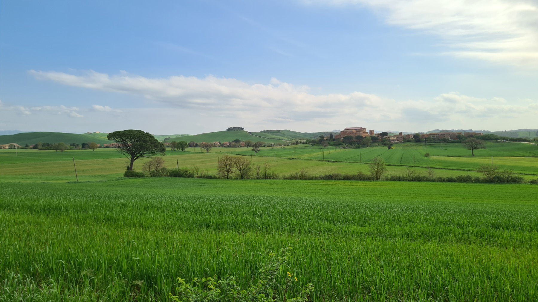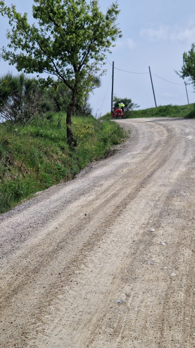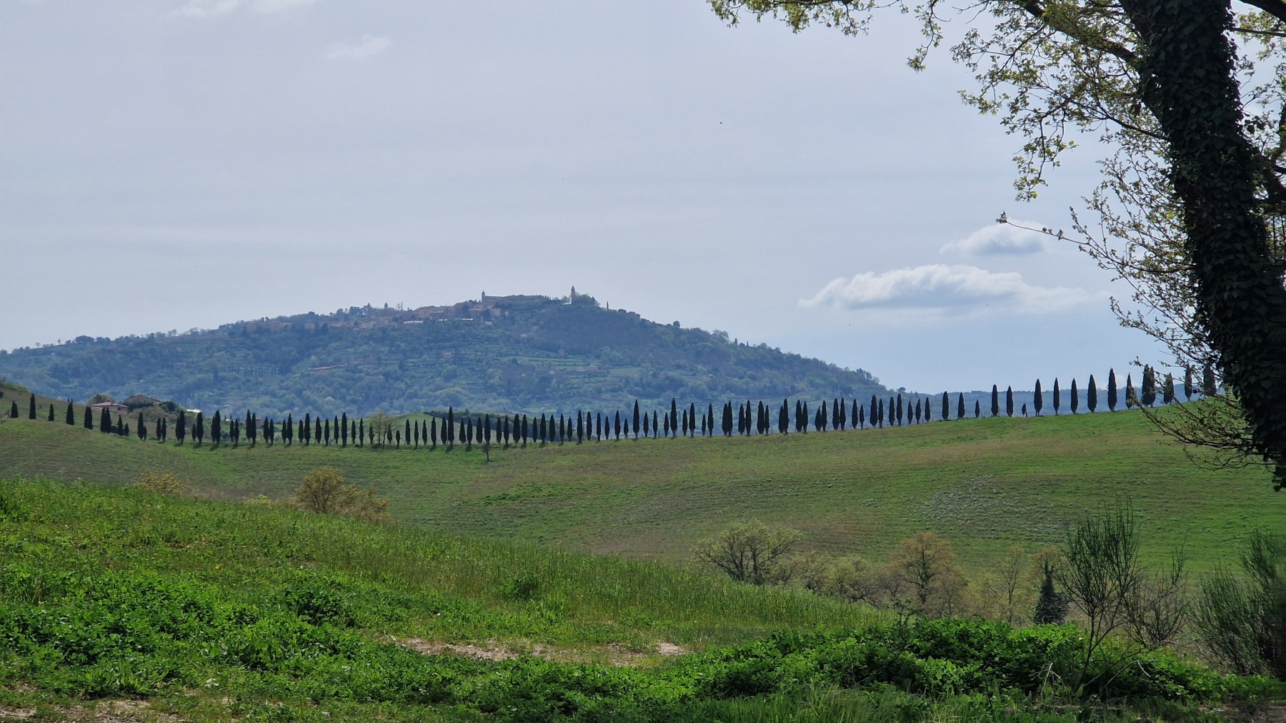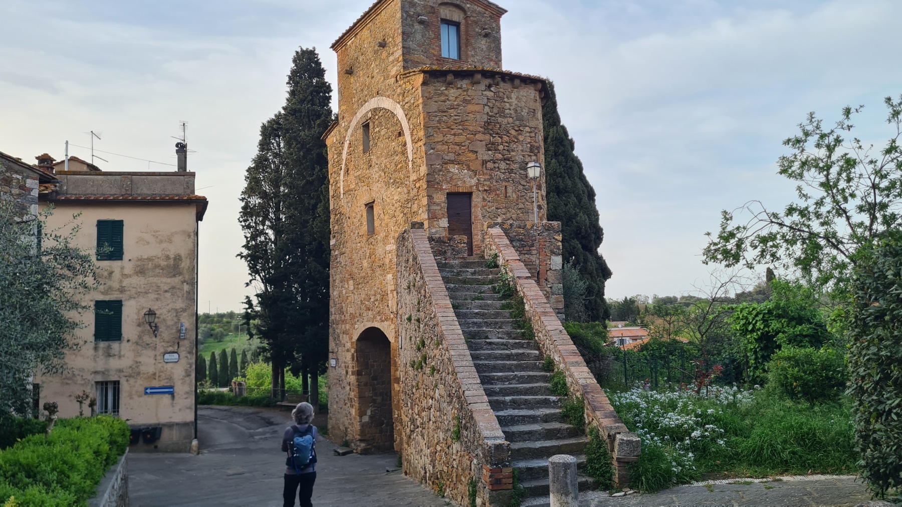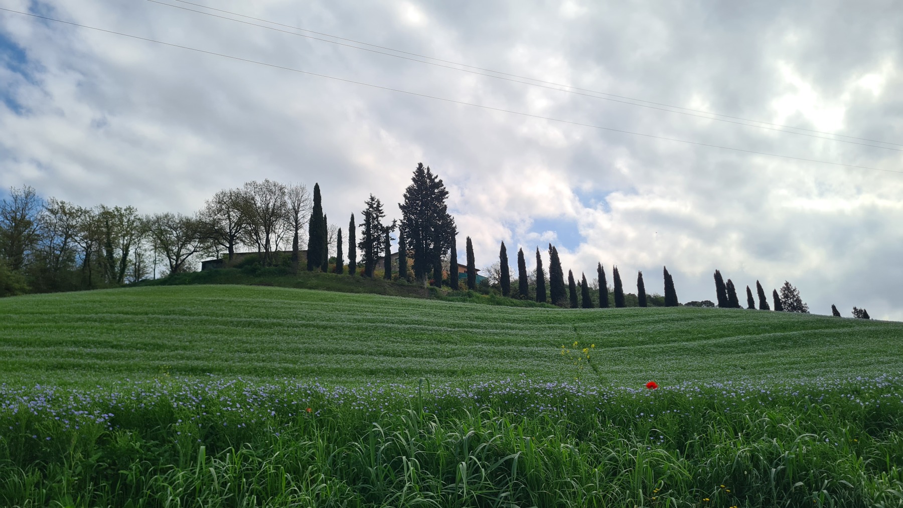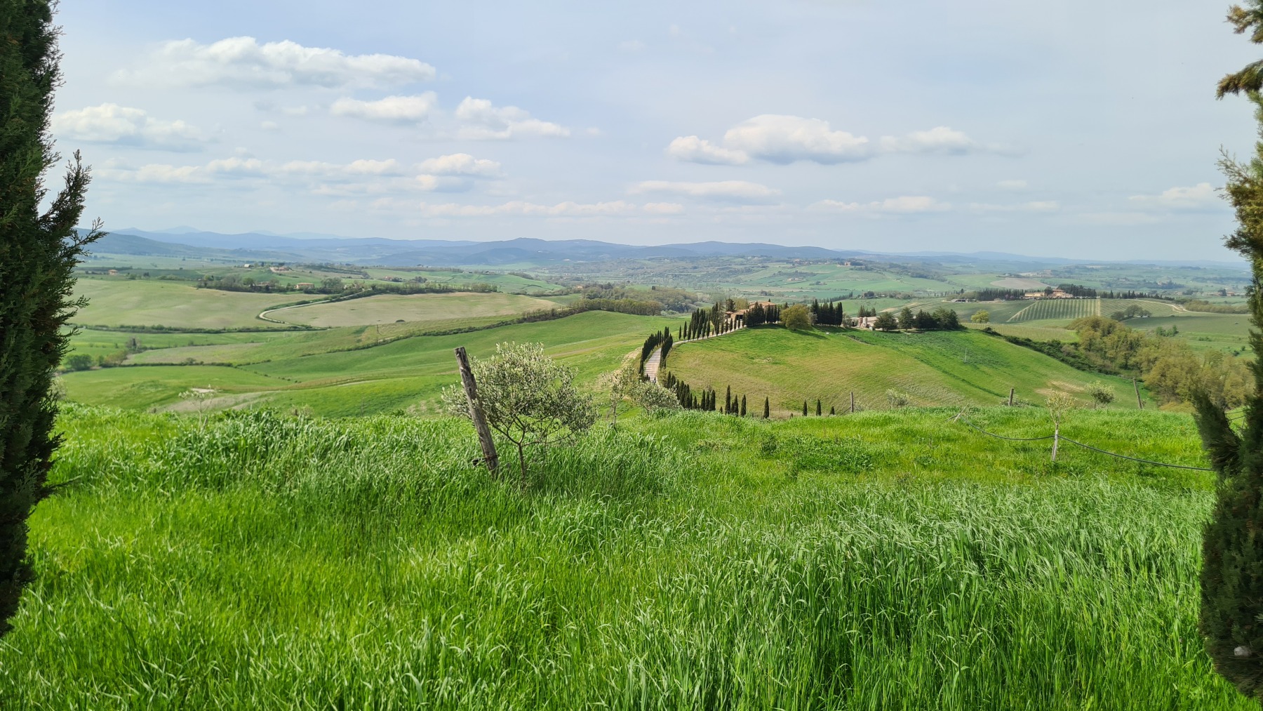 Sur cette étape entre Sienne et San Quirico, la Via Francigena évite la nationale en cheminant dans les collines du Val d’Arbia et du Val d’Orcia ce qui explique ce dénivelé. Les paysages n’en sont que plus beaux mais la progression est rendue plus difficile par le fait que l’itinéraire emprunte beaucoup de pistes gravillonnées et que les pentes sont parfois si raides que le vélo patine et que même en le poussant on dérape facilement. Mon genou apprécie d’ailleurs peu l’exercice de poussée de vélo et j’ai du mettre ma genouillère pour le soulager.