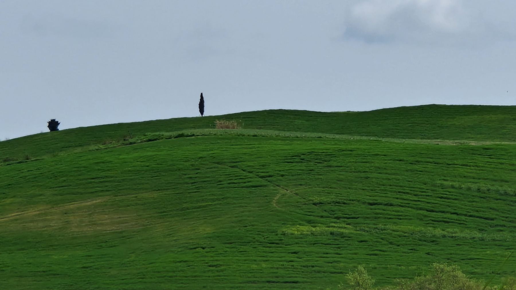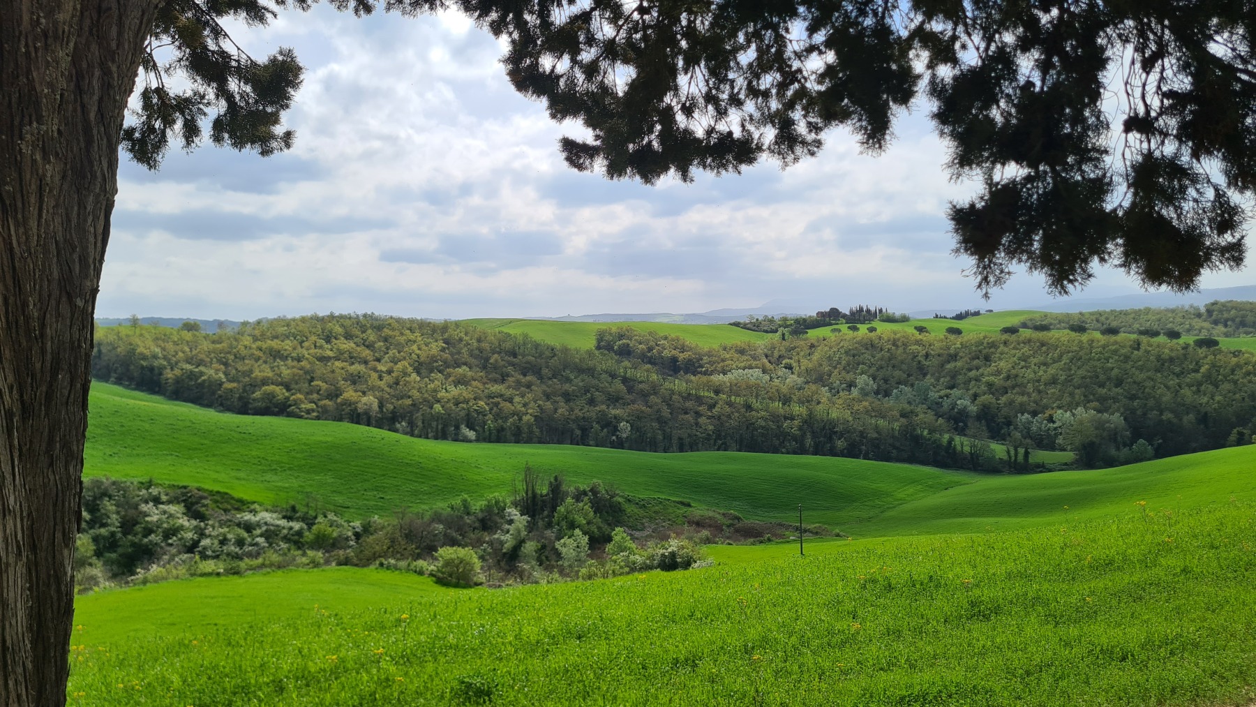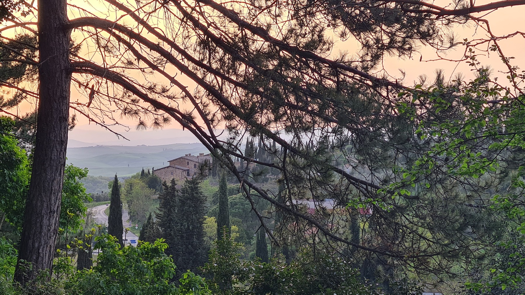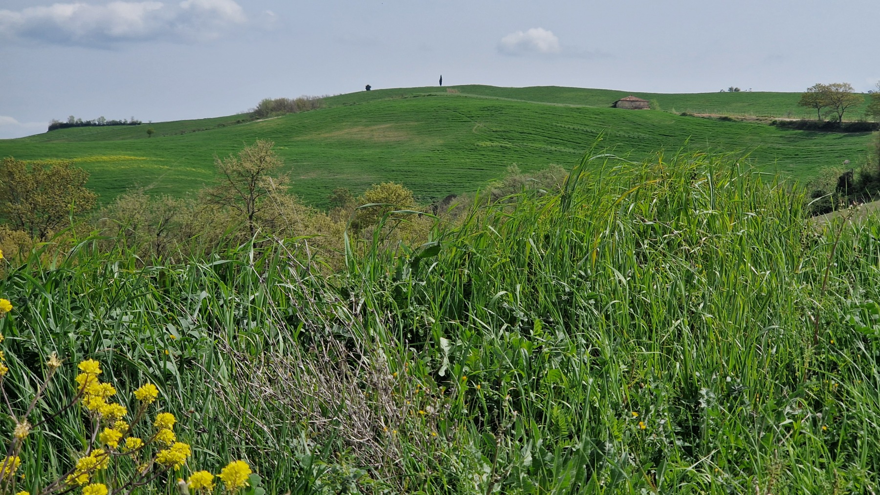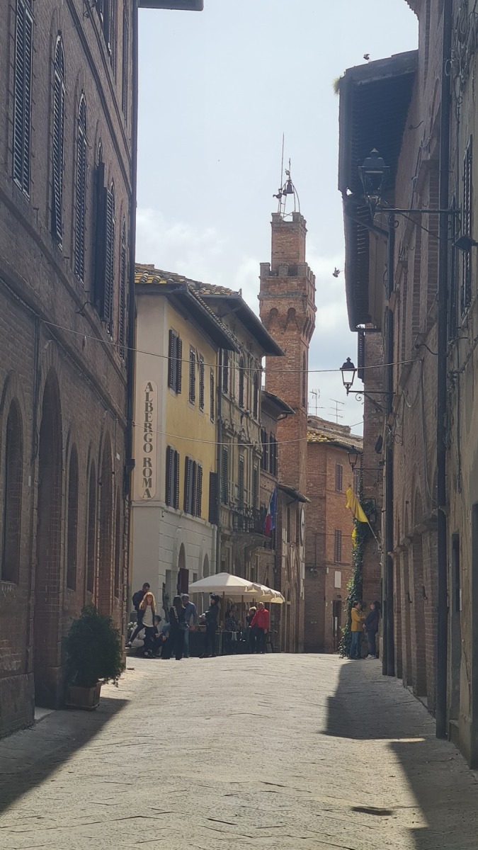 Sur cette étape entre Sienne et San Quirico, la Via Francigena évite la nationale en cheminant dans les collines du Val d’Arbia et du Val d’Orcia ce qui explique ce dénivelé. Les paysages n’en sont que plus beaux mais la progression est rendue plus difficile par le fait que l’itinéraire emprunte beaucoup de pistes gravillonnées et que les pentes sont parfois si raides que le vélo patine et que même en le poussant on dérape facilement. Mon genou apprécie d’ailleurs peu l’exercice de poussée de vélo et j’ai du mettre ma genouillère pour le soulager.