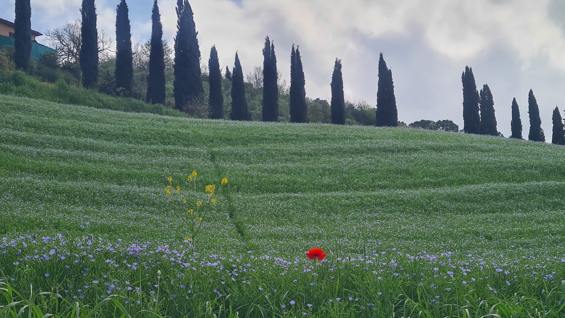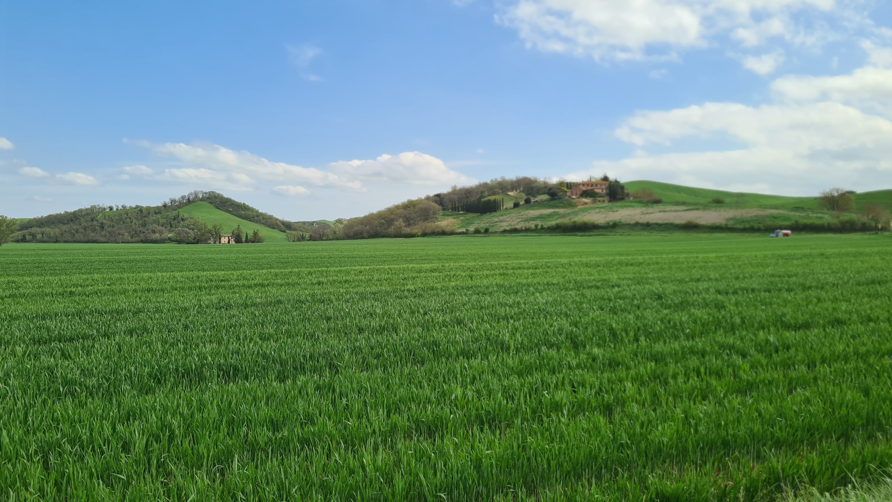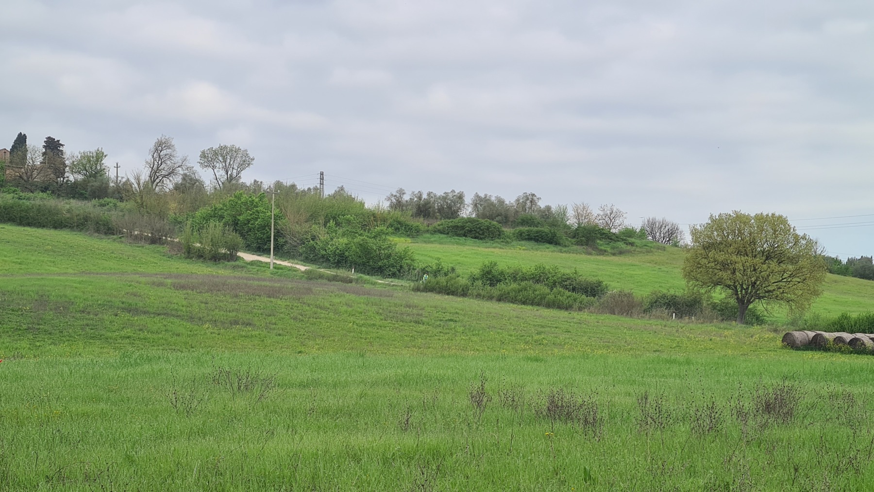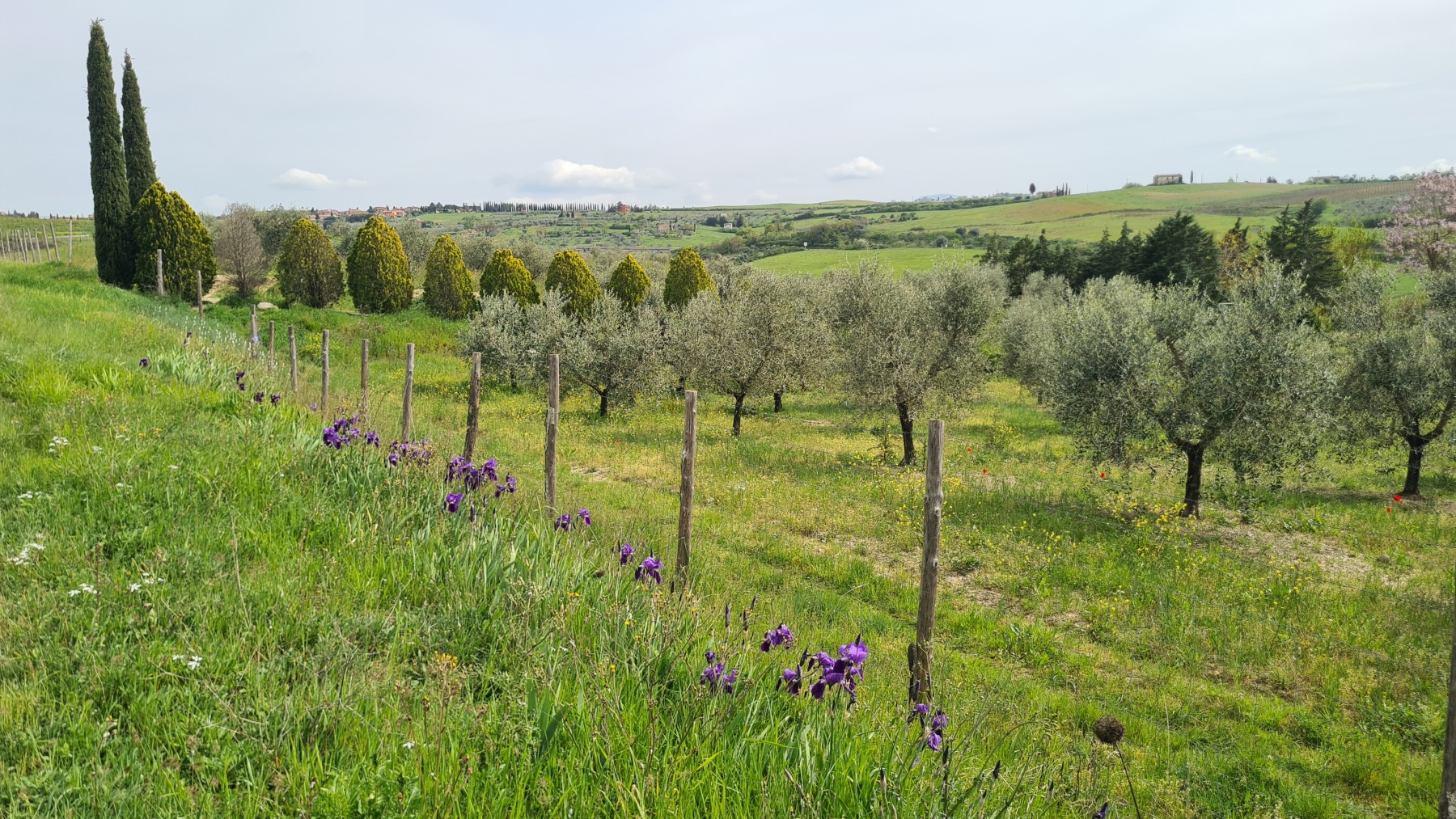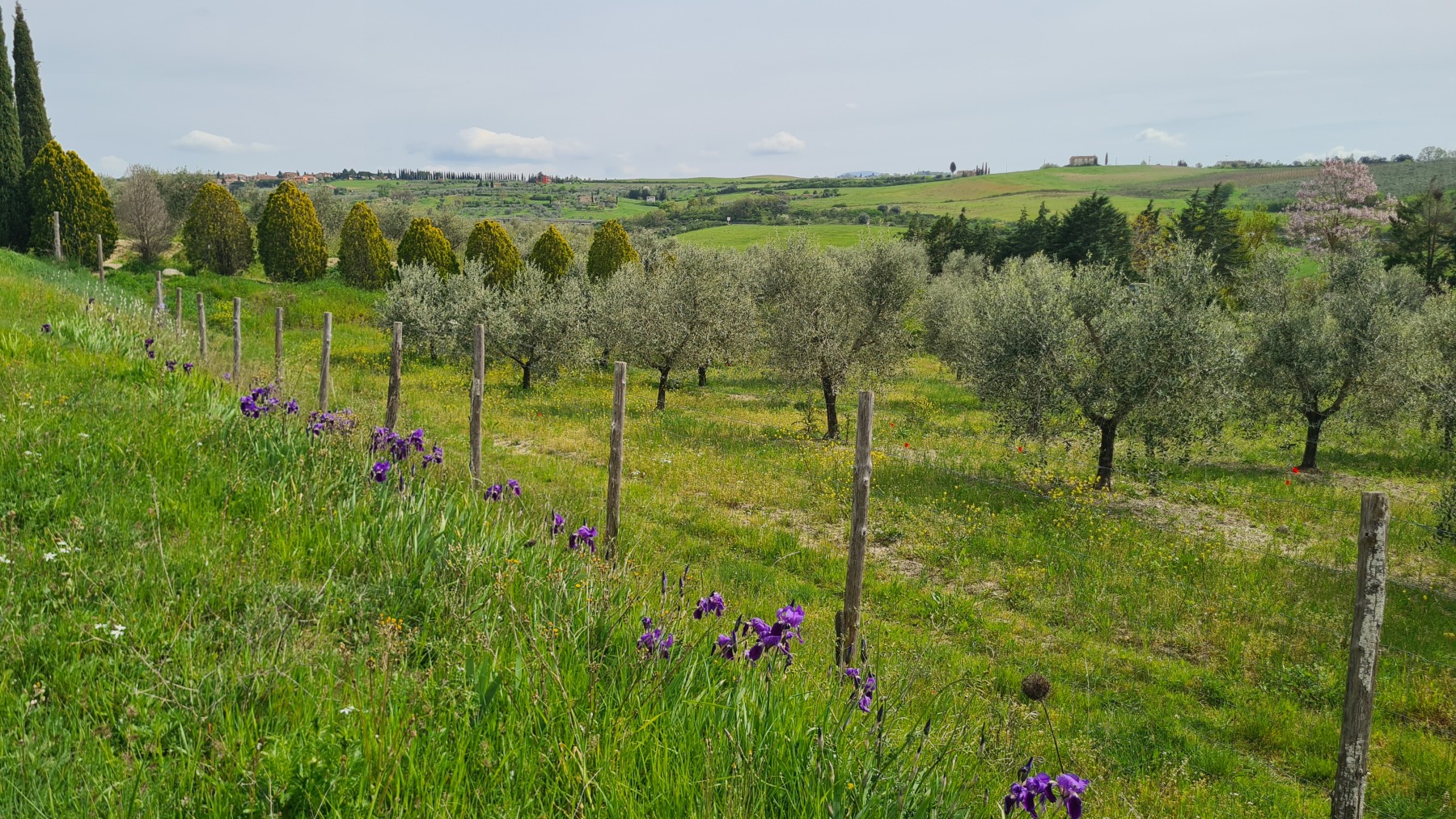 Sur cette étape entre Sienne et San Quirico, la Via Francigena évite la nationale en cheminant dans les collines du Val d’Arbia et du Val d’Orcia ce qui explique ce dénivelé. Les paysages n’en sont que plus beaux mais la progression est rendue plus difficile par le fait que l’itinéraire emprunte beaucoup de pistes gravillonnées et que les pentes sont parfois si raides que le vélo patine et que même en le poussant on dérape facilement. Mon genou apprécie d’ailleurs peu l’exercice de poussée de vélo et j’ai du mettre ma genouillère pour le soulager.
