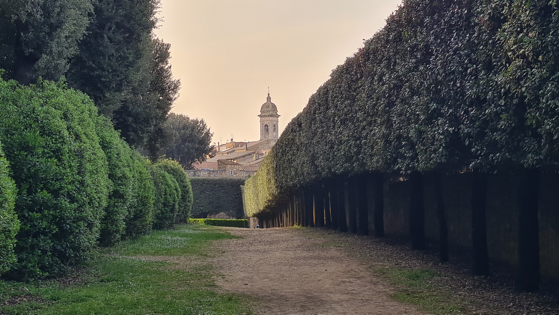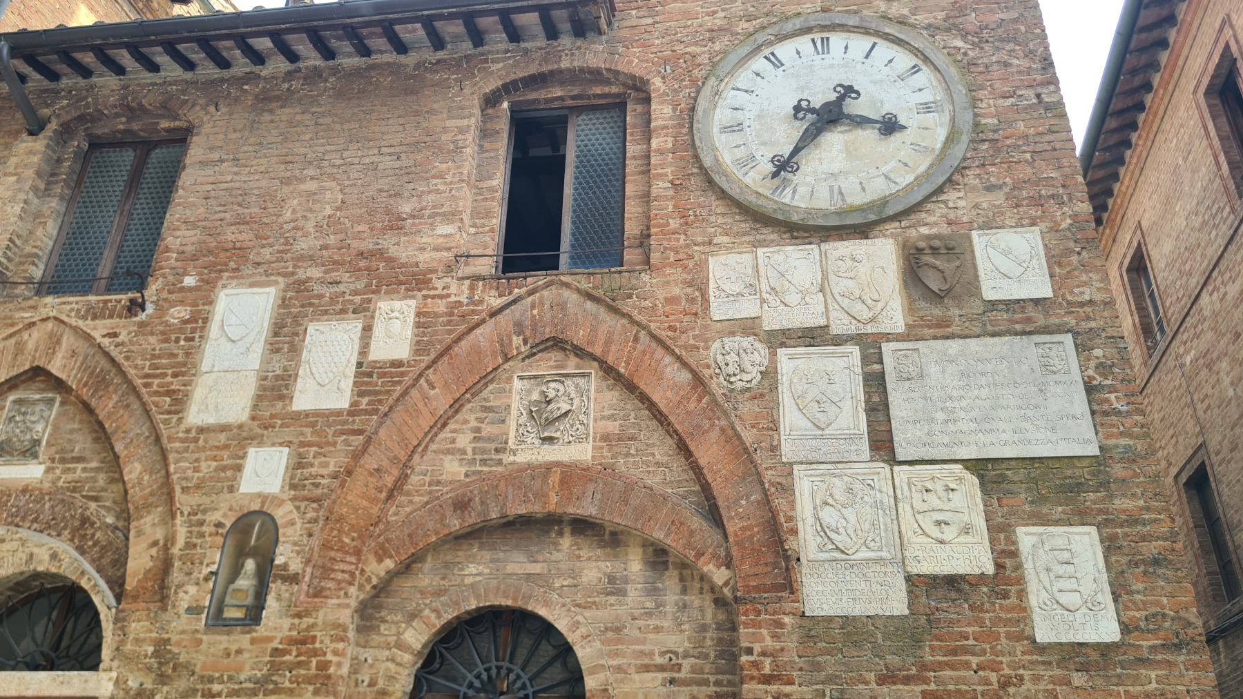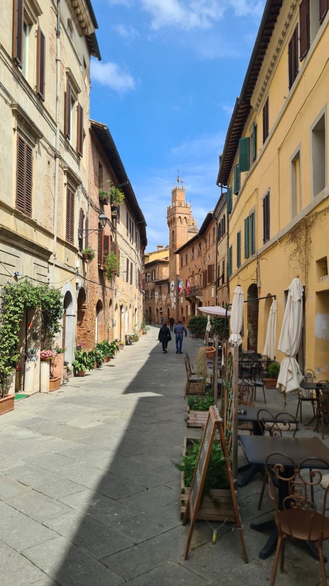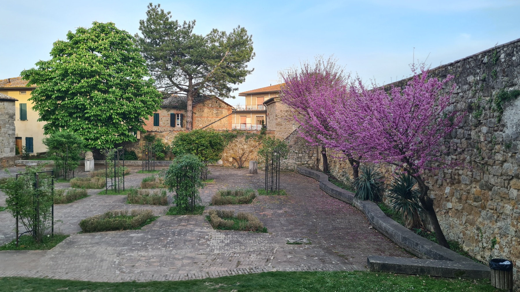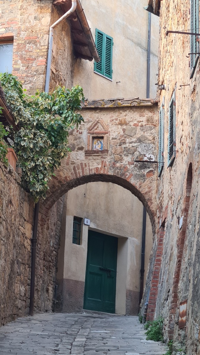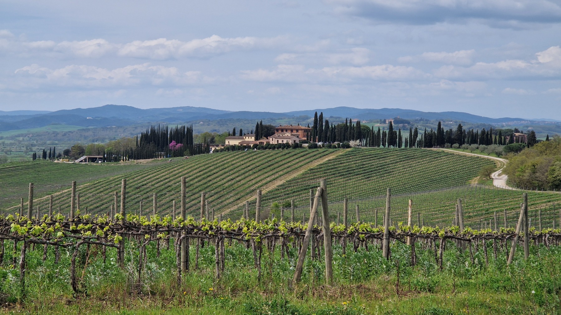 Sur cette étape entre Sienne et San Quirico, la Via Francigena évite la nationale en cheminant dans les collines du Val d’Arbia et du Val d’Orcia ce qui explique ce dénivelé. Les paysages n’en sont que plus beaux mais la progression est rendue plus difficile par le fait que l’itinéraire emprunte beaucoup de pistes gravillonnées et que les pentes sont parfois si raides que le vélo patine et que même en le poussant on dérape facilement. Mon genou apprécie d’ailleurs peu l’exercice de poussée de vélo et j’ai du mettre ma genouillère pour le soulager.