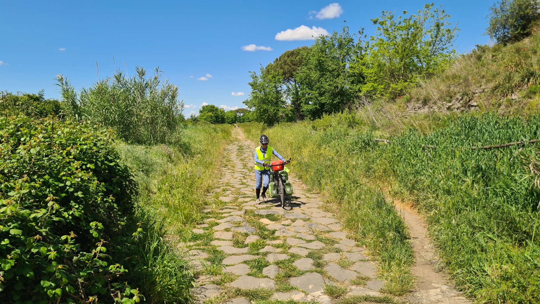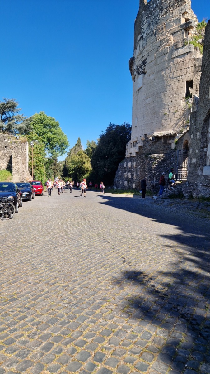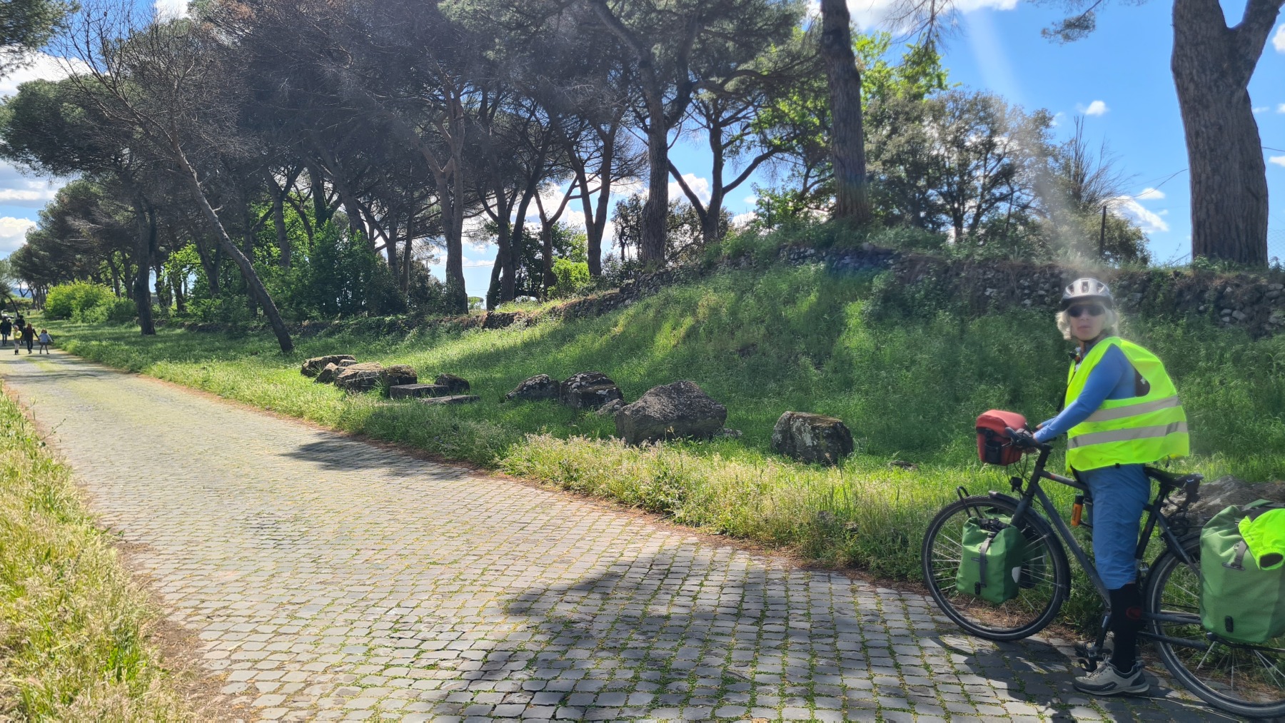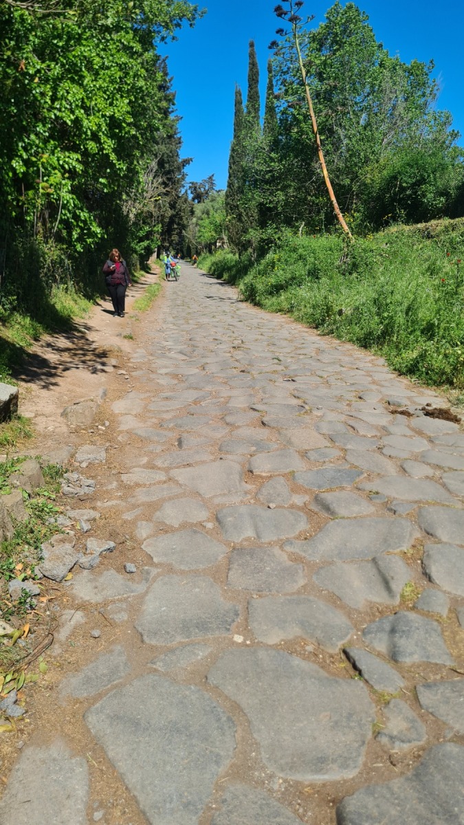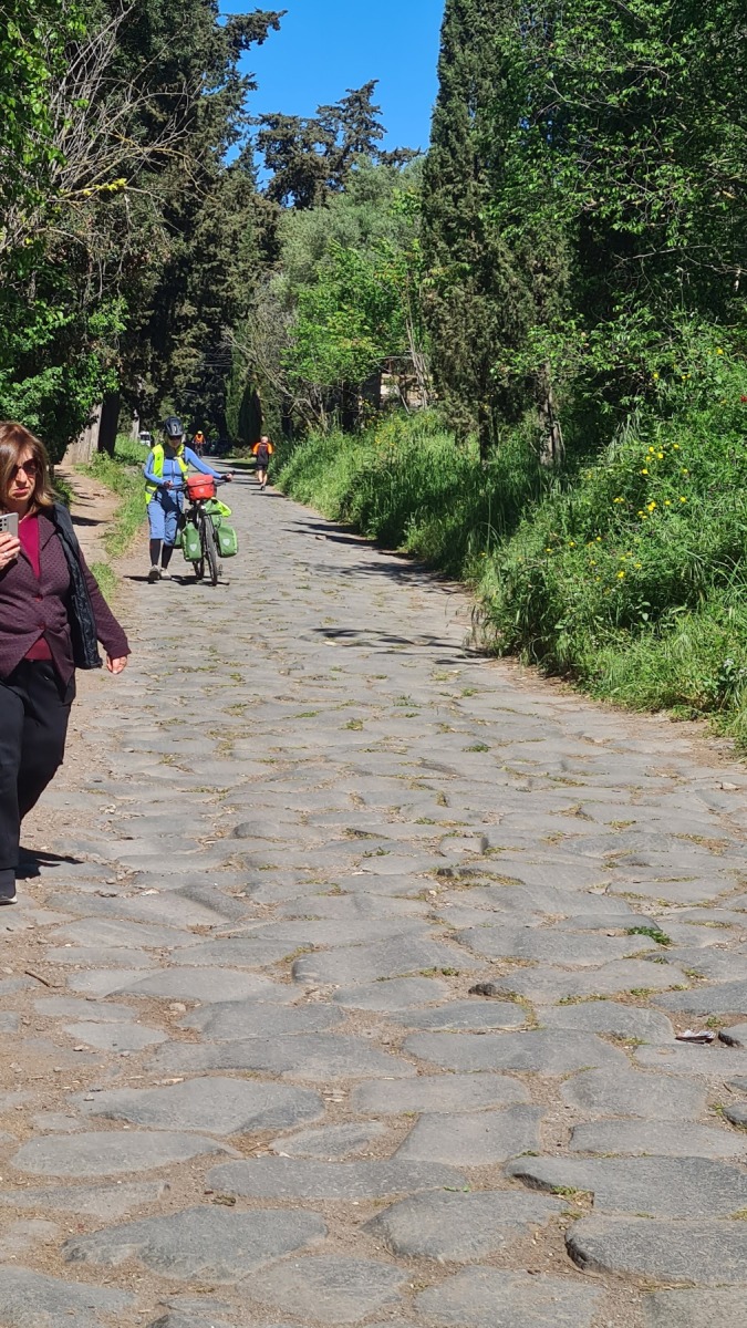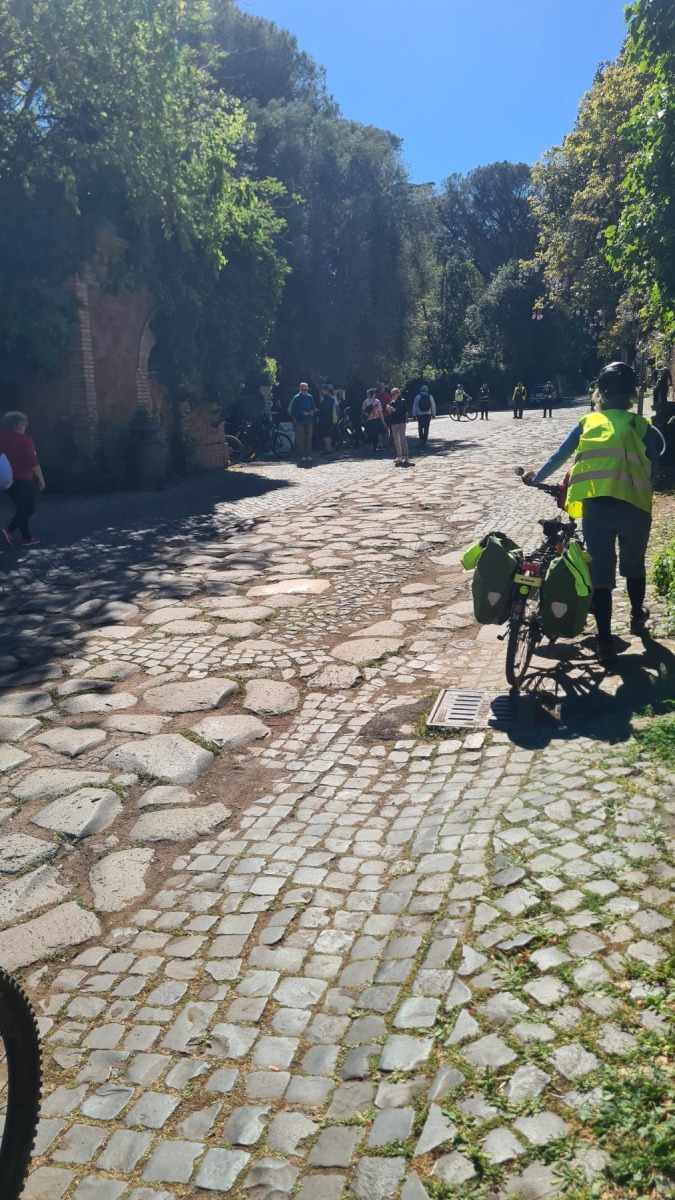 Nous avions déjà fait l’expérience des dalles de basalte bombées qui recouvraient les voies romaines et savions que la Voie Appienne ne serait pas de tout confort avec nos vélos et nous avions prévue l’étape en conséquence. Nous étions aussi rassurés de quitter Rome un dimanche, jour où il devrait y avoir moins de circulation qu’en semaine. Ce que nous n’avions pas prévu en revanche c’est que le 21 avril était le jour de l’Appia Run 2024 et que nous ne serions pas seuls sur les premiers kilomètres de la Via Appienne ! Après un peu de négociation nous avons tout de même pu nous mêler aux participants et passer avec nos vélos…