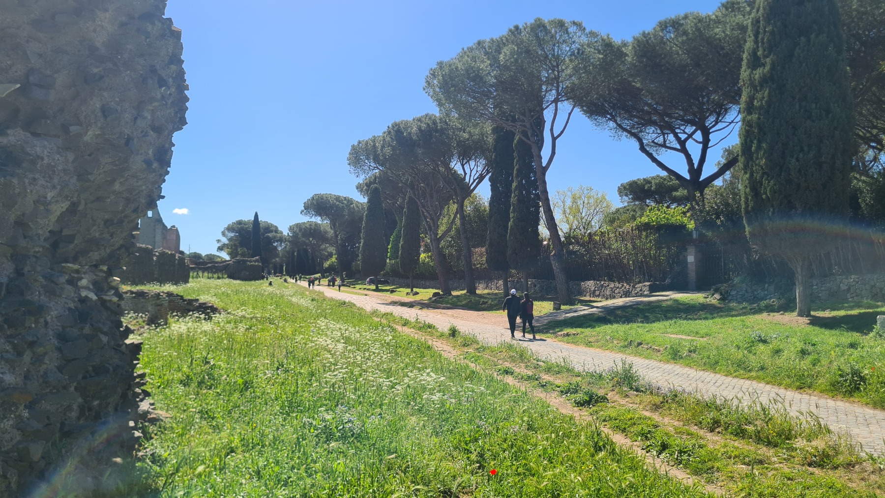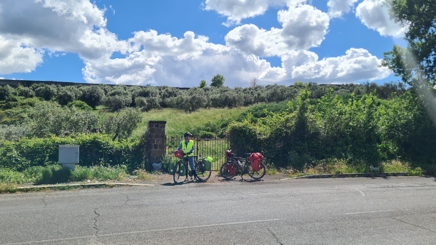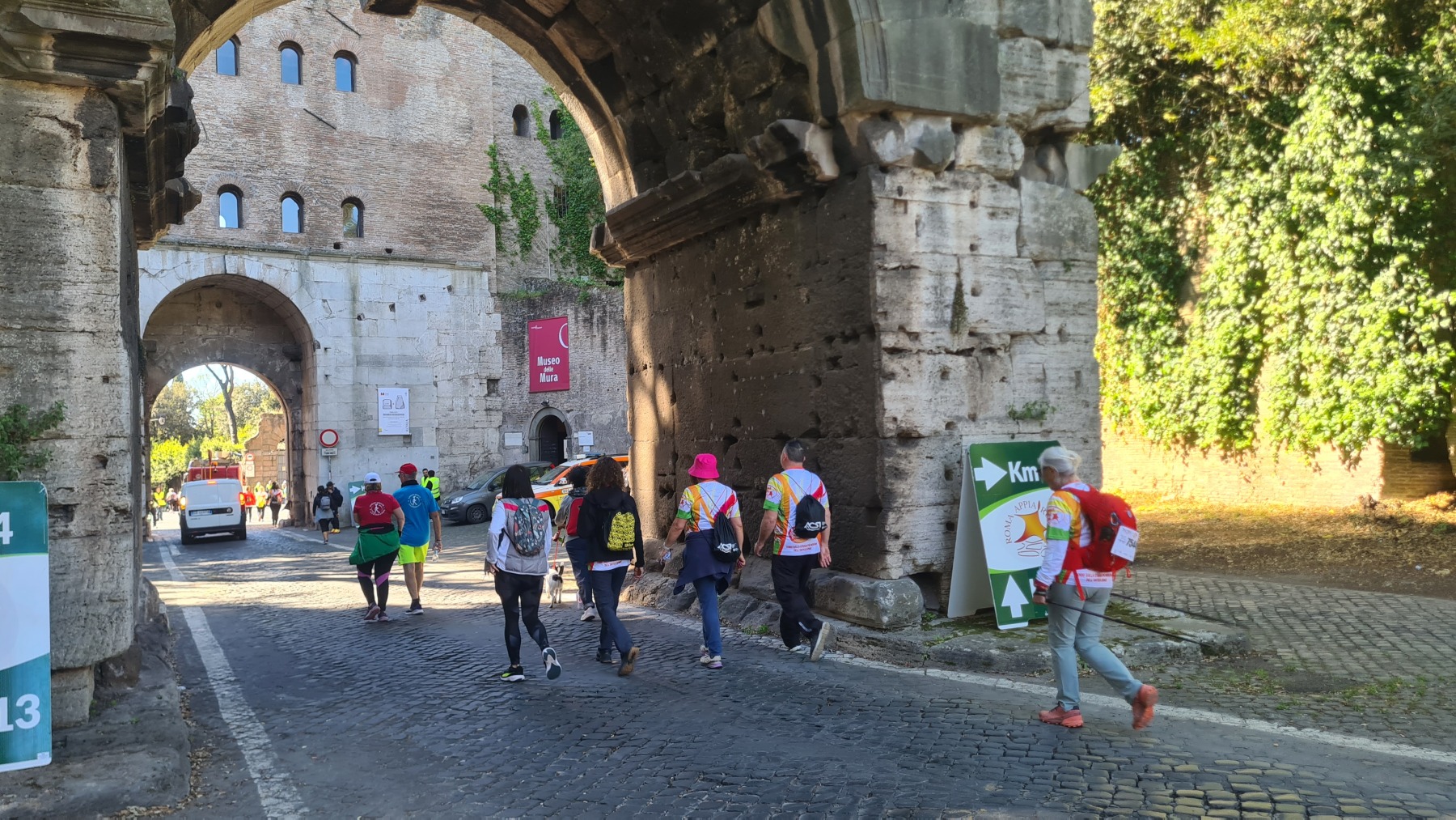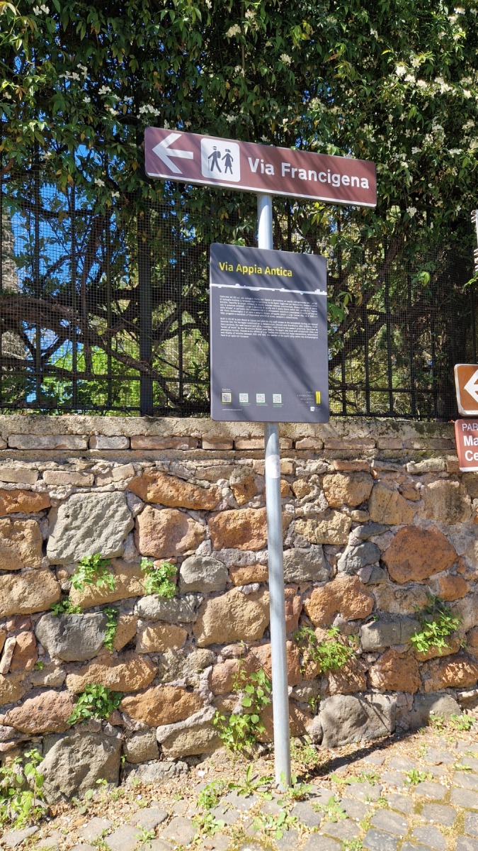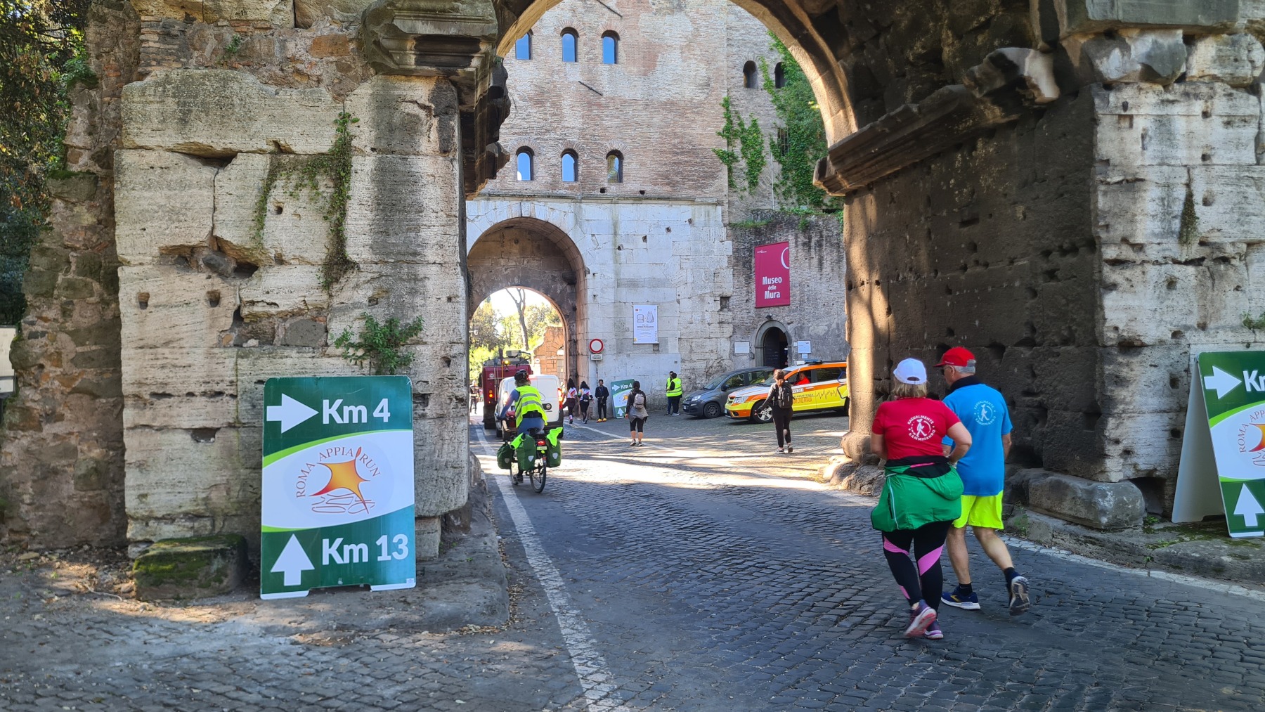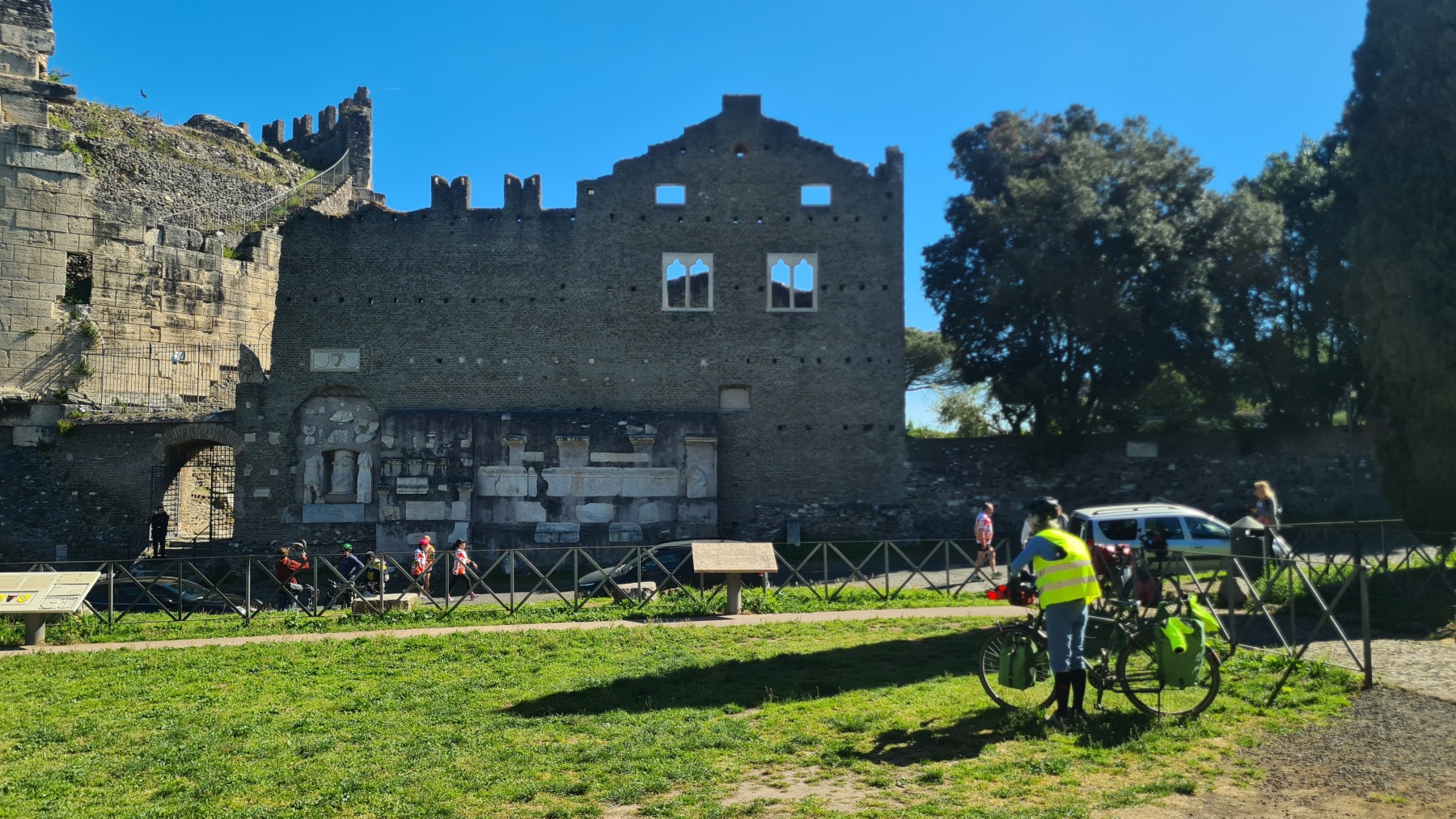 Nous avions déjà fait l’expérience des dalles de basalte bombées qui recouvraient les voies romaines et savions que la Voie Appienne ne serait pas de tout confort avec nos vélos et nous avions prévue l’étape en conséquence. Nous étions aussi rassurés de quitter Rome un dimanche, jour où il devrait y avoir moins de circulation qu’en semaine. Ce que nous n’avions pas prévu en revanche c’est que le 21 avril était le jour de l’Appia Run 2024 et que nous ne serions pas seuls sur les premiers kilomètres de la Via Appienne ! Après un peu de négociation nous avons tout de même pu nous mêler aux participants et passer avec nos vélos…