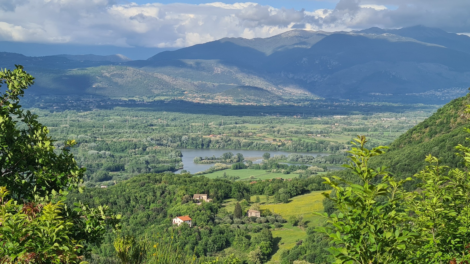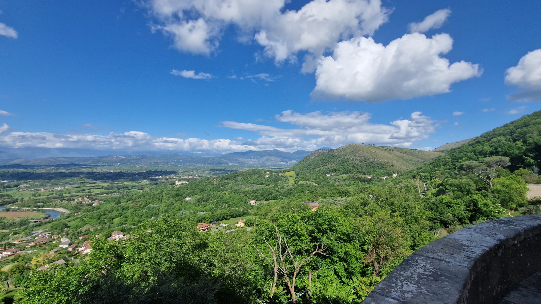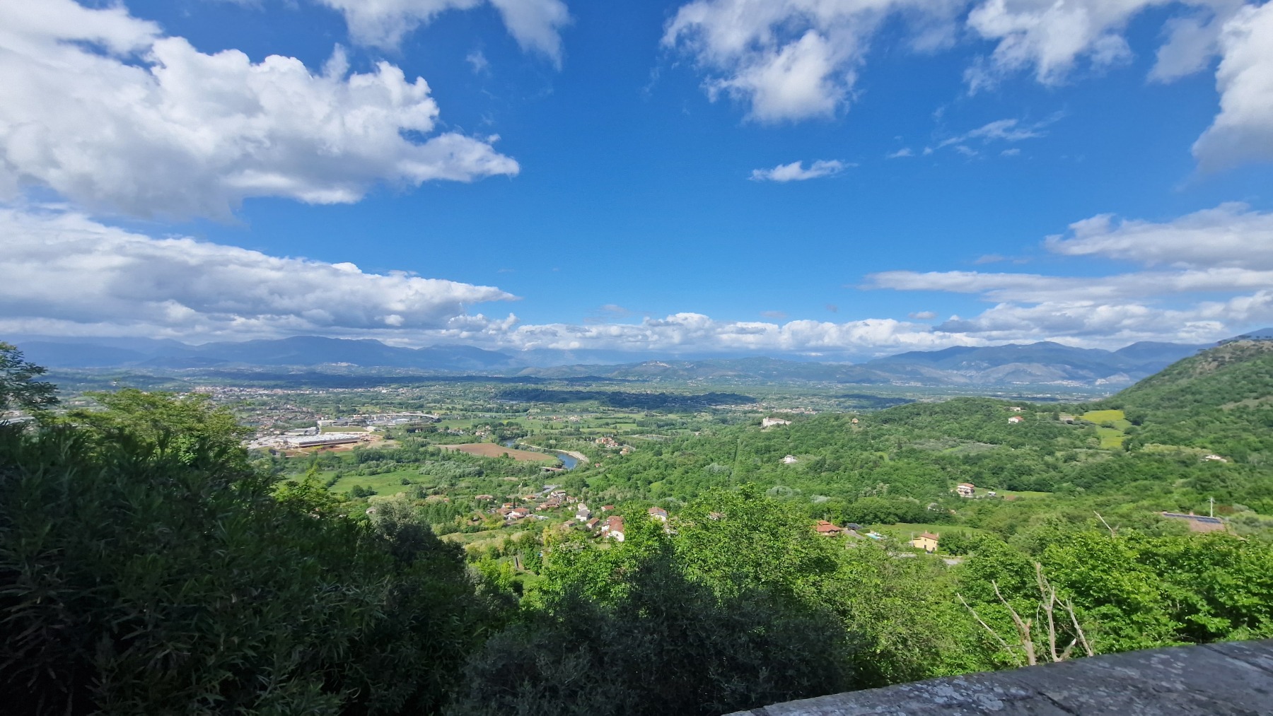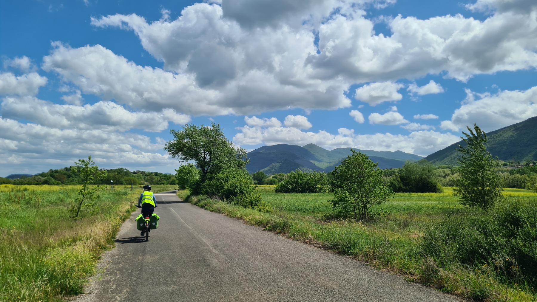 Après nous avoir fait grimper sur les contreforts des Apennins pour dormir à Fiuggi, Eurovelo 5 nous a fait redescendre dans la grande vallée du Sacco puis du Liri. C’est une vallée très large, appelée aussi Vallée Latine, avec de belles vues sur les sommets enneigés des Apennins et la chaine moins imposante des Monts Lépins qui nous sépare de la mer mais aussi des paysages moins bucoliques puisque la vallée est une voie de communication importante entre Rome et Naples.