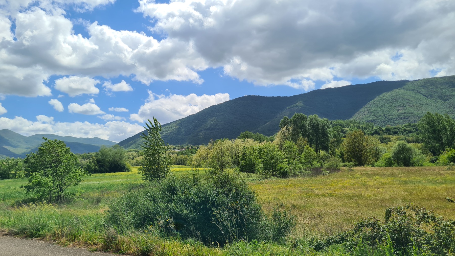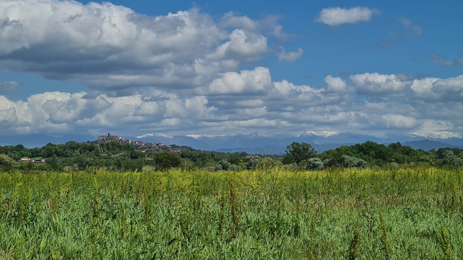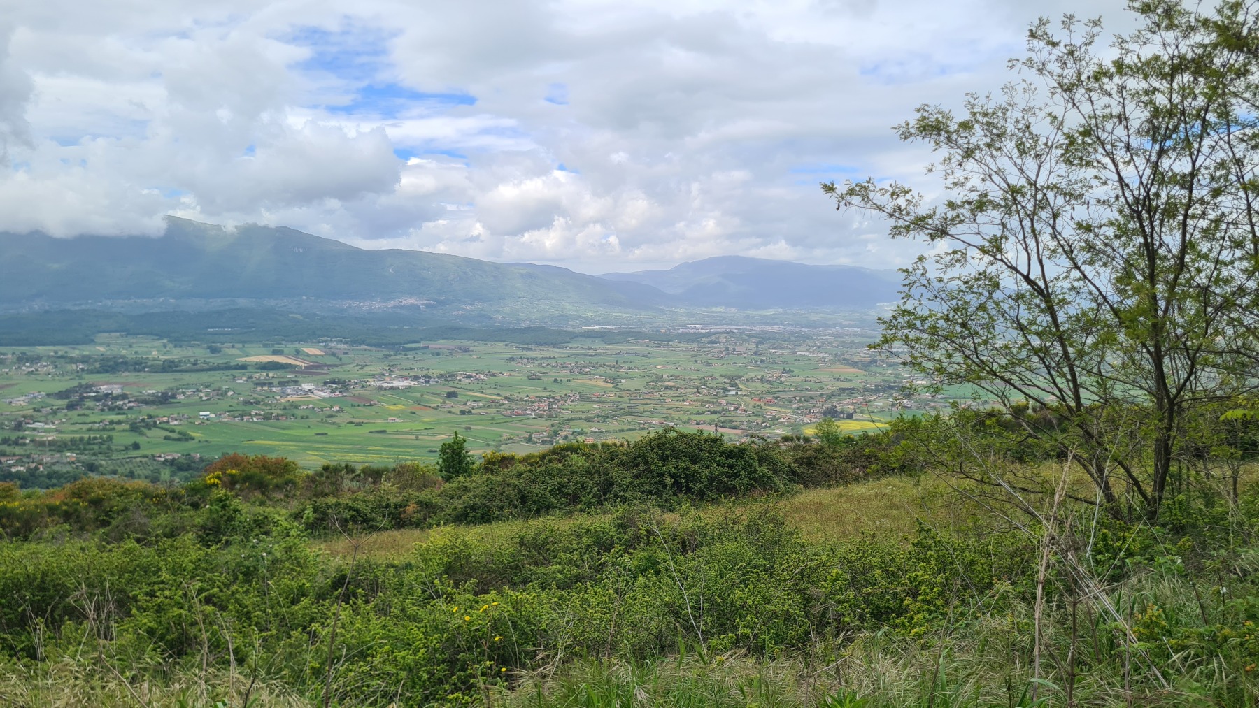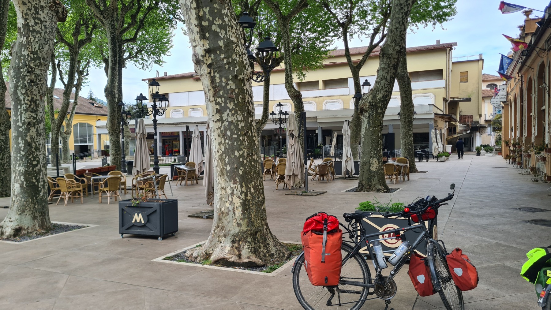 Après nous avoir fait grimper sur les contreforts des Apennins pour dormir à Fiuggi, Eurovelo 5 nous a fait redescendre dans la grande vallée du Sacco puis du Liri. C’est une vallée très large, appelée aussi Vallée Latine, avec de belles vues sur les sommets enneigés des Apennins et la chaine moins imposante des Monts Lépins qui nous sépare de la mer mais aussi des paysages moins bucoliques puisque la vallée est une voie de communication importante entre Rome et Naples.