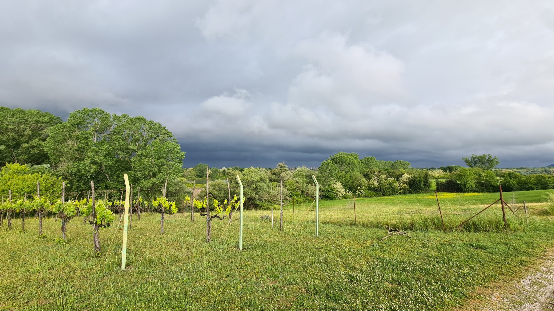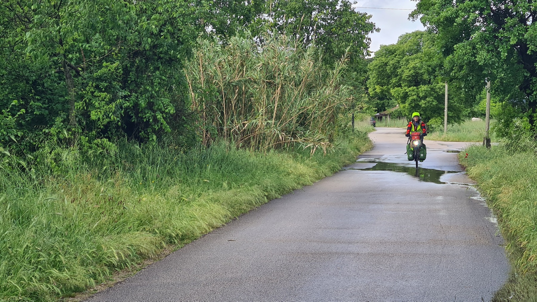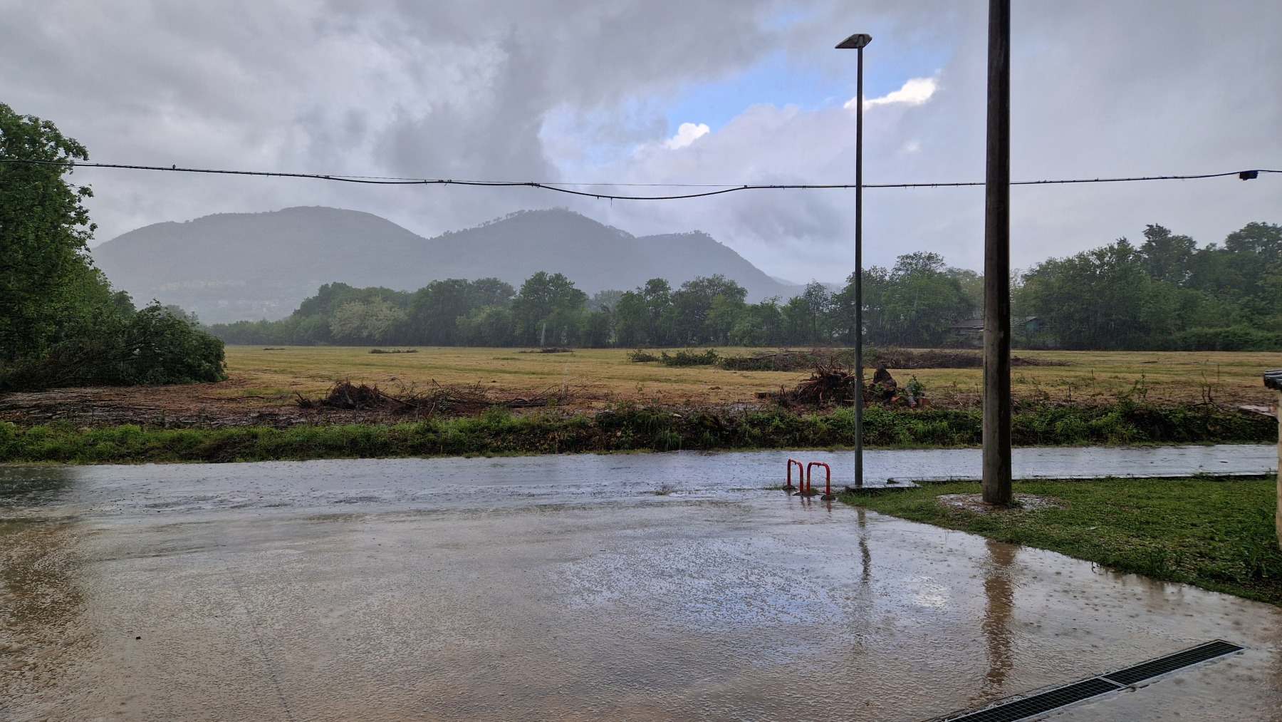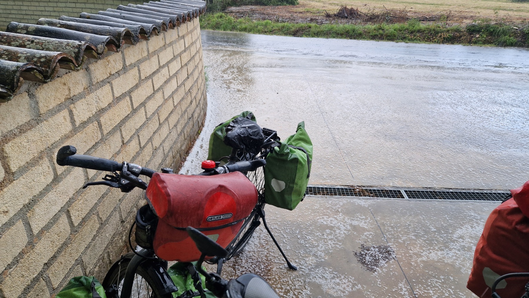 Il faisait beau quand nous nous sommes levés mais le ciel était déjà bien sombre quand nous avons quitté Falvaterra et nous n’avons pas tardé à être rejoints par l’orage. Nous avons pu nous abriter sous le porche qui protégeait le visiophone d’une villa pour mettre nos vêtements de pluie et la grêle s’est mise à tomber.