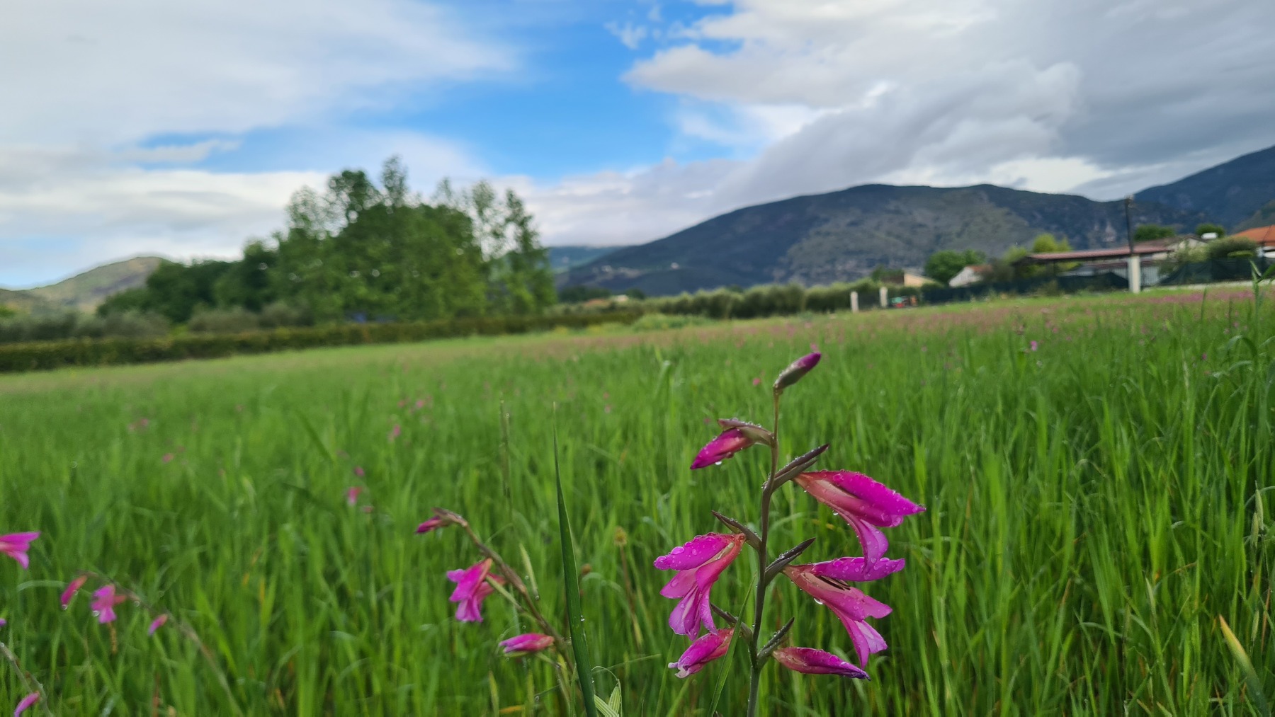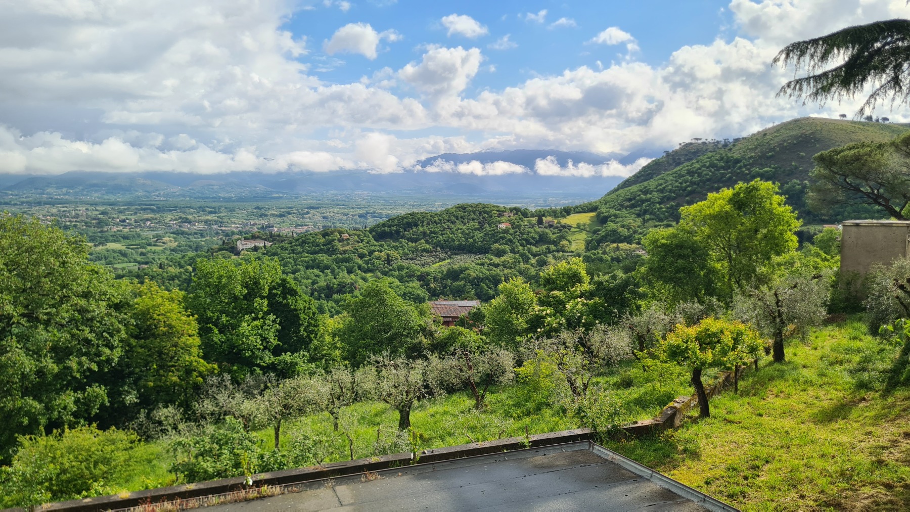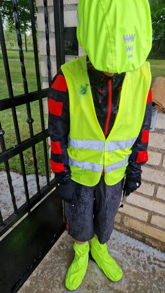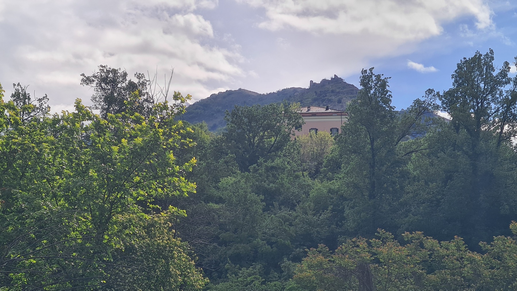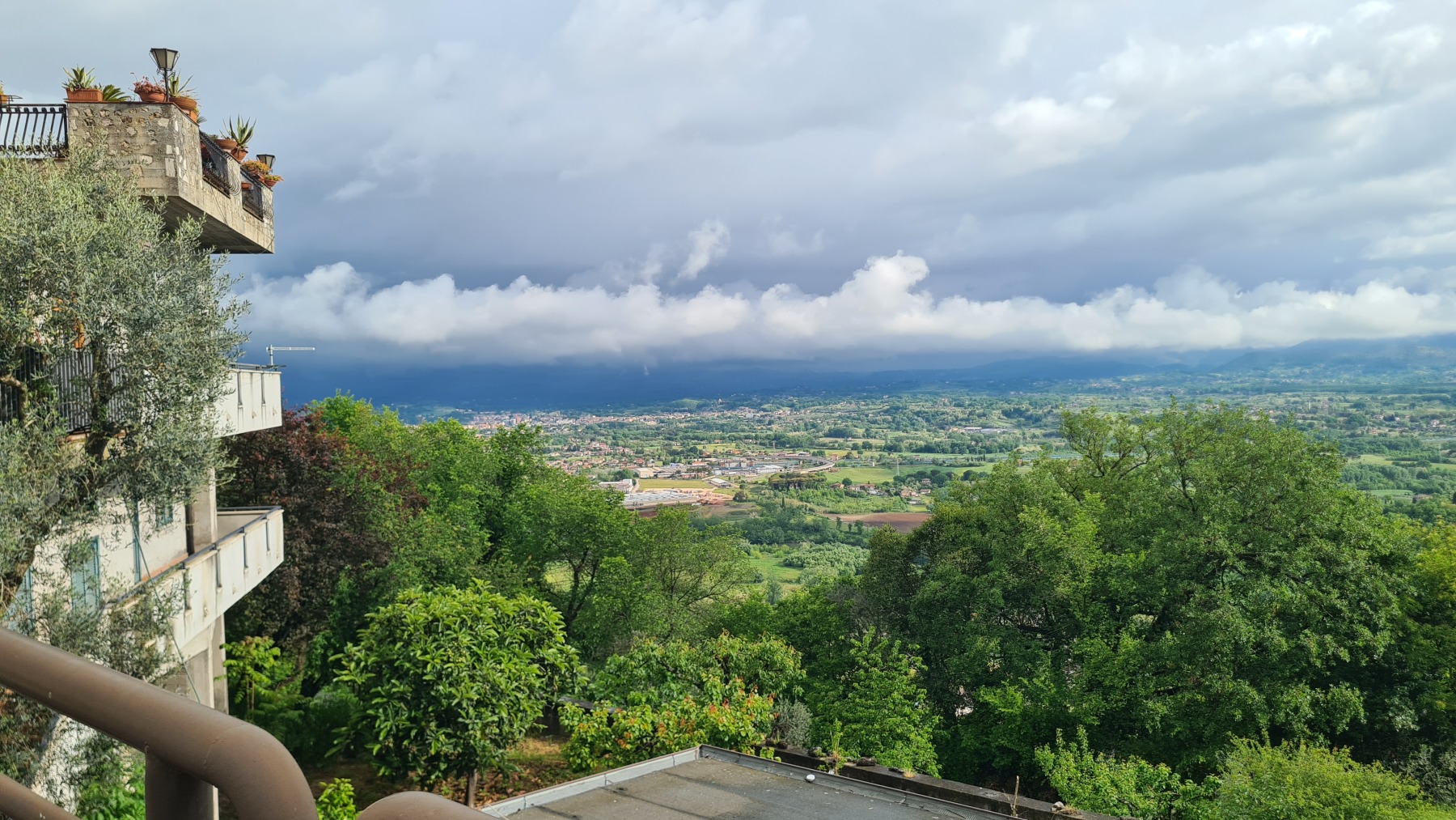 Il faisait beau quand nous nous sommes levés mais le ciel était déjà bien sombre quand nous avons quitté Falvaterra et nous n’avons pas tardé à être rejoints par l’orage. Nous avons pu nous abriter sous le porche qui protégeait le visiophone d’une villa pour mettre nos vêtements de pluie et la grêle s’est mise à tomber.