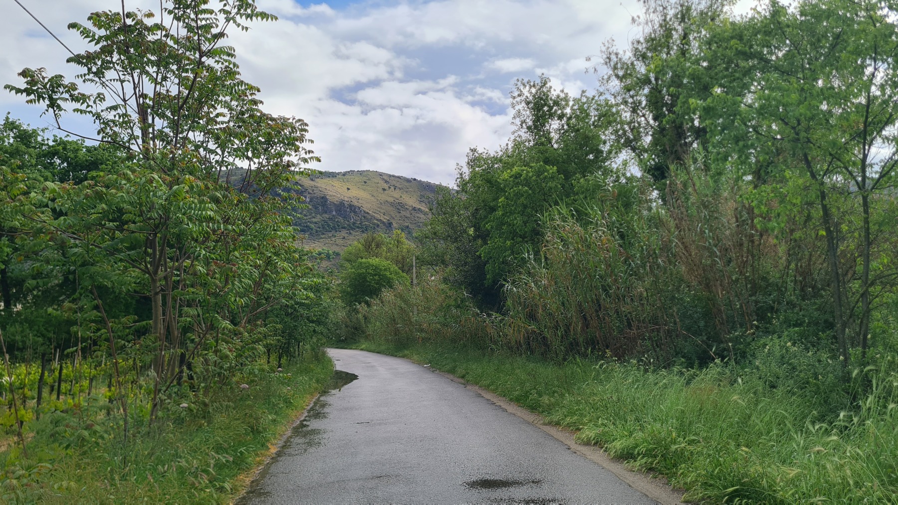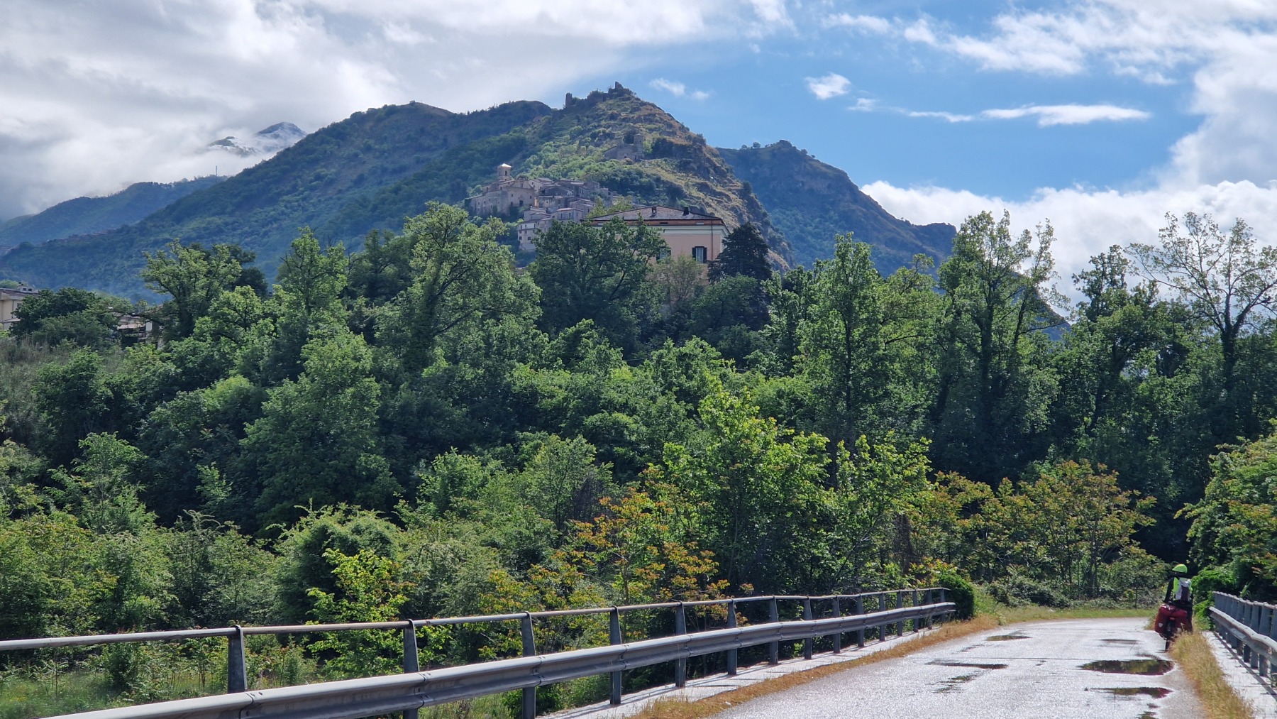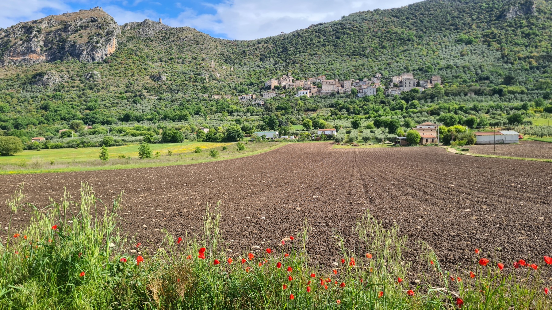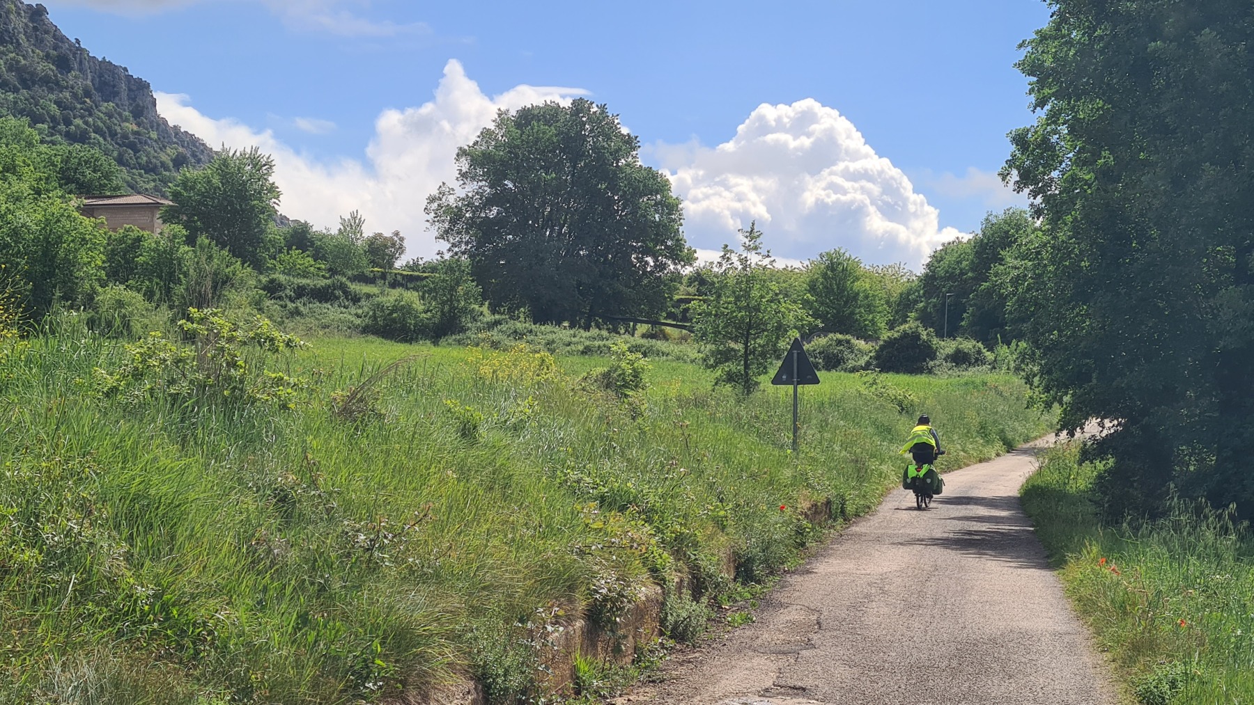 Cela n’a pas duré bien longtemps et nous sommes repartis. Eurovelo 5 nous a fait traverser la vallée jusqu’à Roccasecca (qui méritait mal son nom aujourd’hui) et nous suivi les contreforts des Apennins jusqu’à Cassino, terme de notre étape, que nous avons atteint avant le déjeuner.