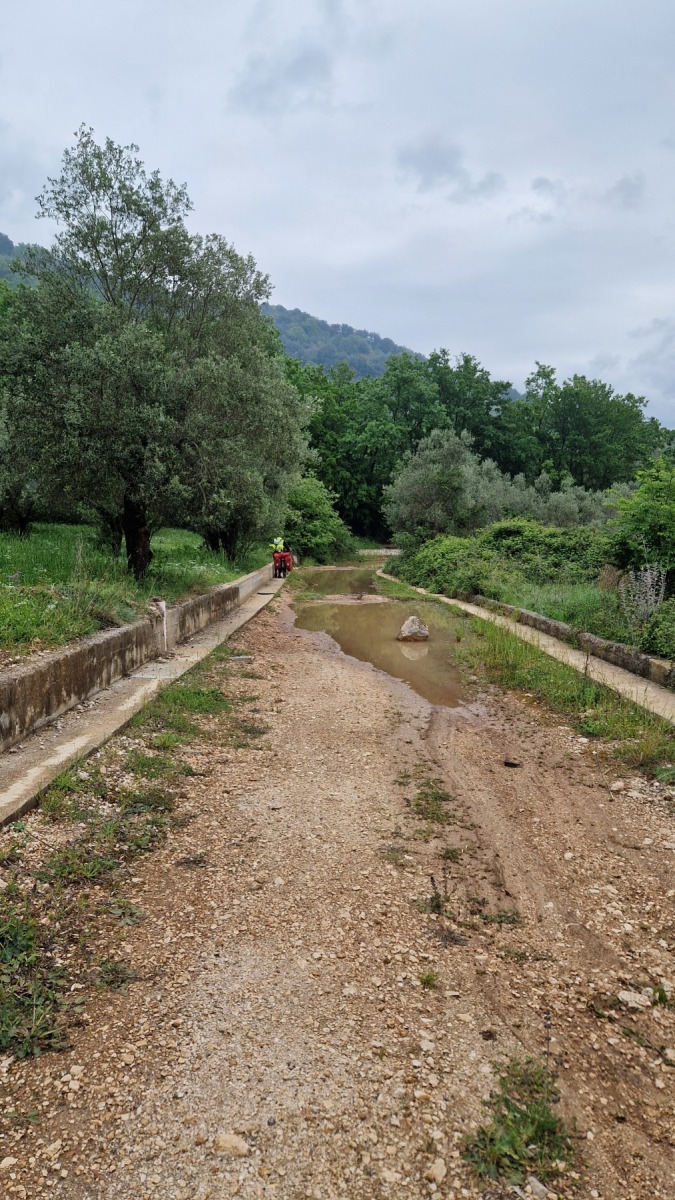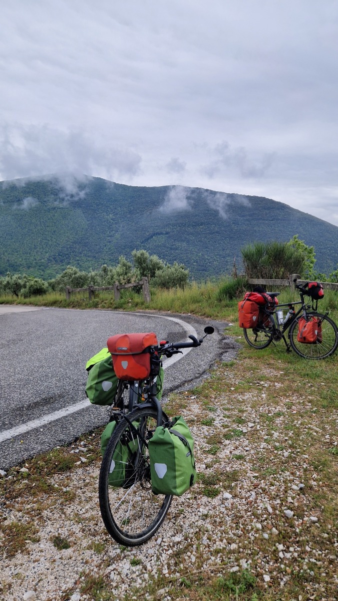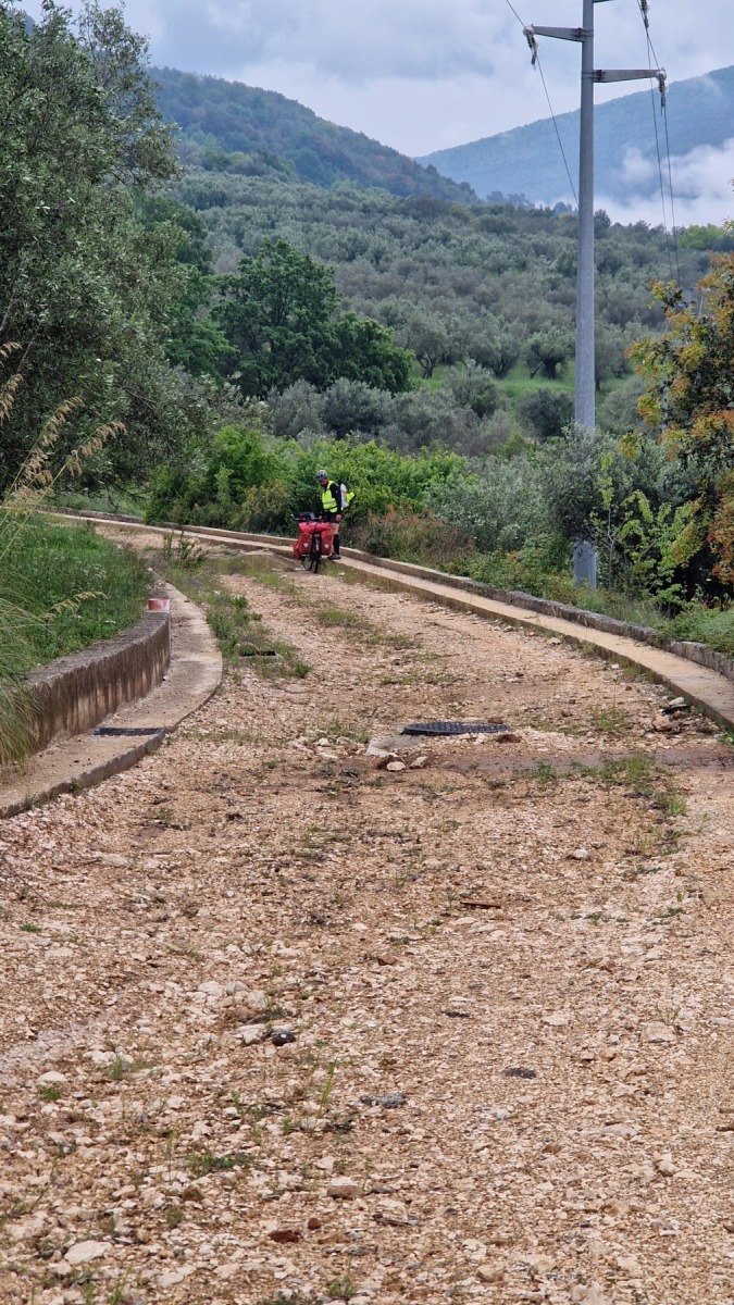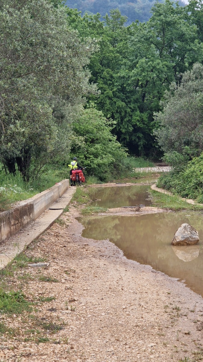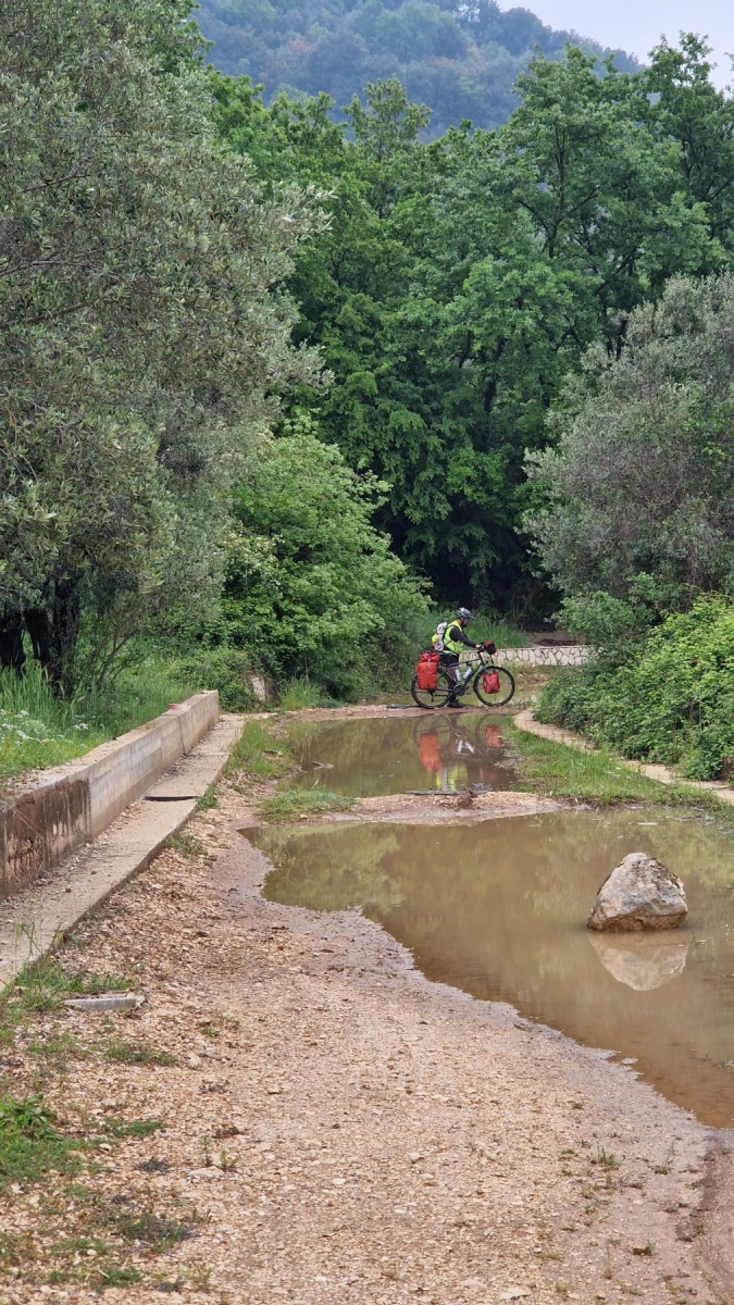 Peu de galère sur l’Eurovelo 5 aujourd’hui, à part un passage d’un petit kilomètre sur un chemin officiellement fermé et détrempé où on du pousser les vélos.