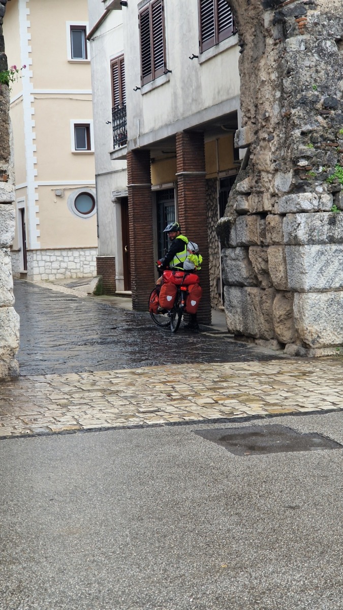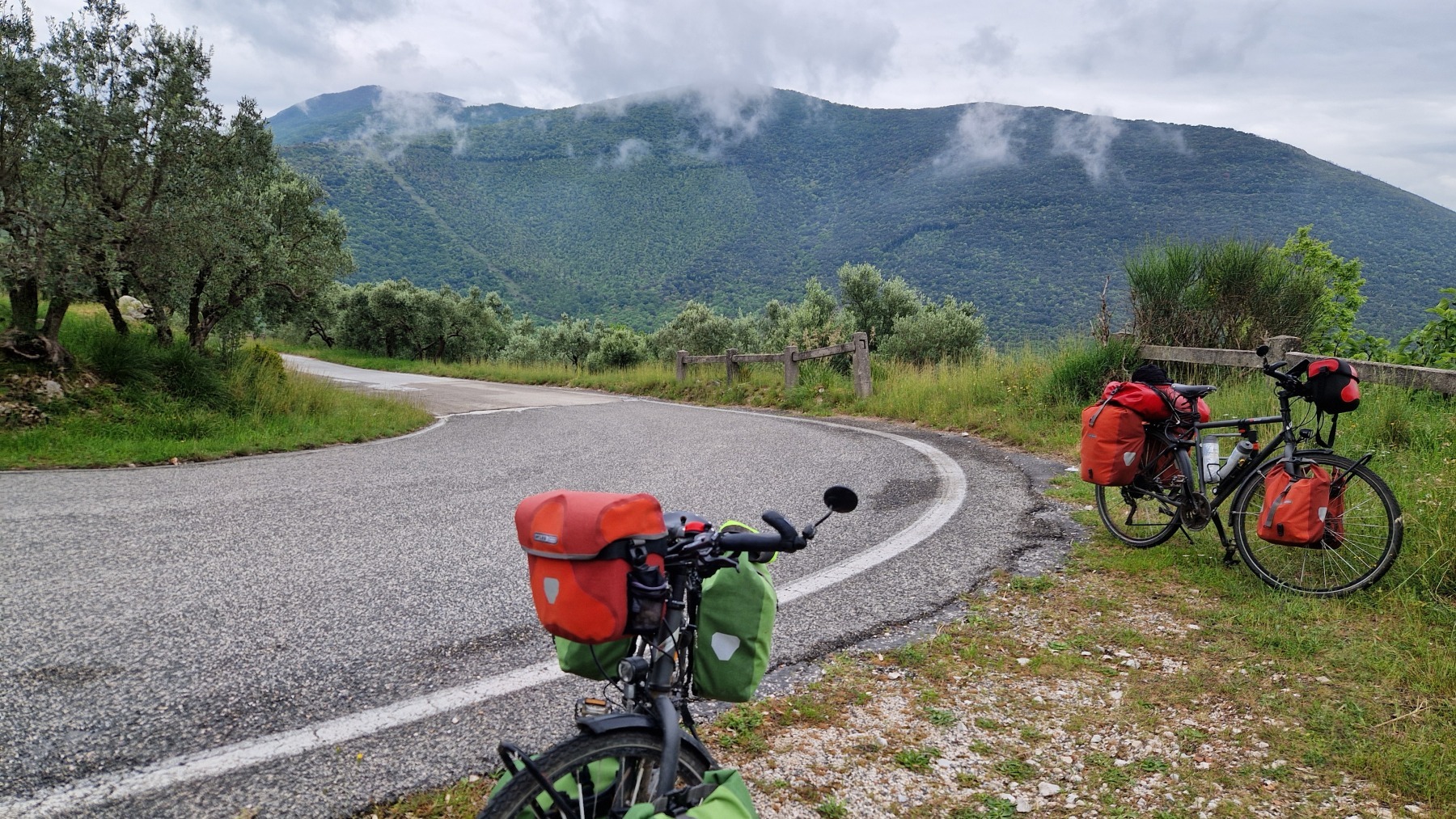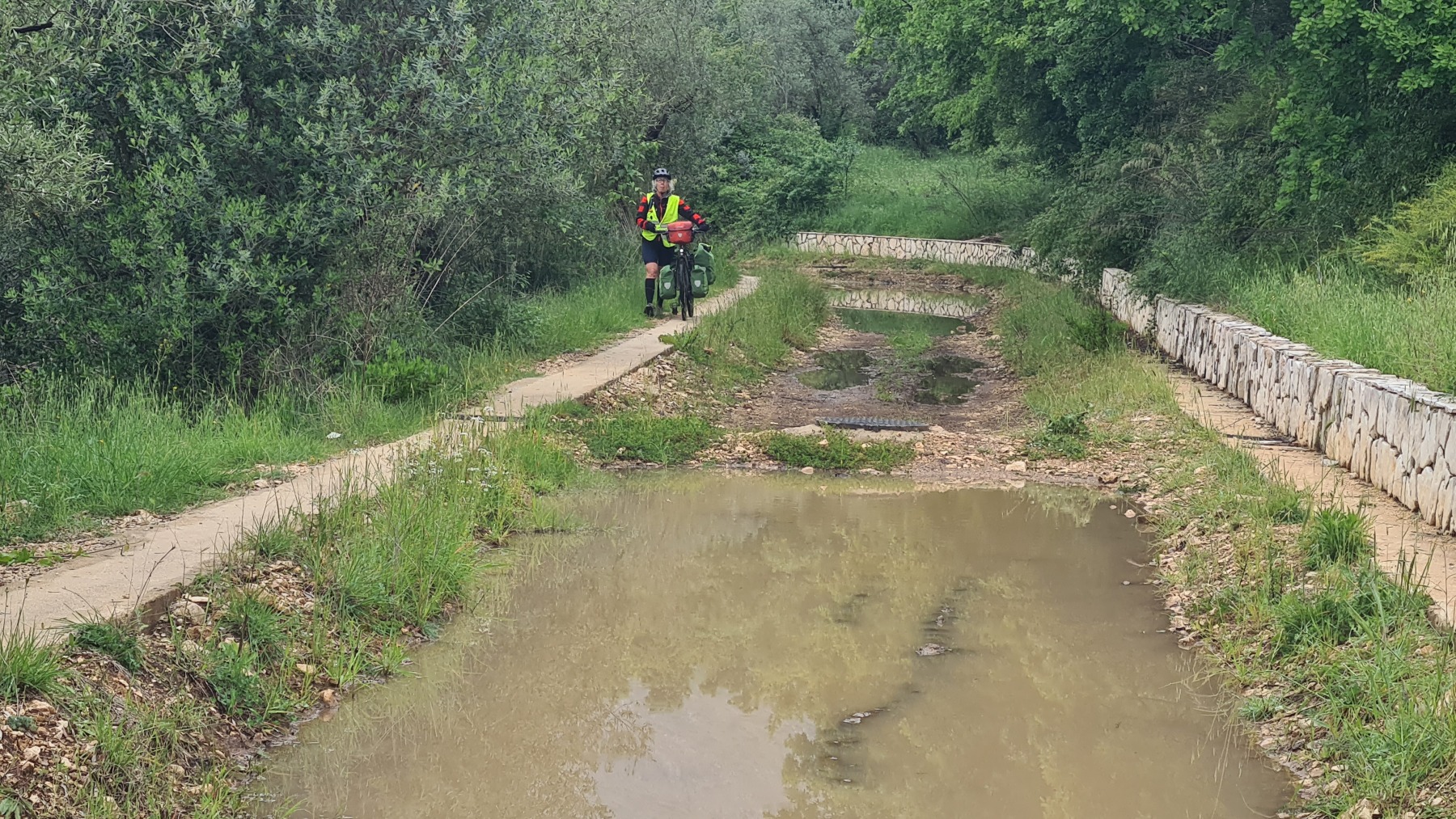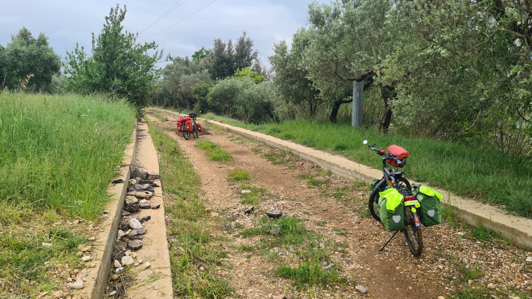 Peu de galère sur l’Eurovelo 5 aujourd’hui, à part un passage d’un petit kilomètre sur un chemin officiellement fermé et détrempé où on du pousser les vélos.