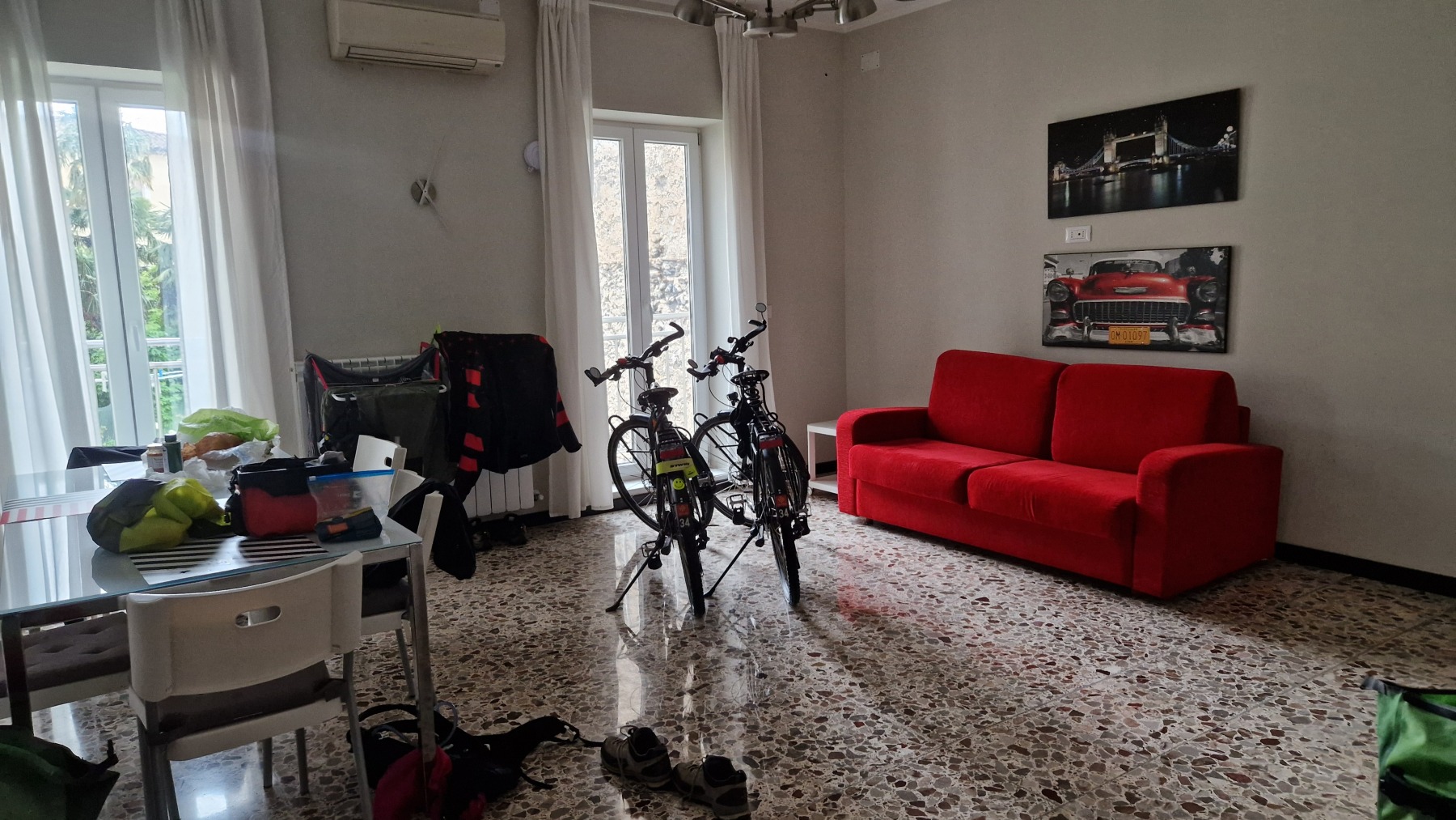 La pluie qui n’était pas loin le long du parcours nous a rejoint à dix kilomètres de l’arrivée et nous sommes arrivés bien mouillés dans l’appartement que nous avons loué. Une bonne douche chaude et une machine à laver ont vite fait oublier tout ça.