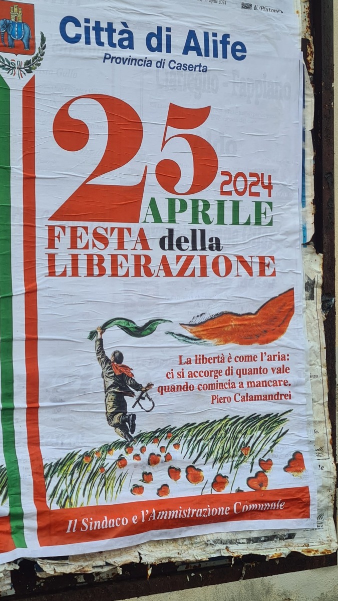 En ressortant pour faire les courses nous nous sommes rendu compte que le 25 avril, fête de la libération, est férié en Italie ! Cela nous a donné une bonne raison pour diner au restaurant… Ça nous a également permis de comprendre pourquoi il y avait eu tant de bruit à Cassino hier soir.