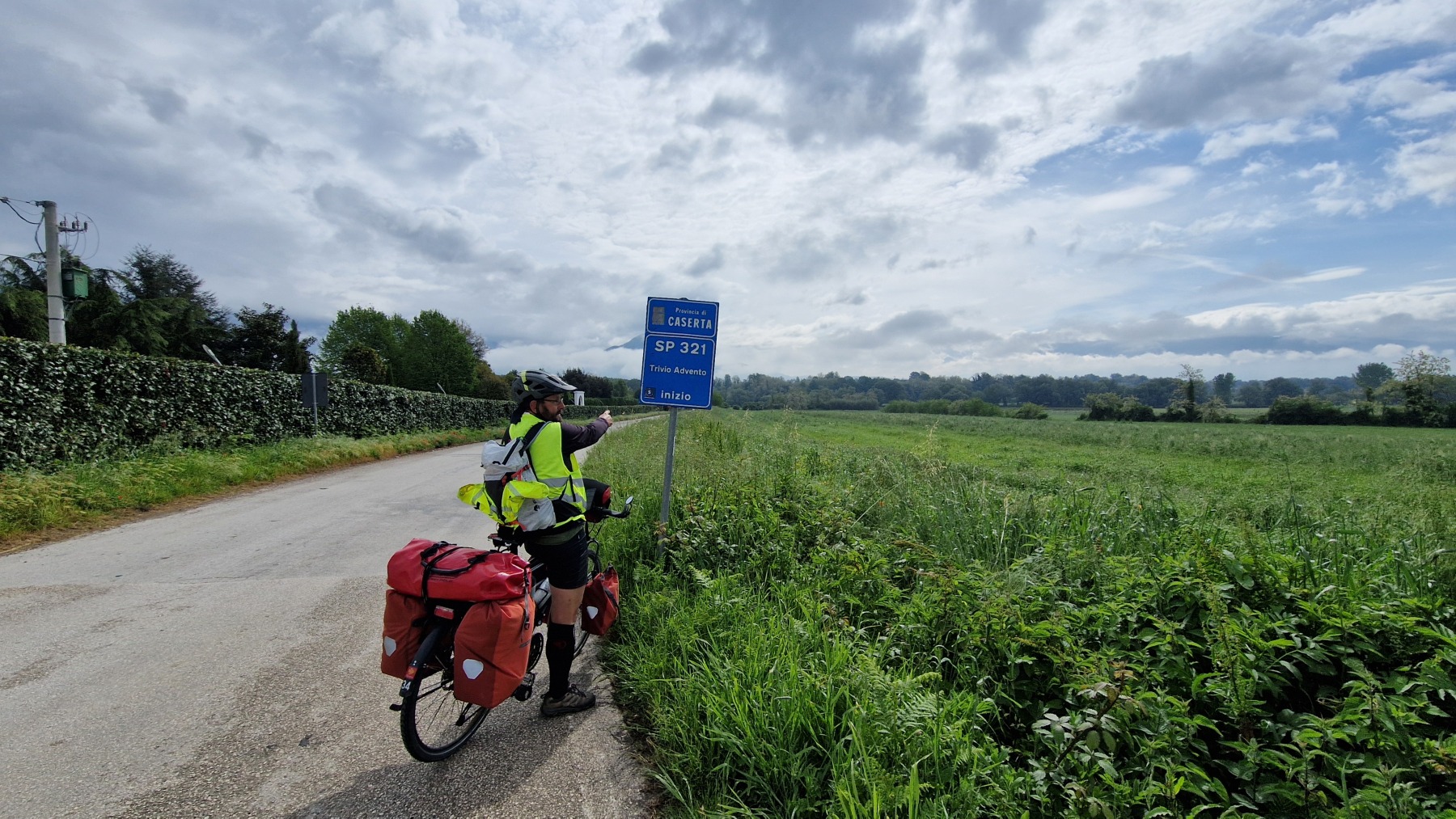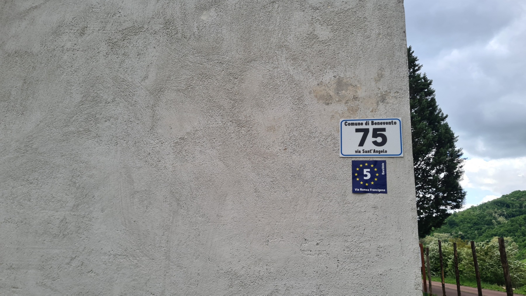 Évènement du jour : nous avons trouvé la première balise Eurovélo 5 que nous suivons depuis Lucques !