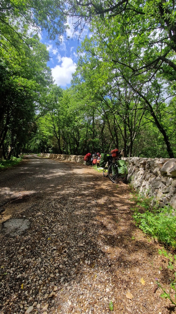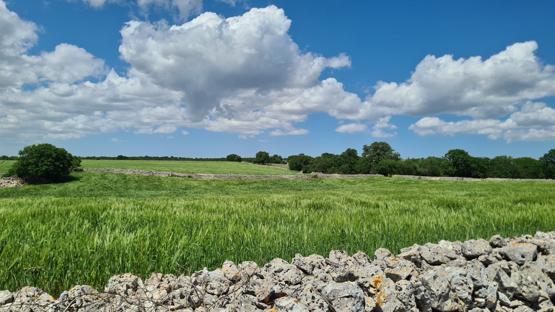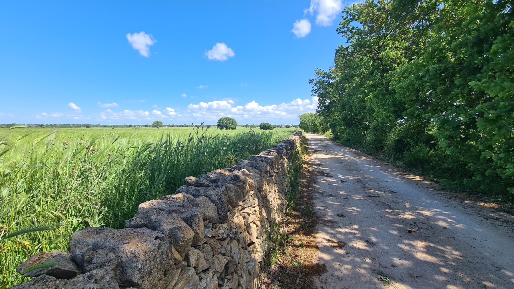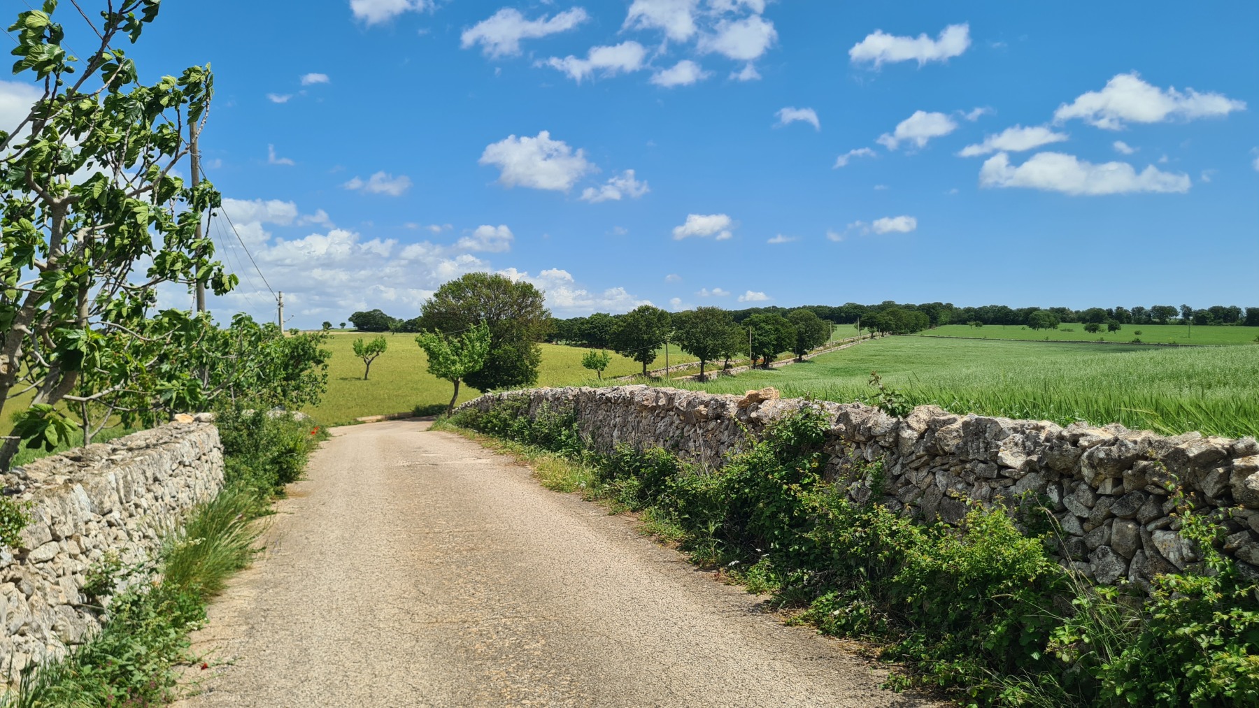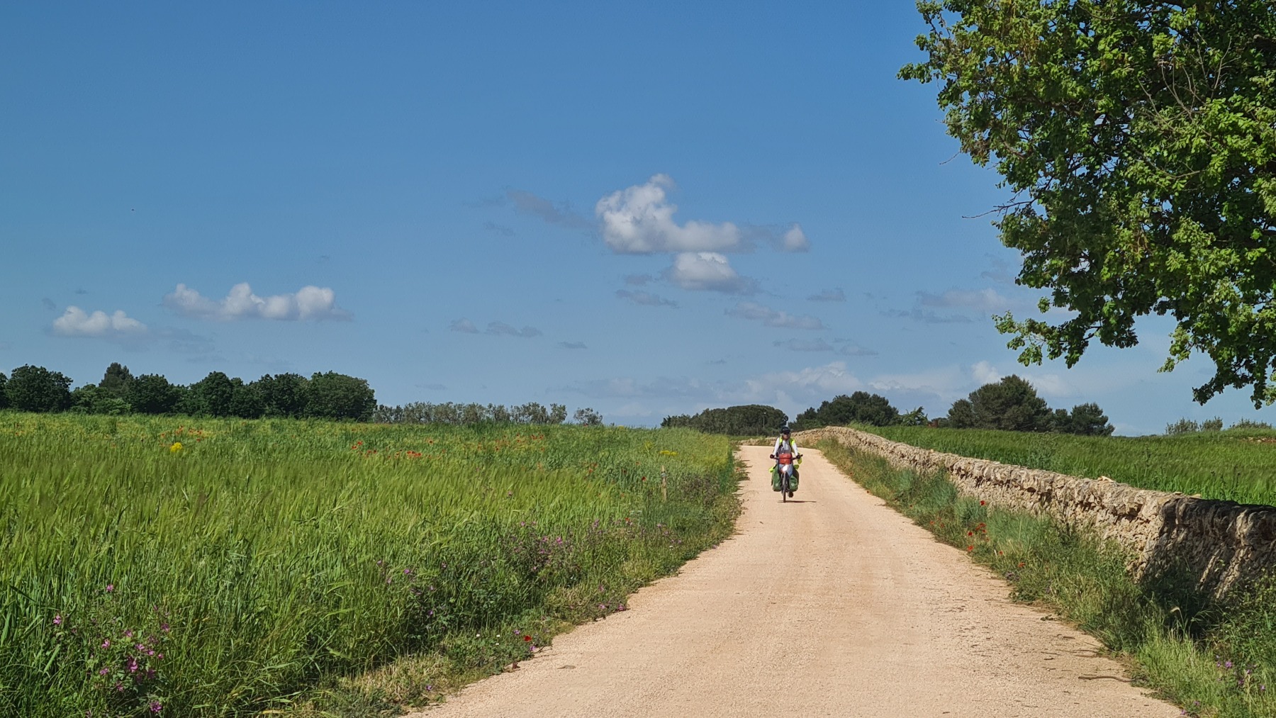 L’endroit où nous avons quitté Eurovelo 5 correspondait également à notre retour dans la région des Pouilles et à un changement de paysage marqué par l’apparition de murets de pierres sèches pour séparer les champs et beaucoup plus d’arbres sous forme de bosquets mais aussi dans les champs.