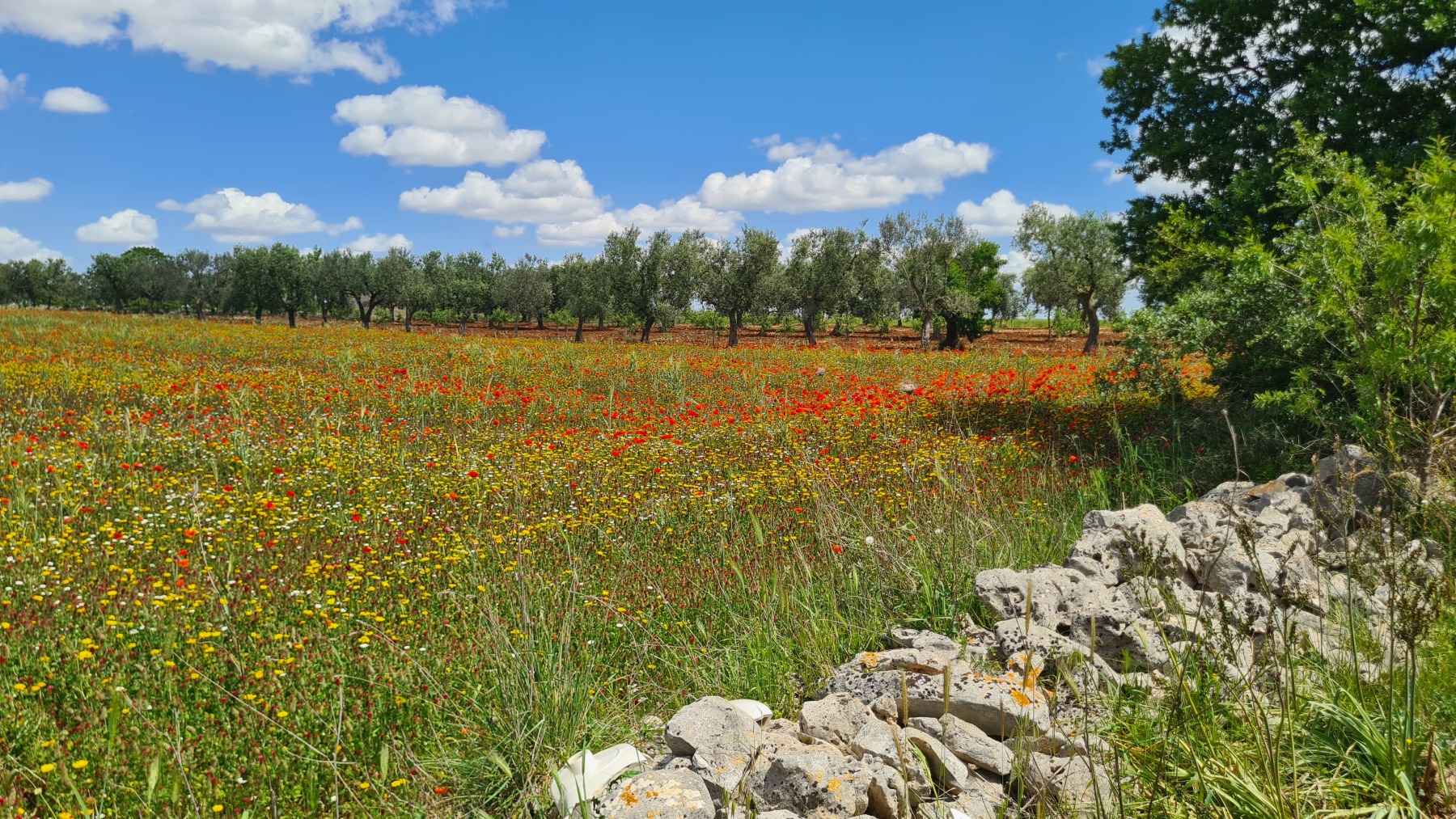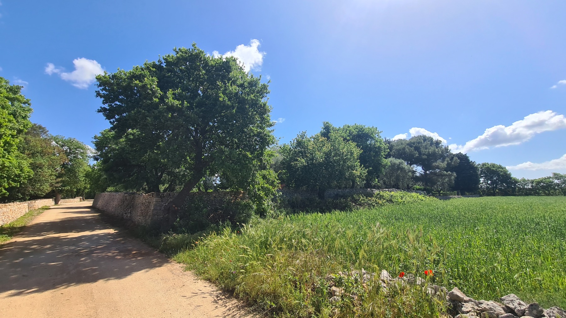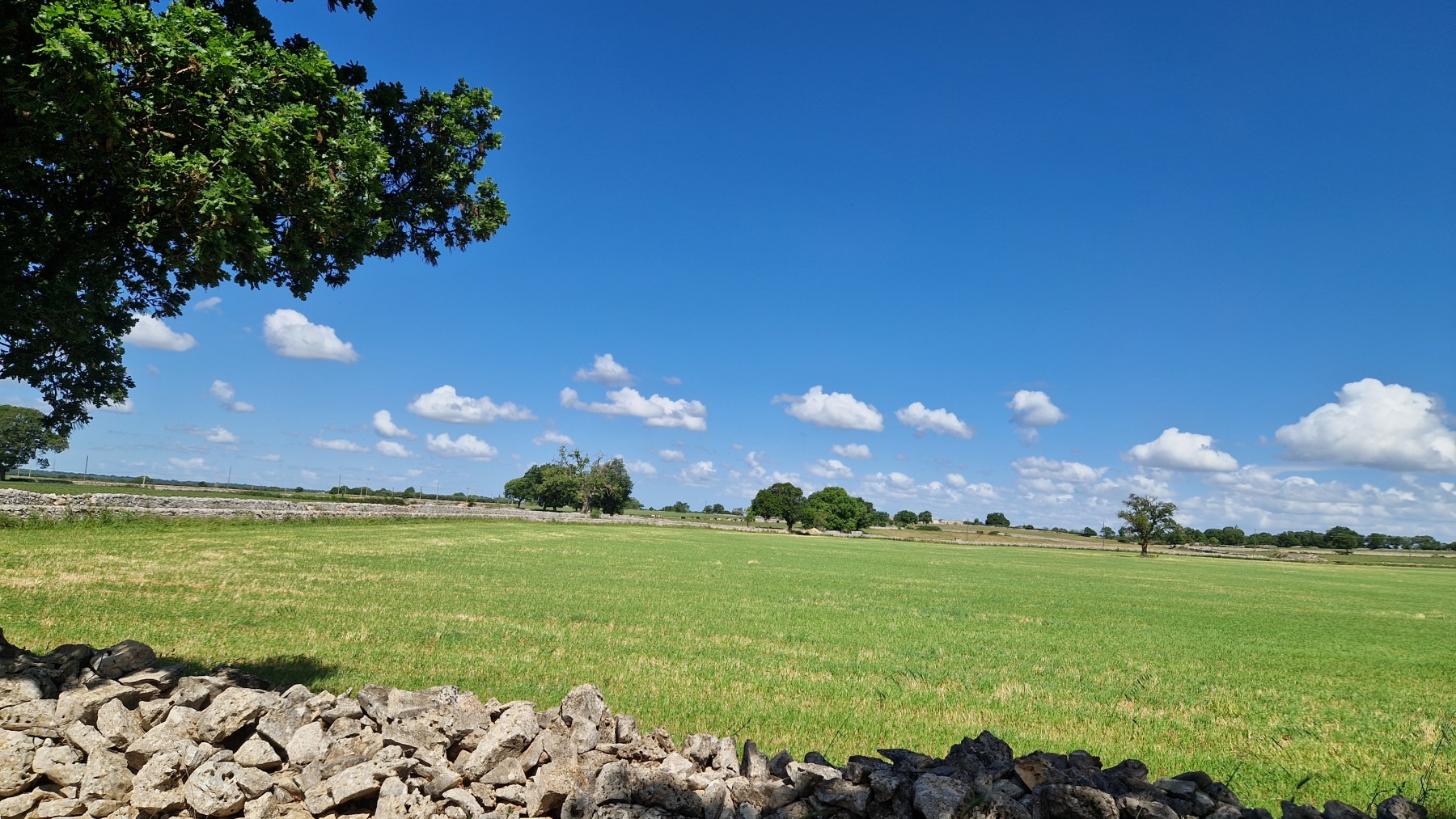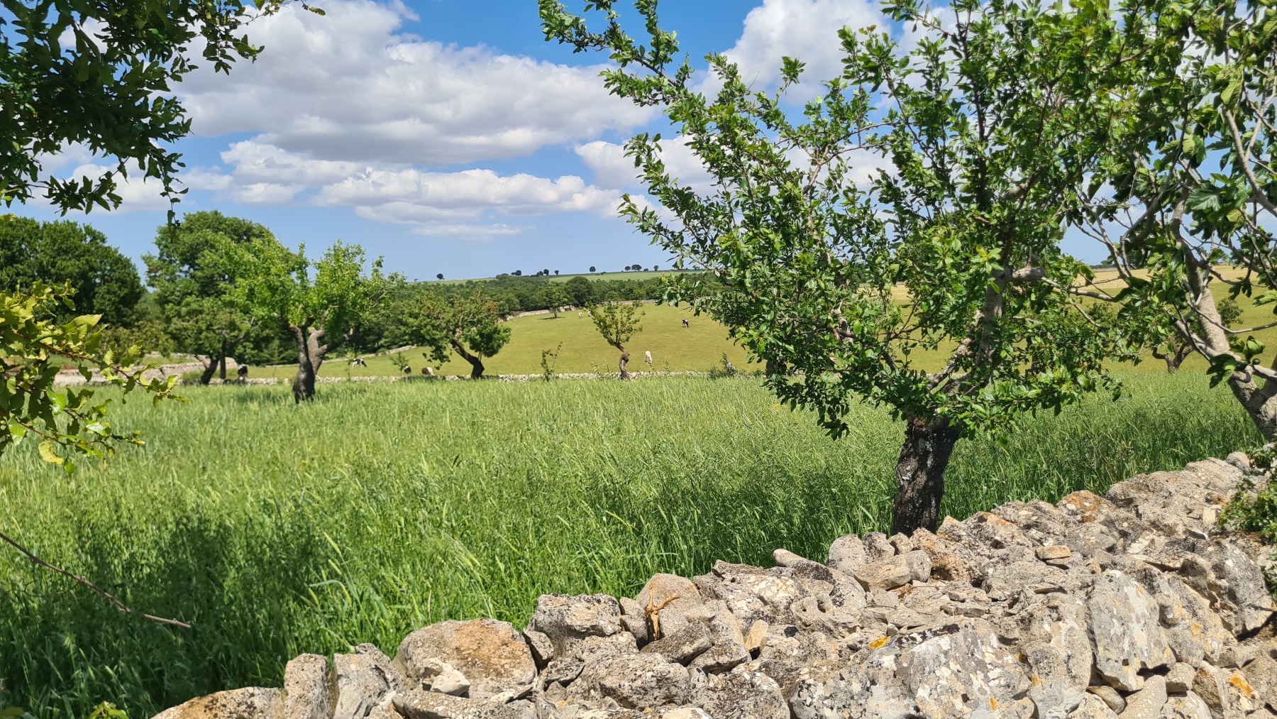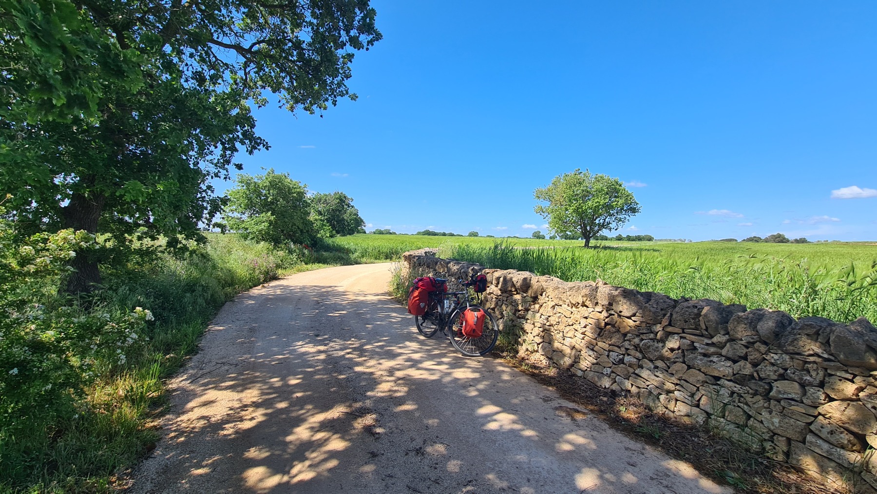 L’endroit où nous avons quitté Eurovelo 5 correspondait également à notre retour dans la région des Pouilles et à un changement de paysage marqué par l’apparition de murets de pierres sèches pour séparer les champs et beaucoup plus d’arbres sous forme de bosquets mais aussi dans les champs.
