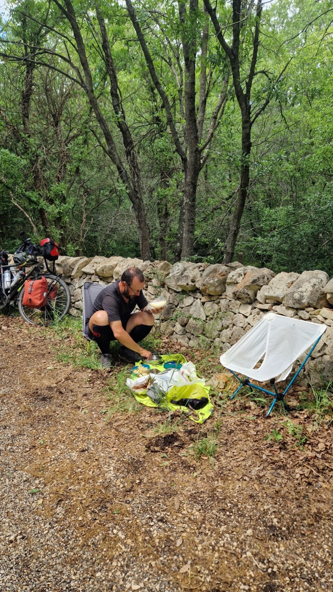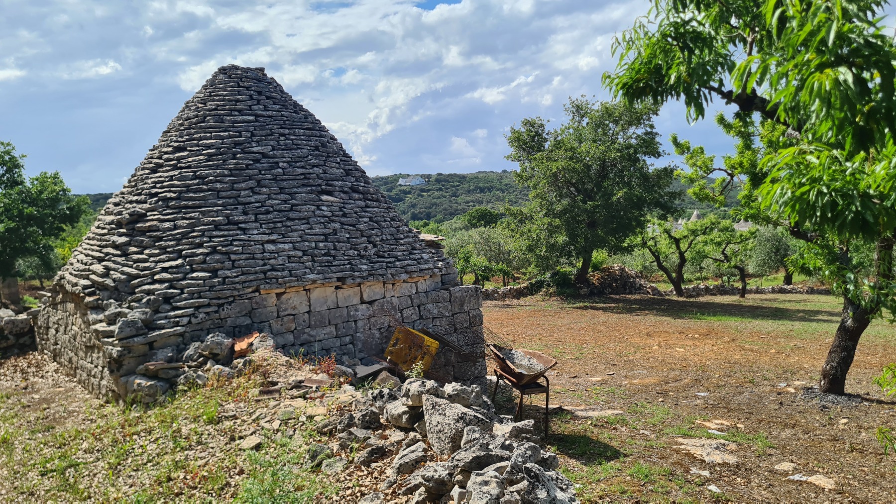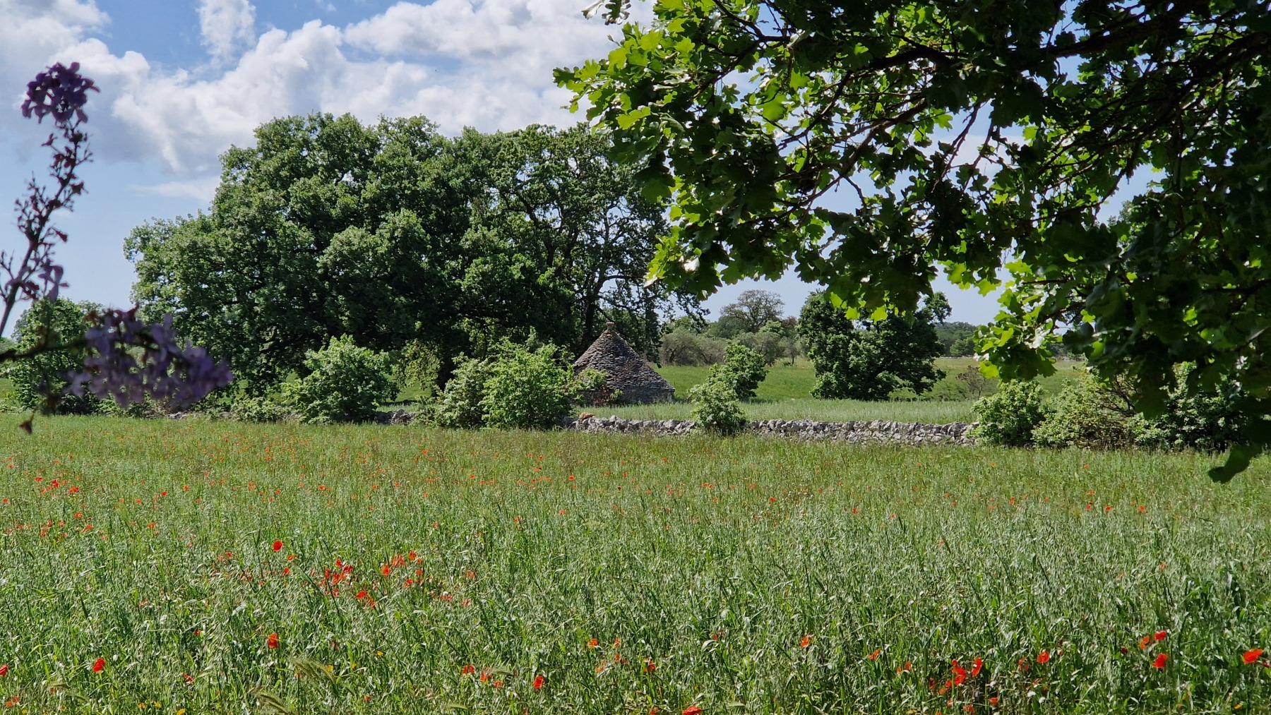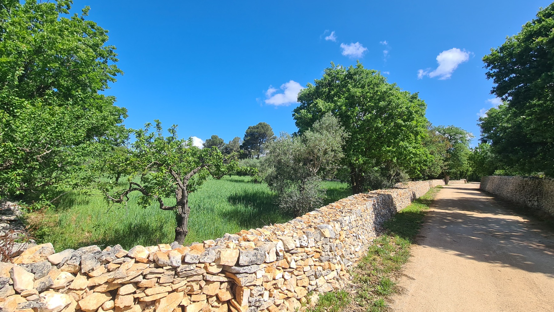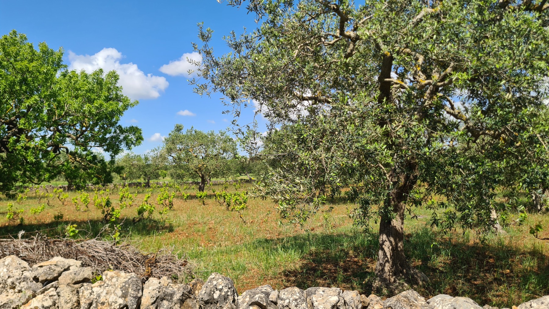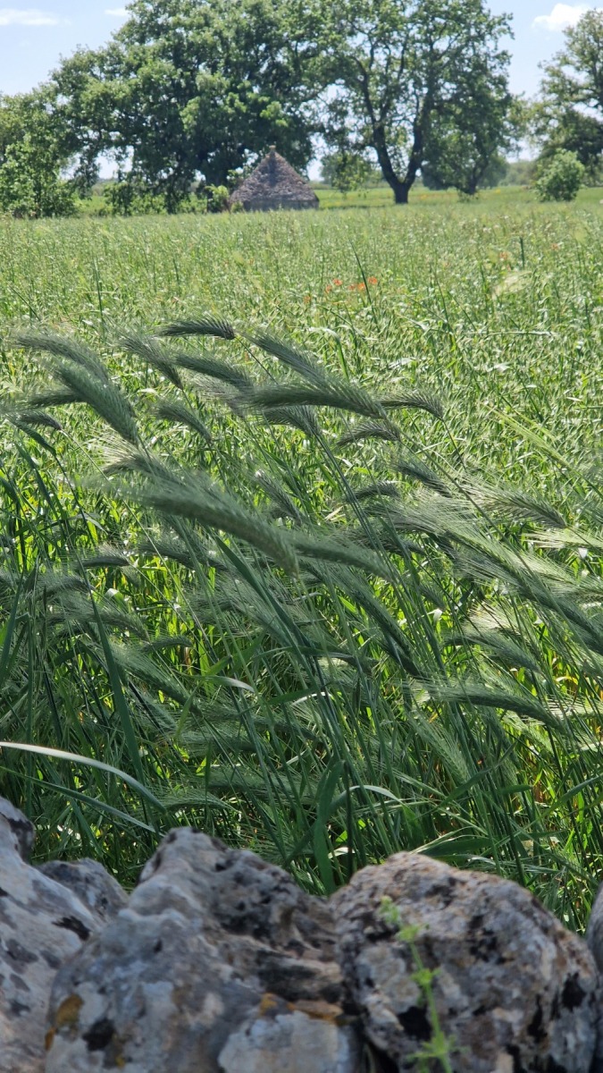 L’endroit où nous avons quitté Eurovelo 5 correspondait également à notre retour dans la région des Pouilles et à un changement de paysage marqué par l’apparition de murets de pierres sèches pour séparer les champs et beaucoup plus d’arbres sous forme de bosquets mais aussi dans les champs.