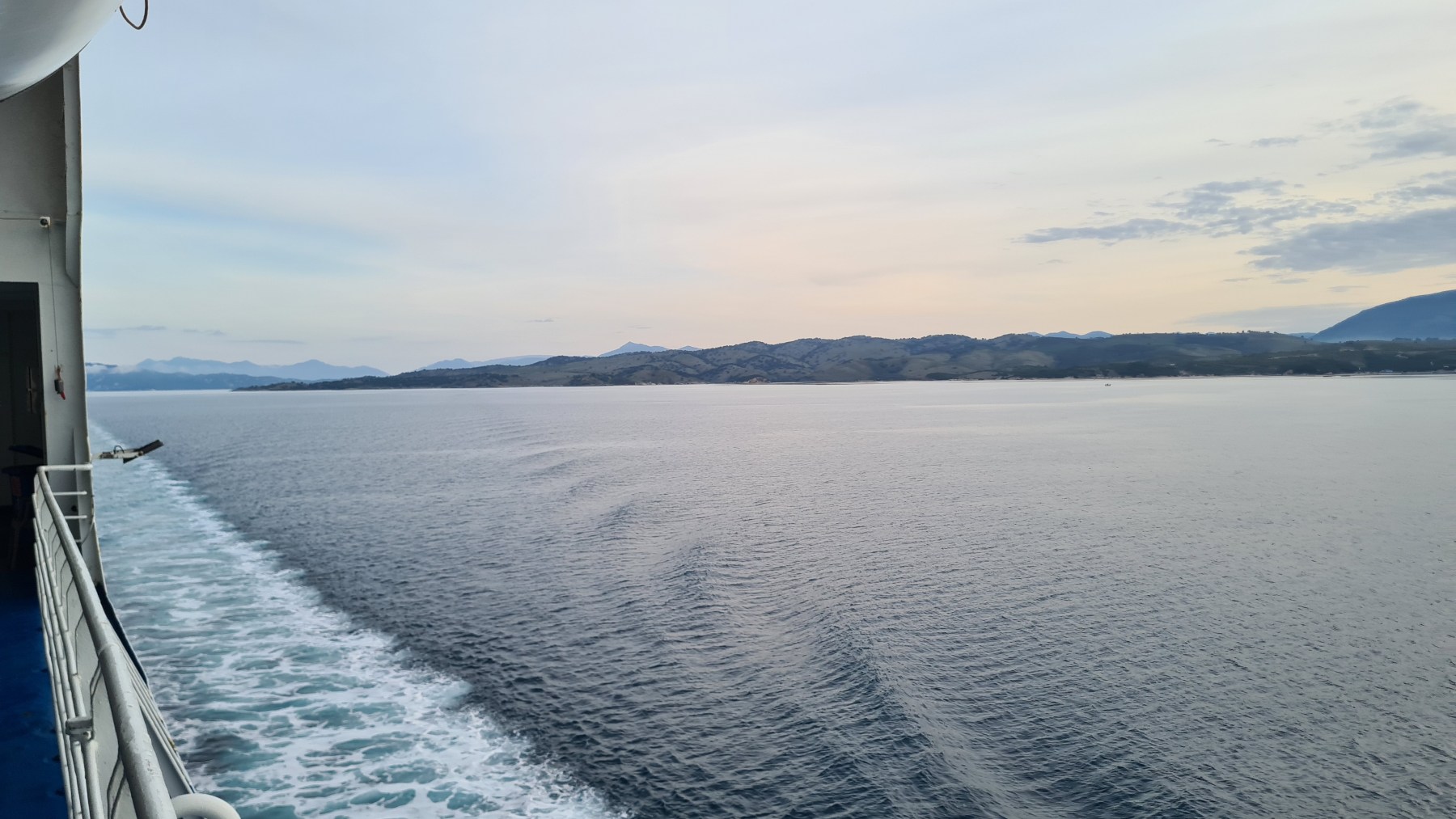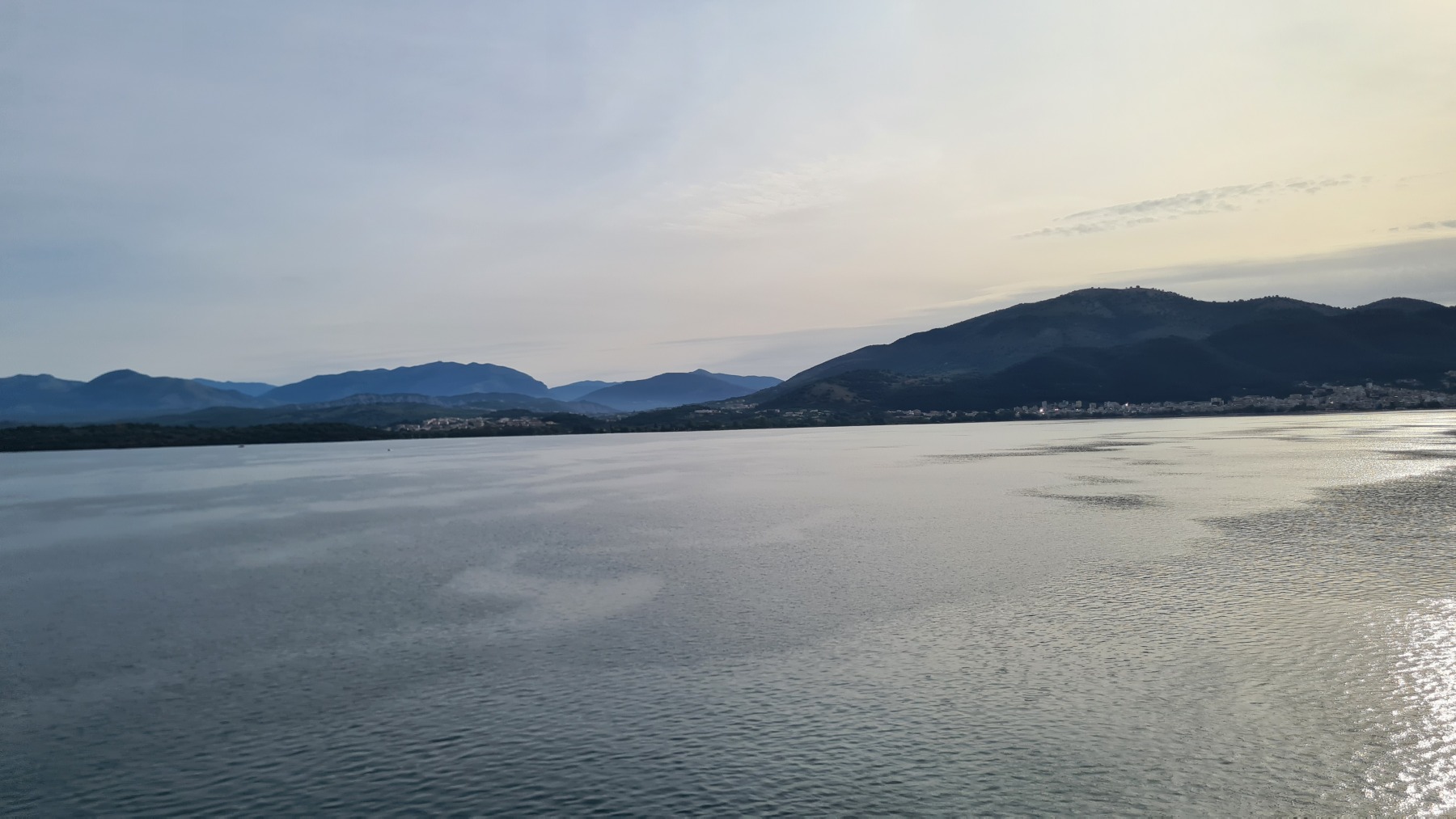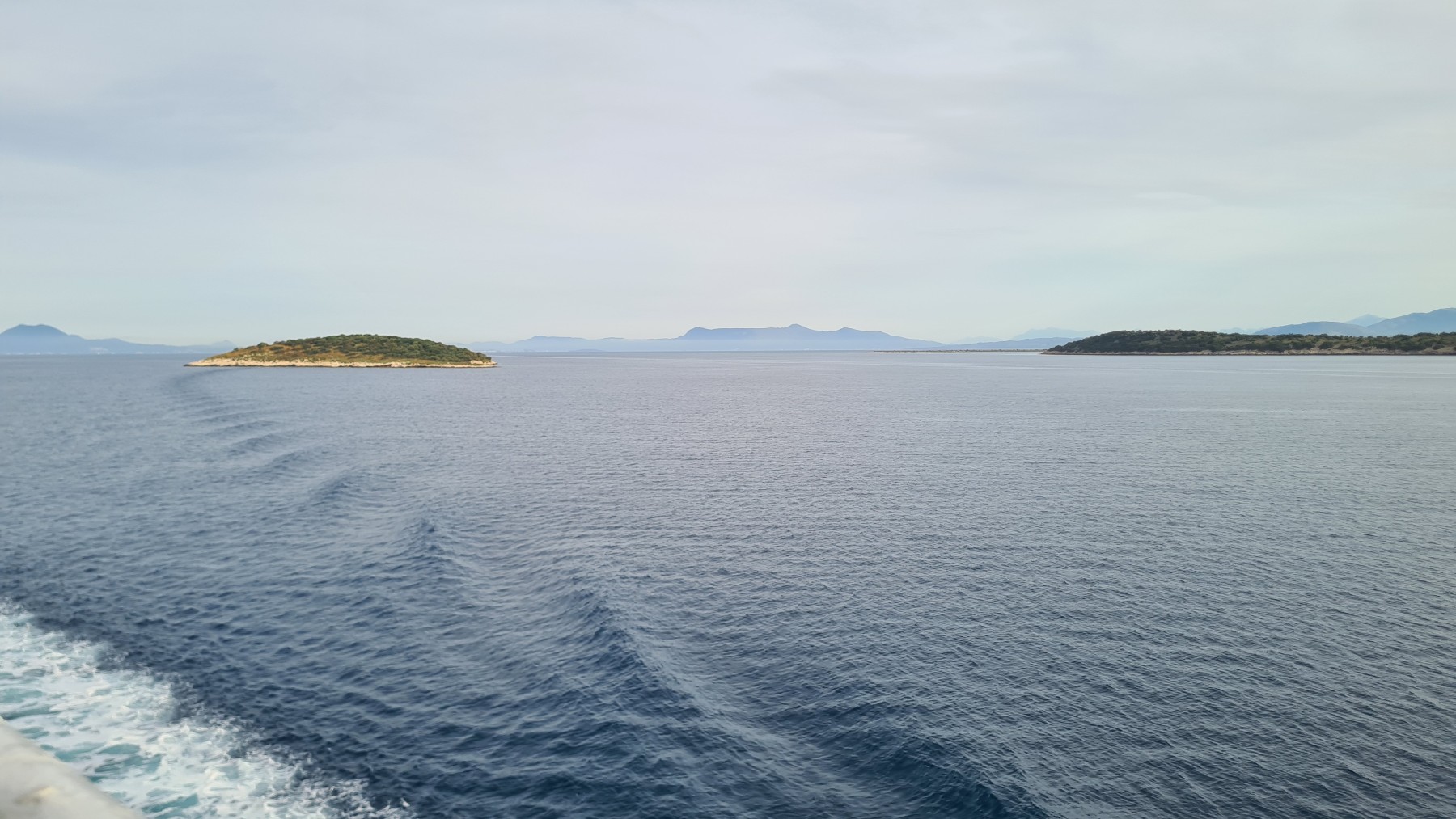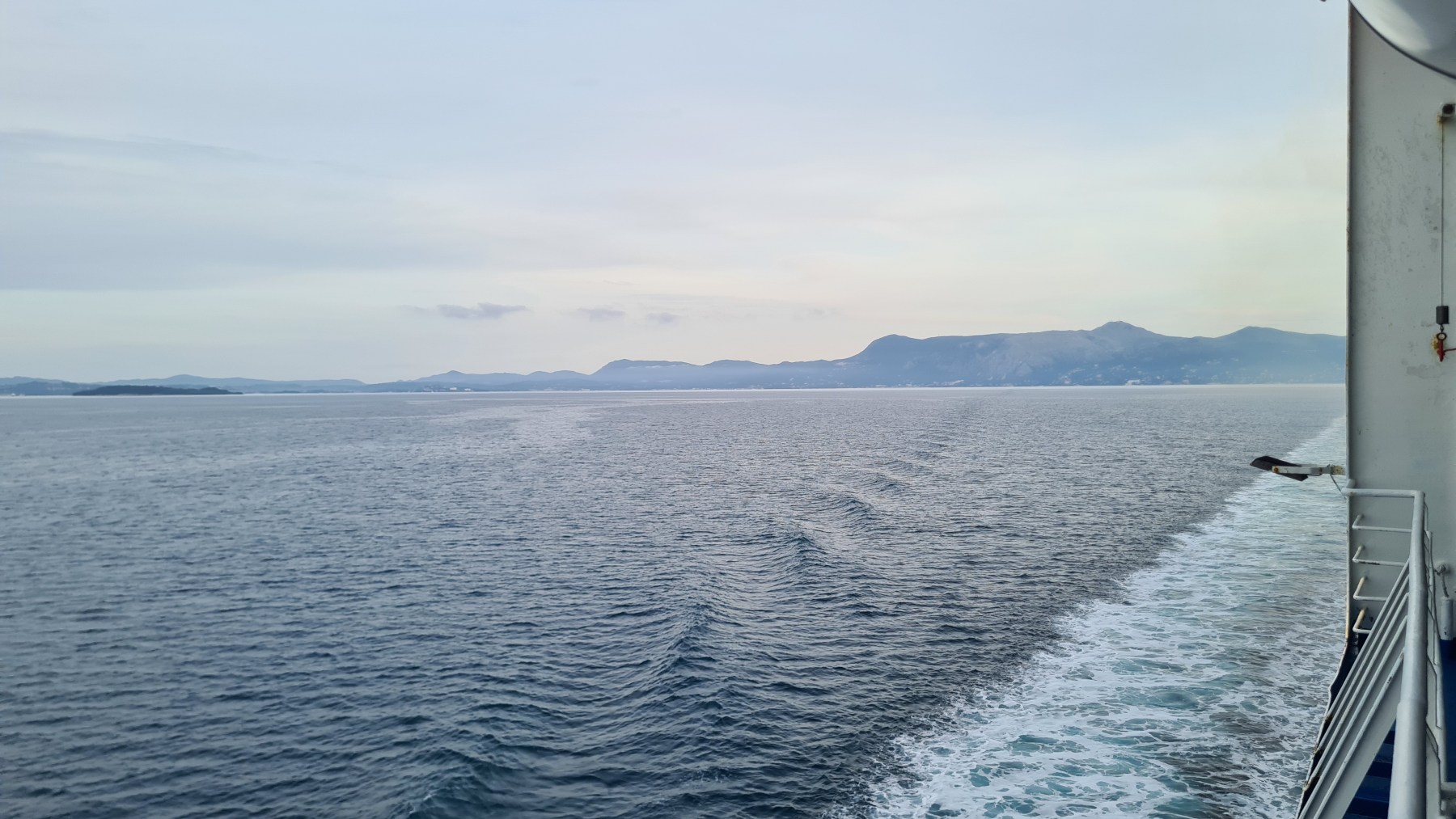 Ce matin nous étions dans le canal qui sépare l’ile de Corfou du continent lorsque je me suis réveillé et on voyait bien l’ile à travers les embruns qui floutaient le hublot.