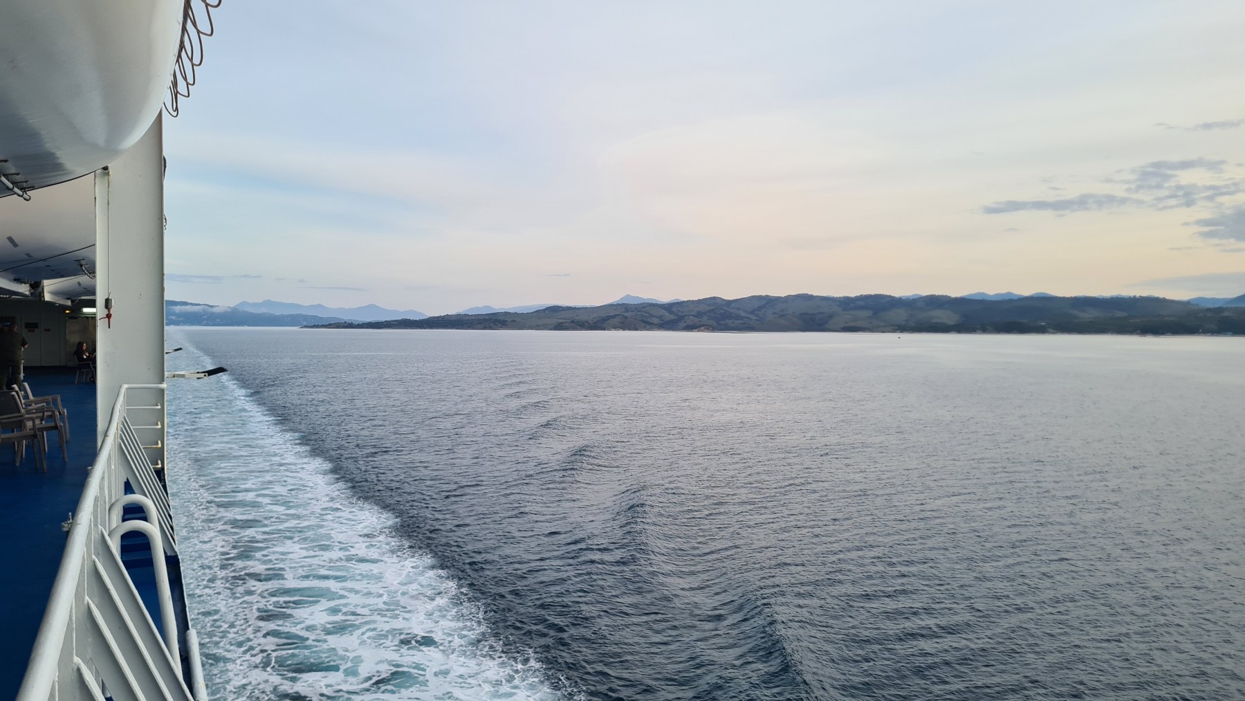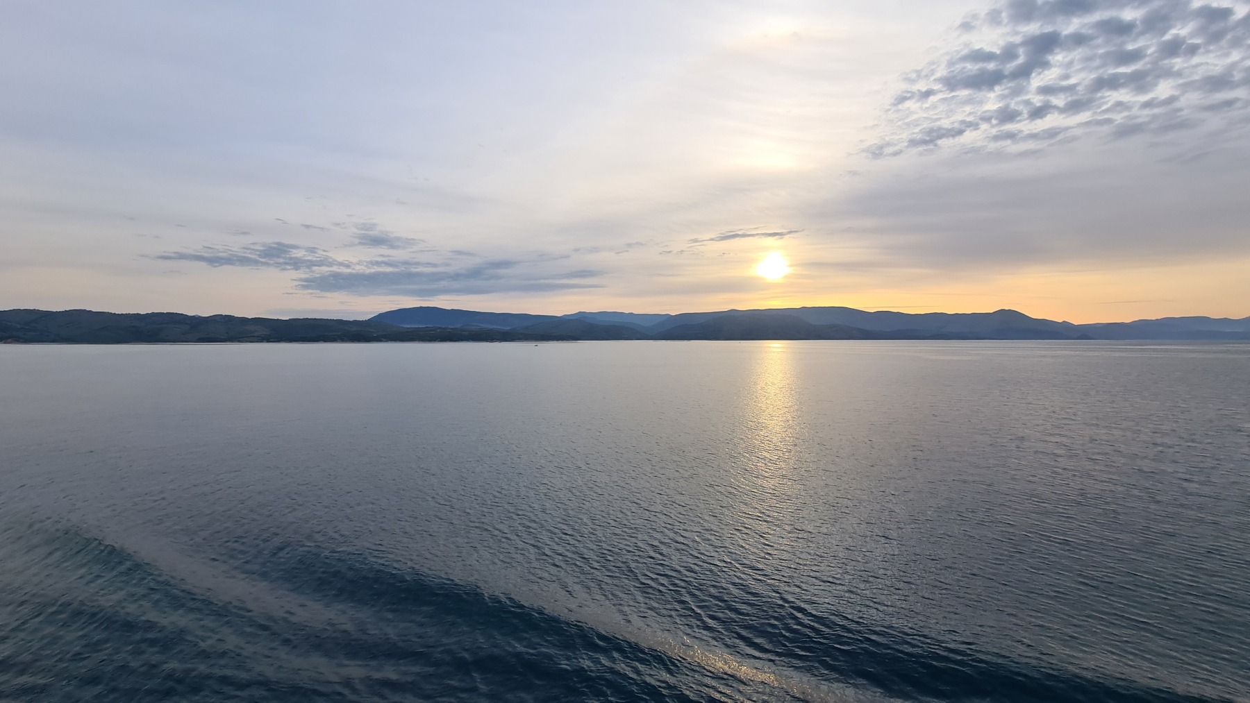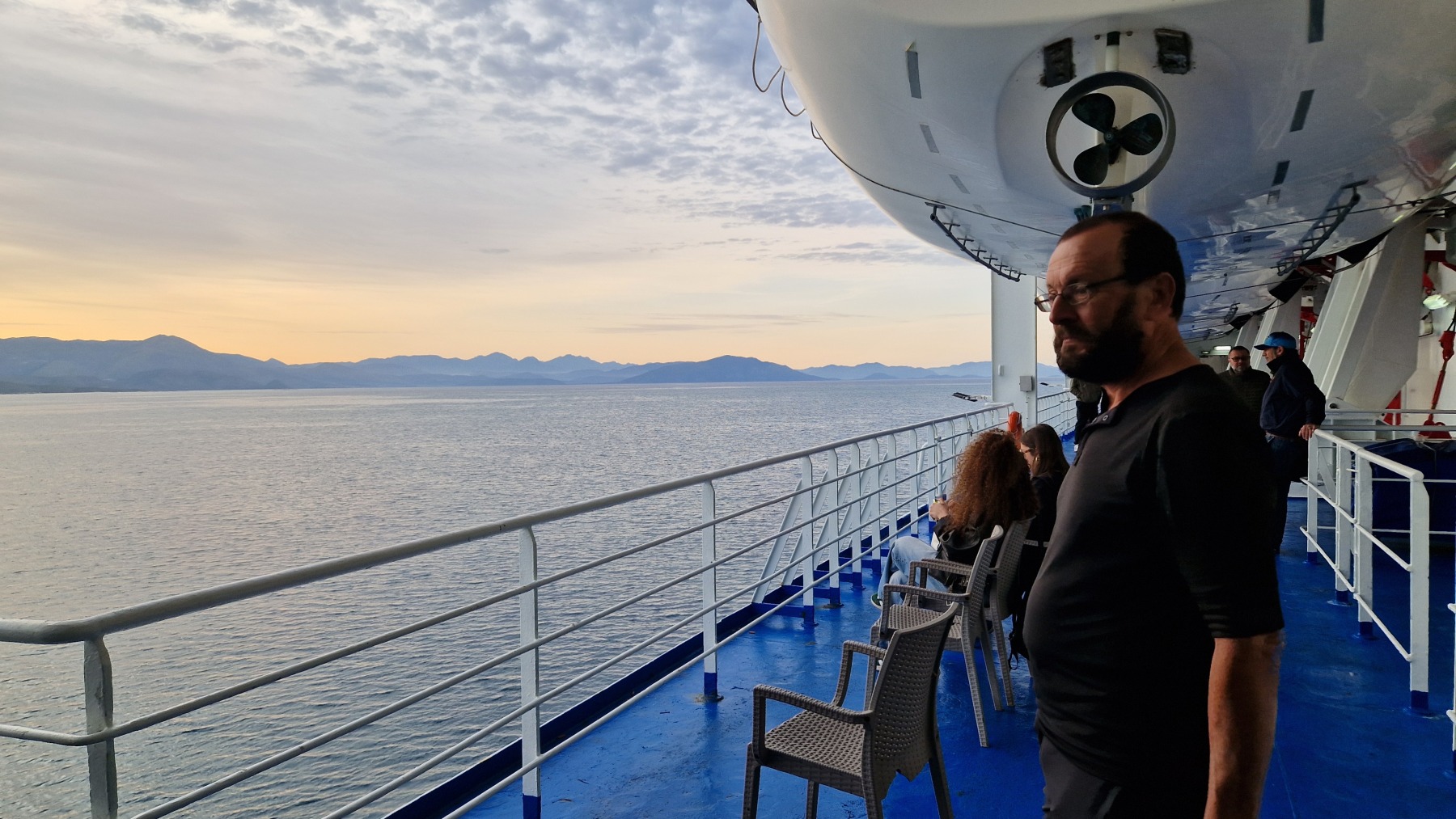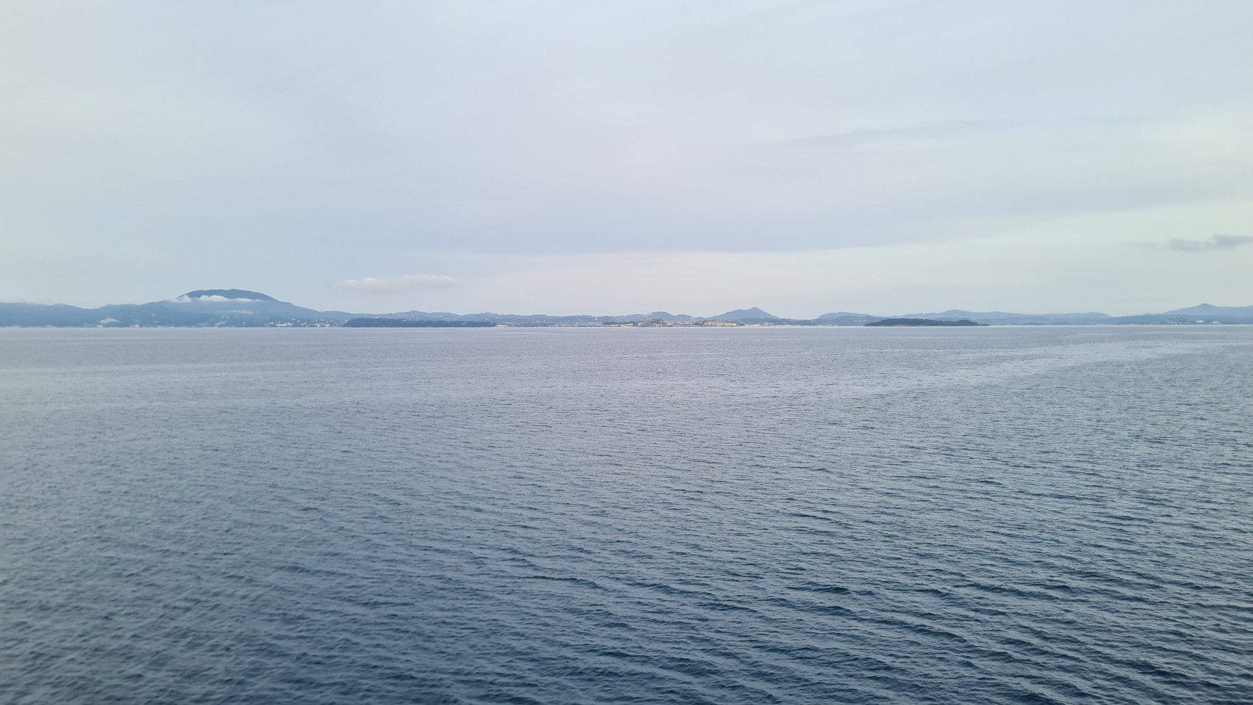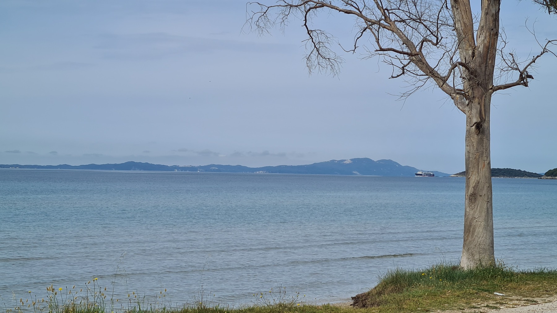 Ce matin nous étions dans le canal qui sépare l’ile de Corfou du continent lorsque je me suis réveillé et on voyait bien l’ile à travers les embruns qui floutaient le hublot.