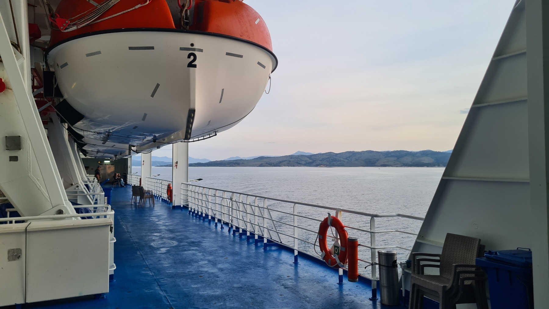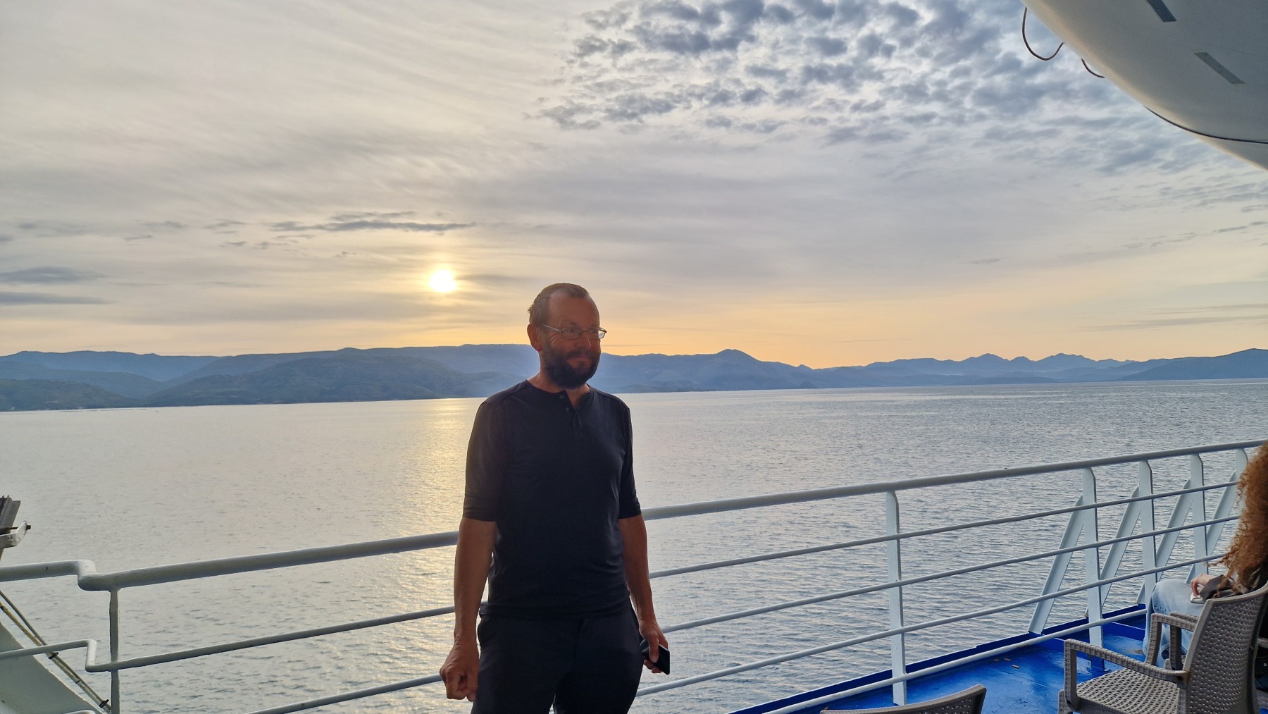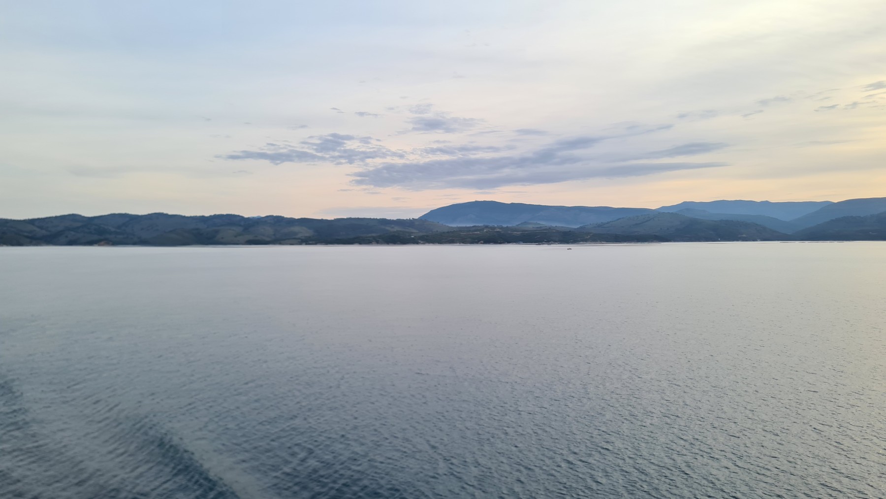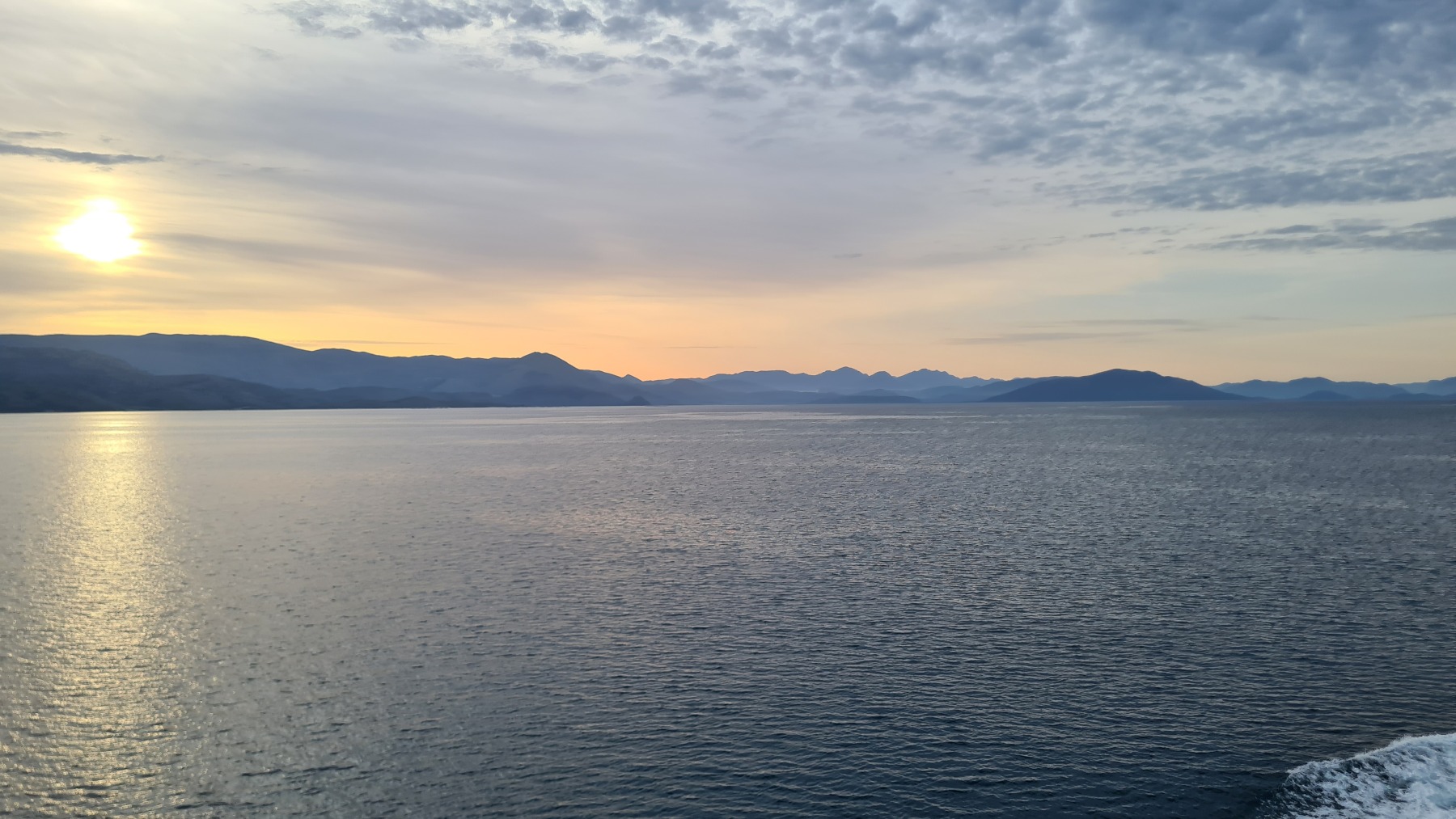 Ce matin nous étions dans le canal qui sépare l’ile de Corfou du continent lorsque je me suis réveillé et on voyait bien l’ile à travers les embruns qui floutaient le hublot.
