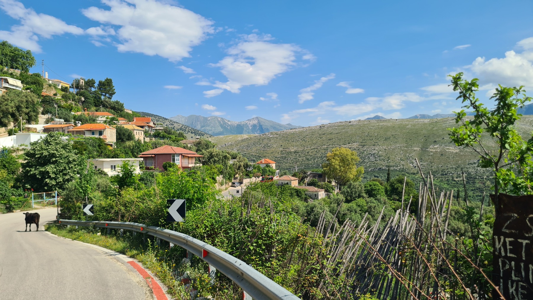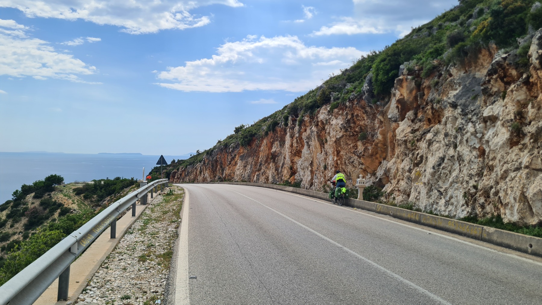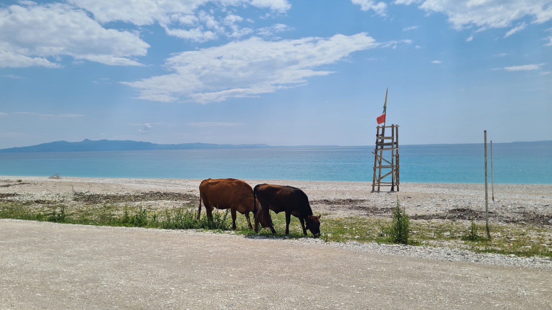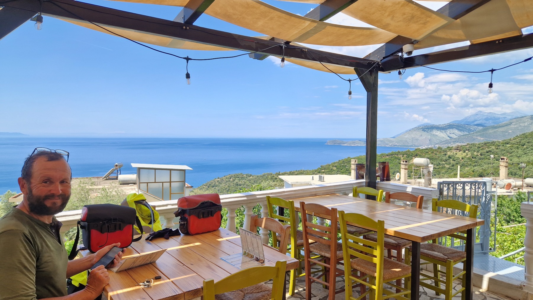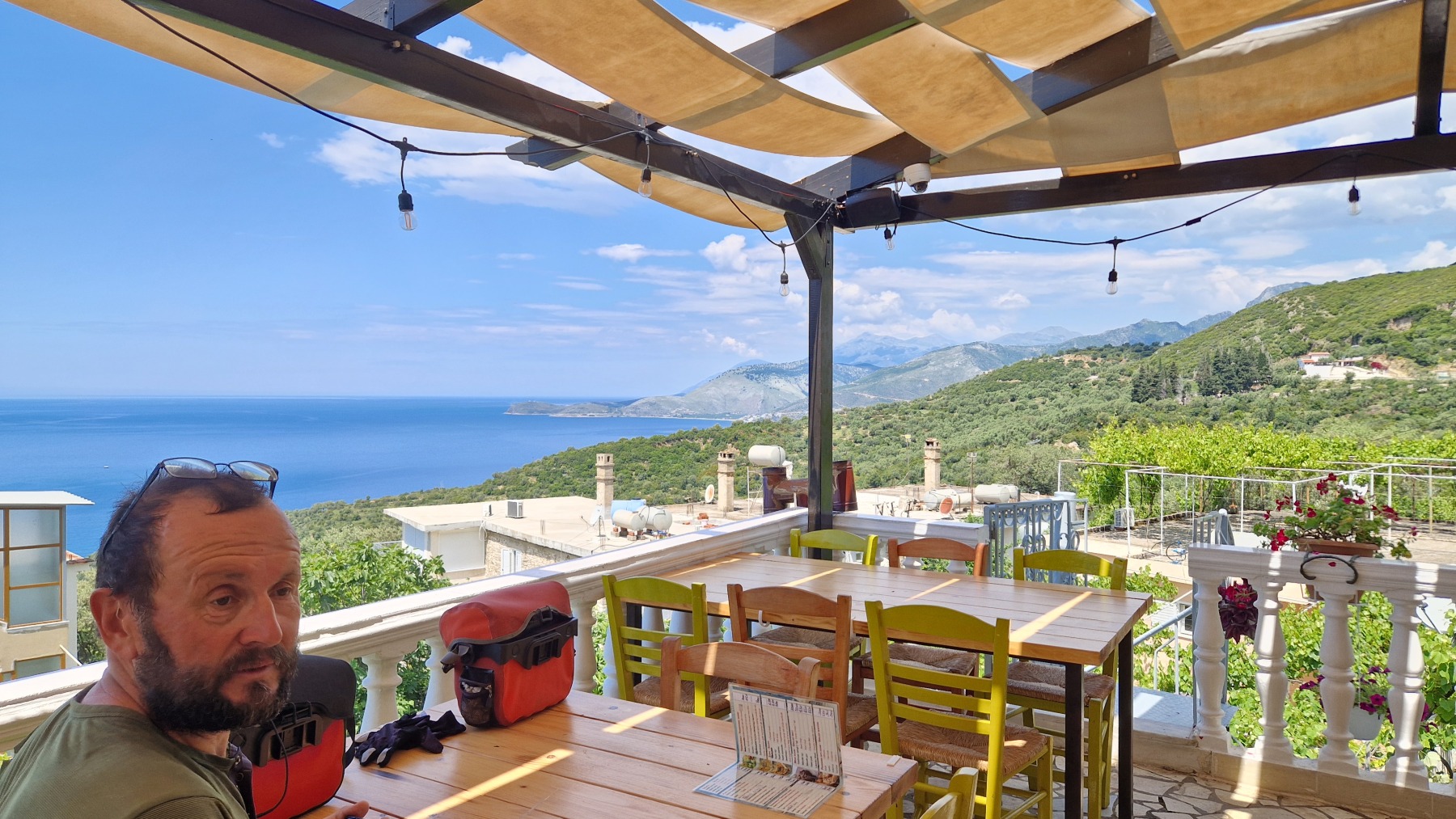 Nous avons suivi l’Eurovelo 8 (qui elle même suit la route du littoral « SH8 ») jusqu’au village de Piqeras où nous avons déjeuné. Au passage nous avons pu y voir des panoramas superbes sur les montagnes, sur la mer et sur l’ile de Corfou qui est encore toute proche mais aussi une vache, un troupeau de moutons, des ânes et un cyclotouriste allemand qui suit la même route en sens inverse.