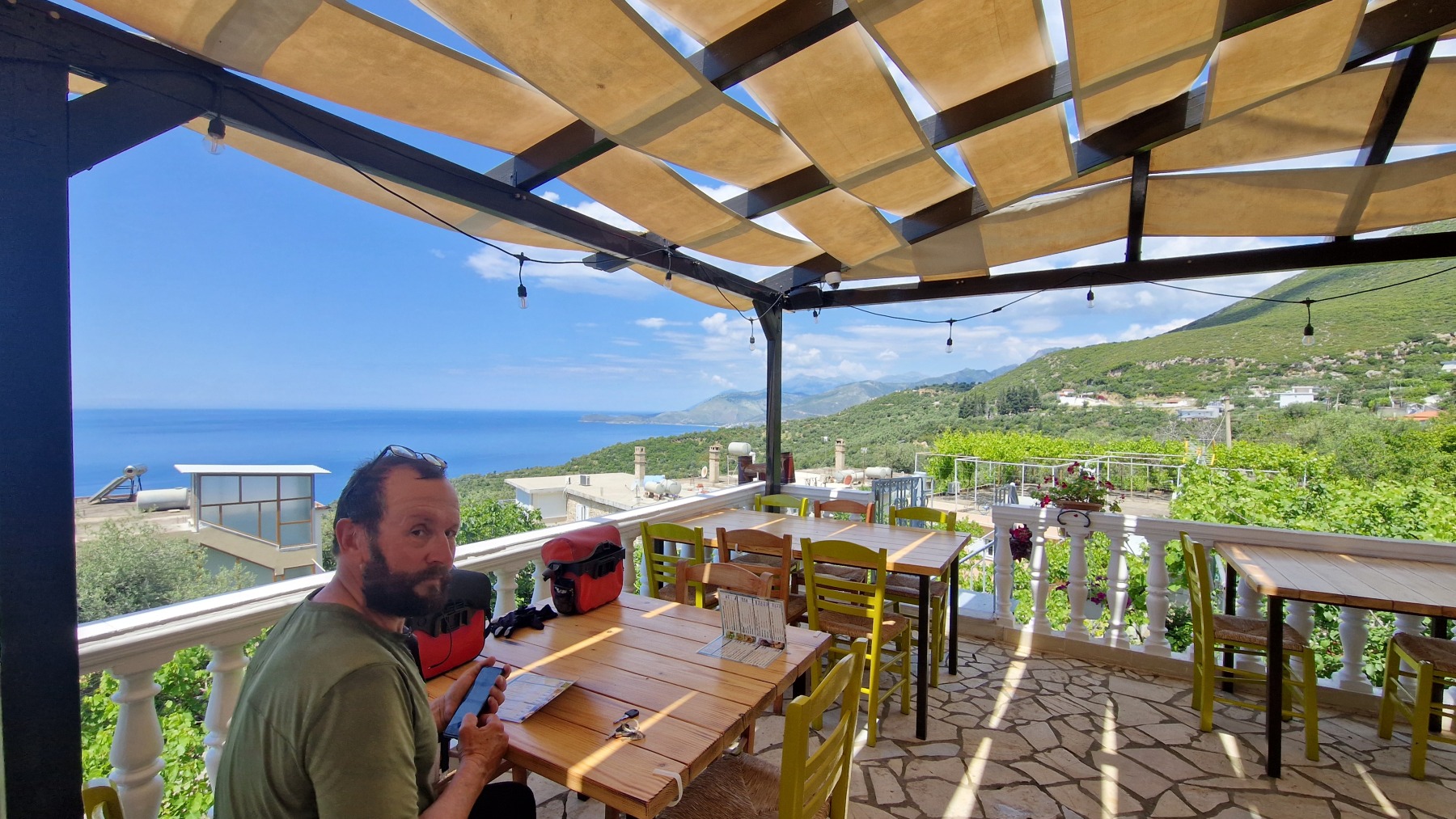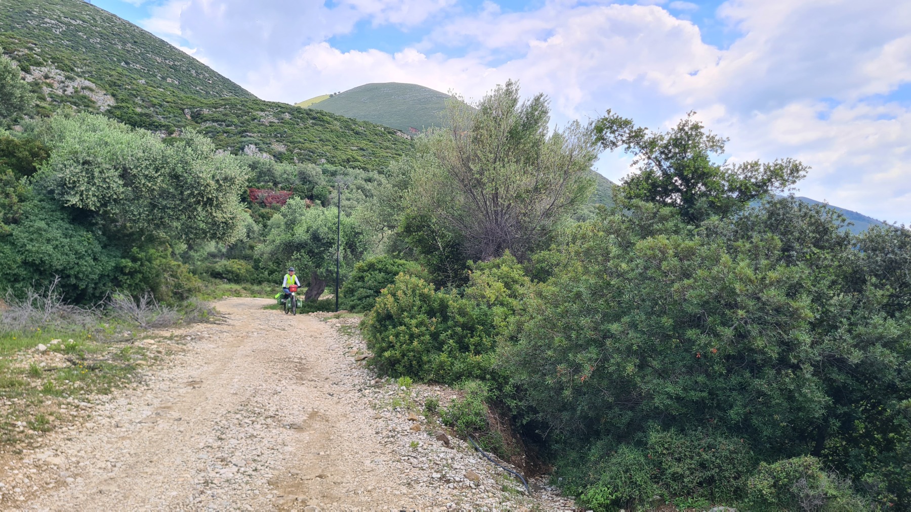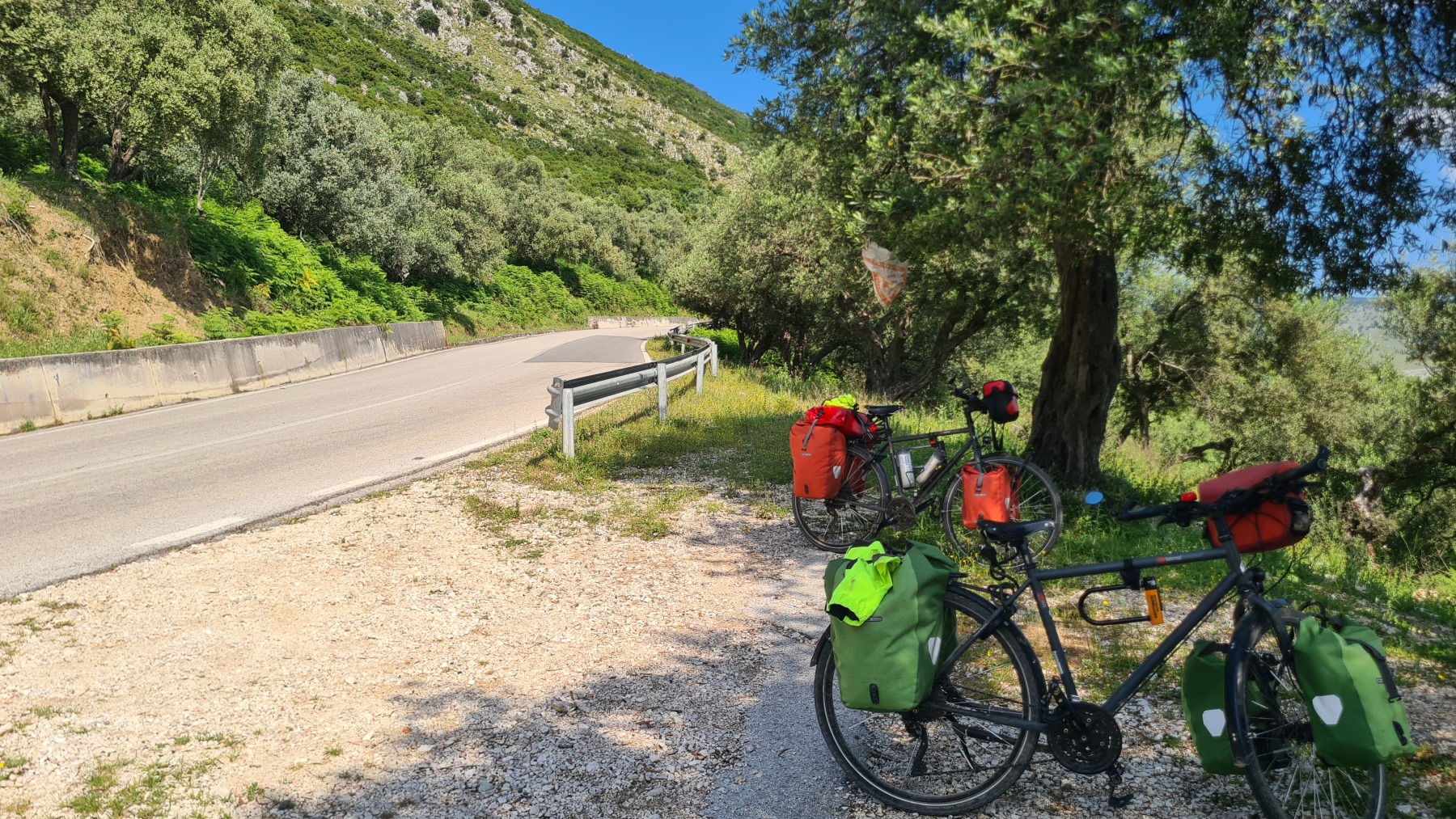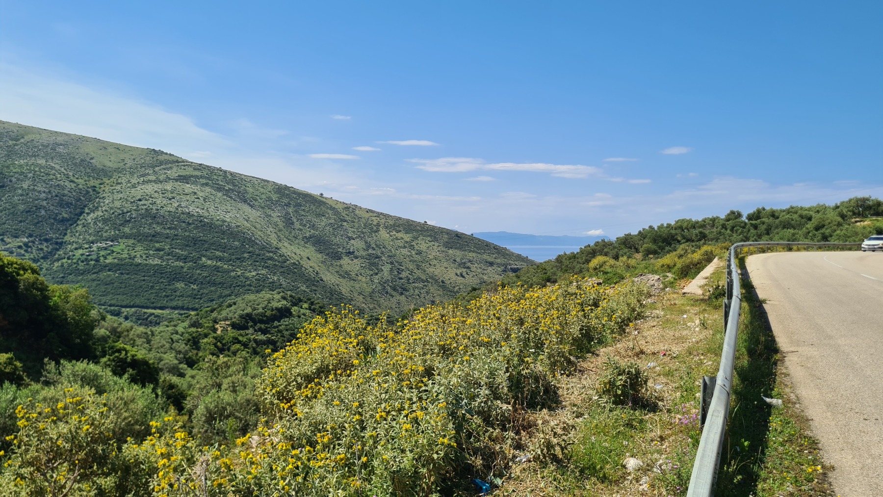 Nous avons suivi l’Eurovelo 8 (qui elle même suit la route du littoral « SH8 ») jusqu’au village de Piqeras où nous avons déjeuné. Au passage nous avons pu y voir des panoramas superbes sur les montagnes, sur la mer et sur l’ile de Corfou qui est encore toute proche mais aussi une vache, un troupeau de moutons, des ânes et un cyclotouriste allemand qui suit la même route en sens inverse.