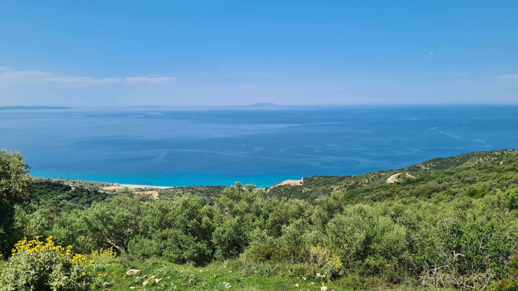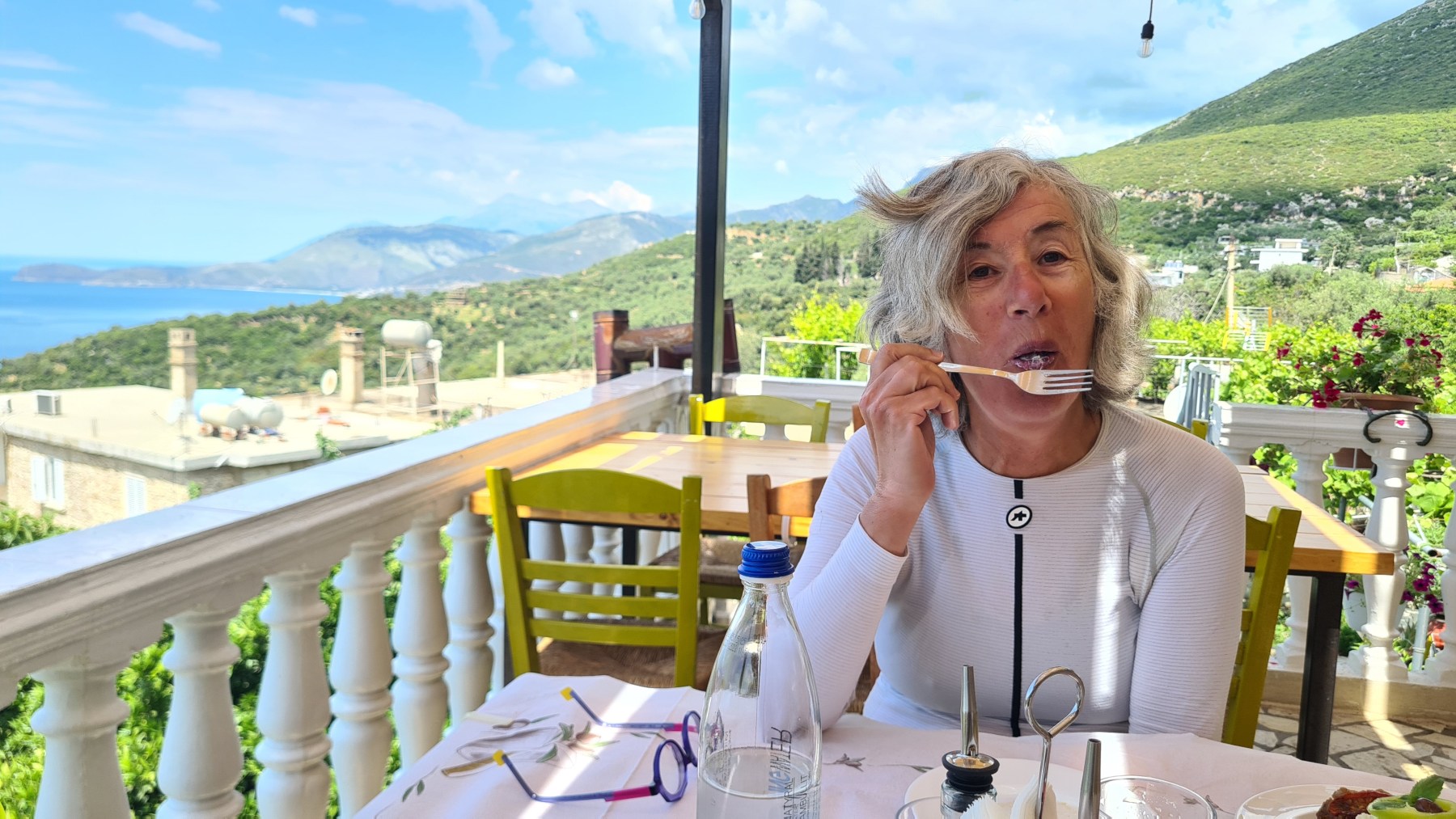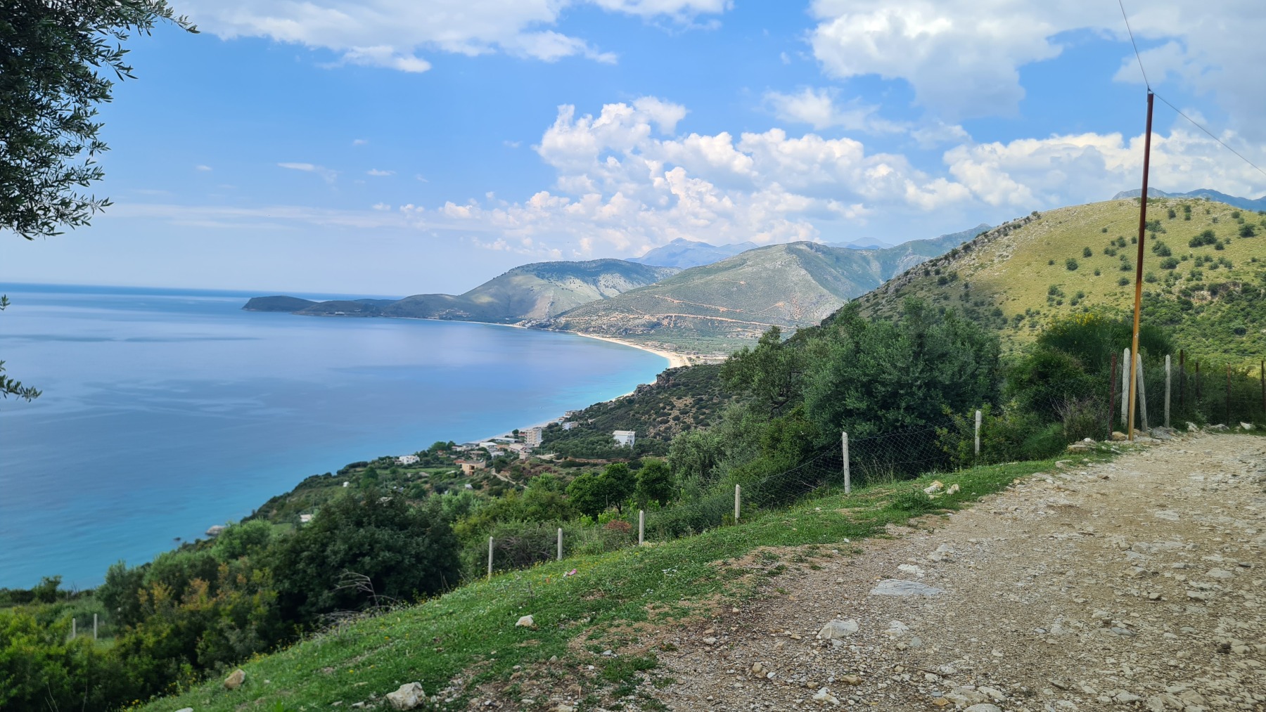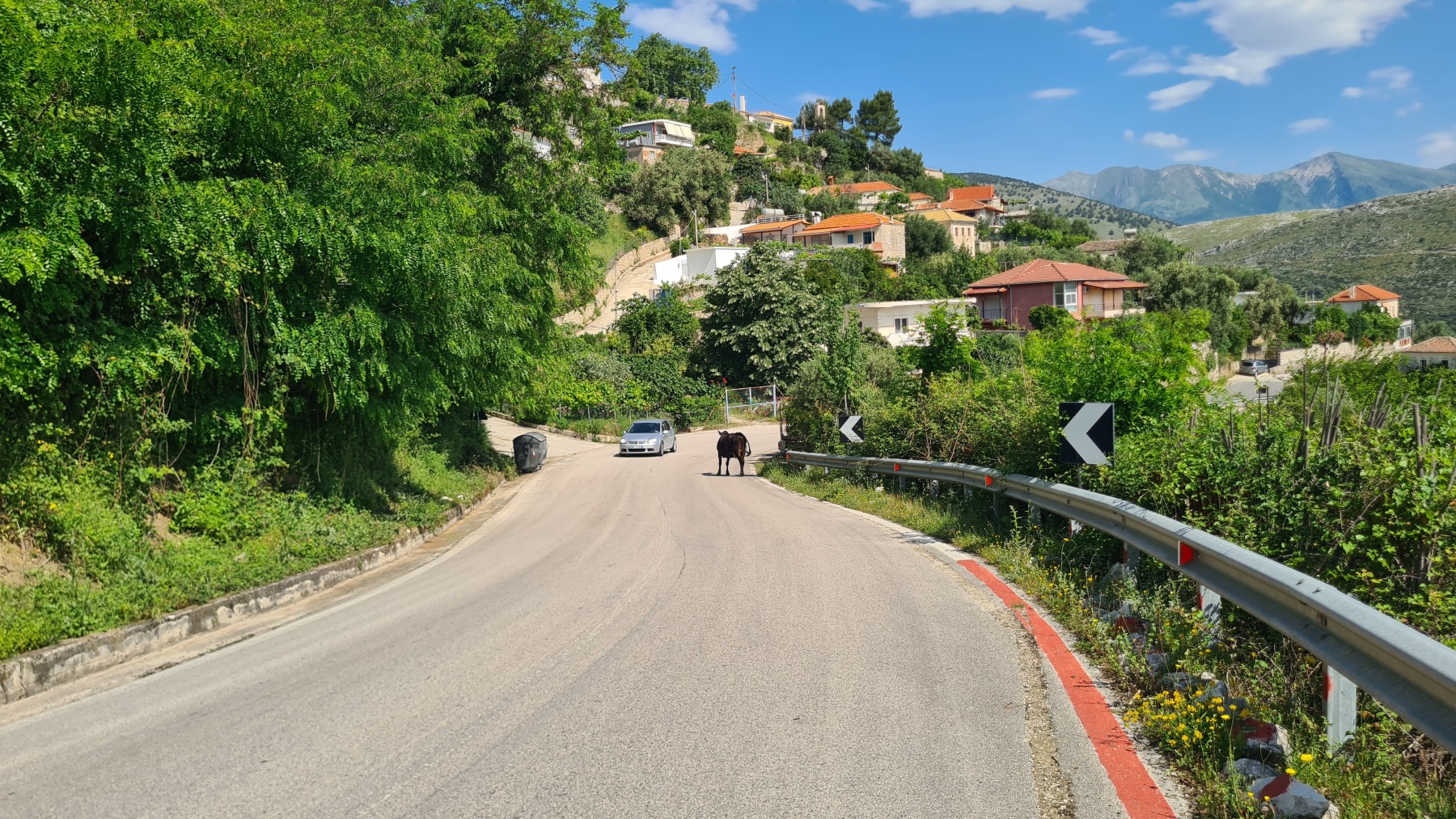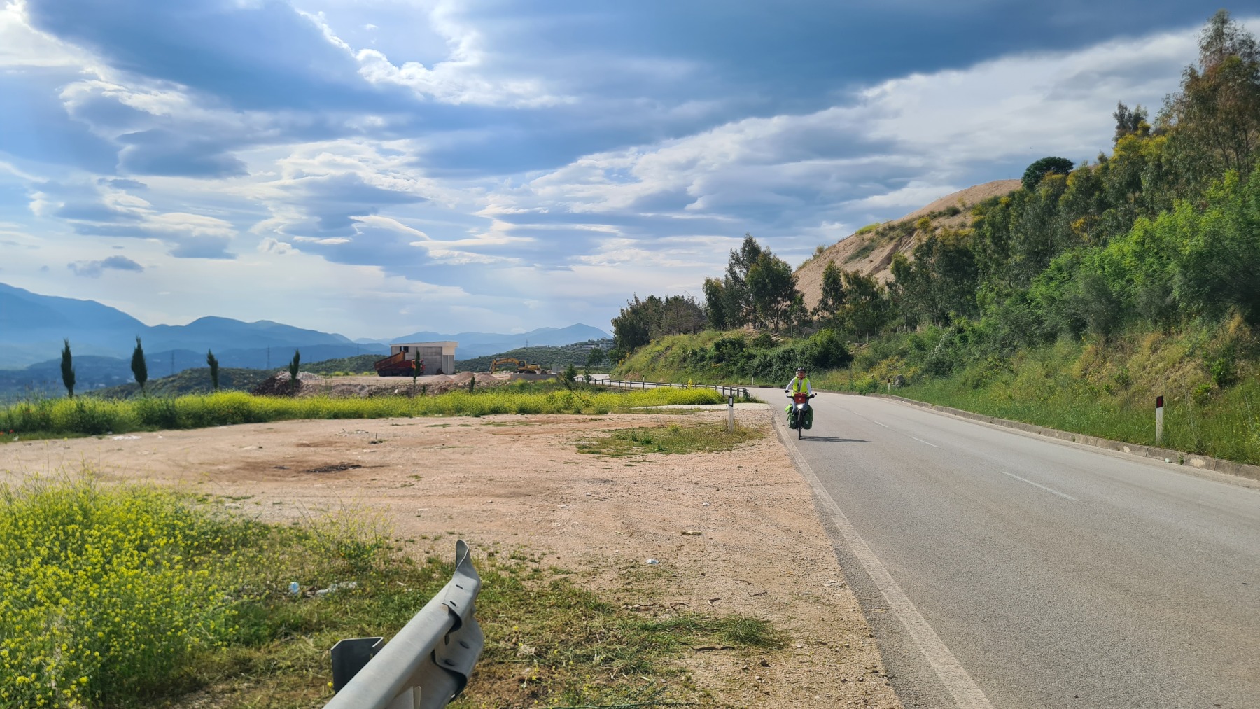 Nous avons suivi l’Eurovelo 8 (qui elle même suit la route du littoral « SH8 ») jusqu’au village de Piqeras où nous avons déjeuné. Au passage nous avons pu y voir des panoramas superbes sur les montagnes, sur la mer et sur l’ile de Corfou qui est encore toute proche mais aussi une vache, un troupeau de moutons, des ânes et un cyclotouriste allemand qui suit la même route en sens inverse.