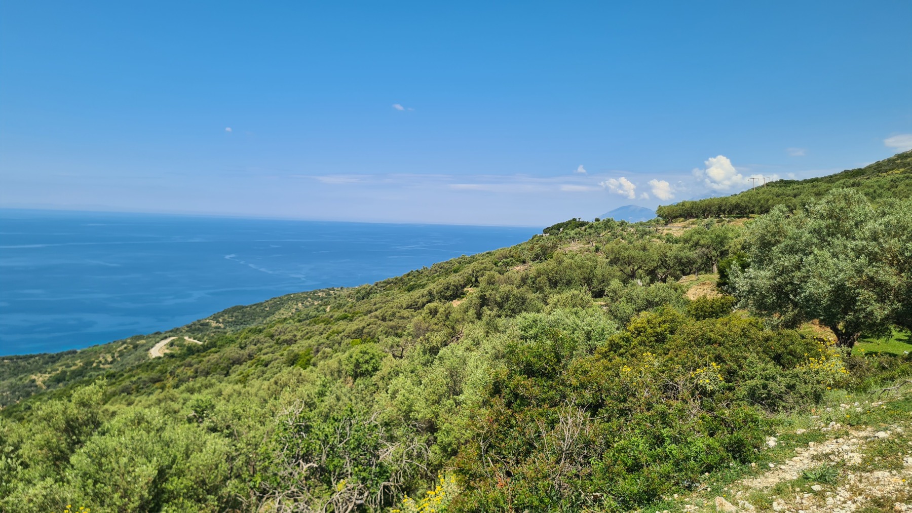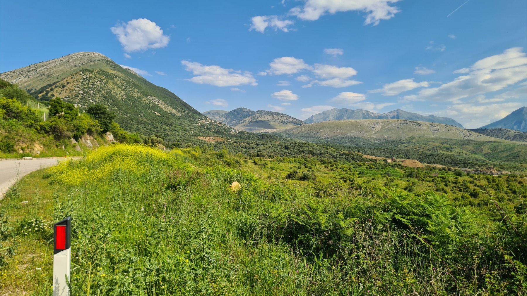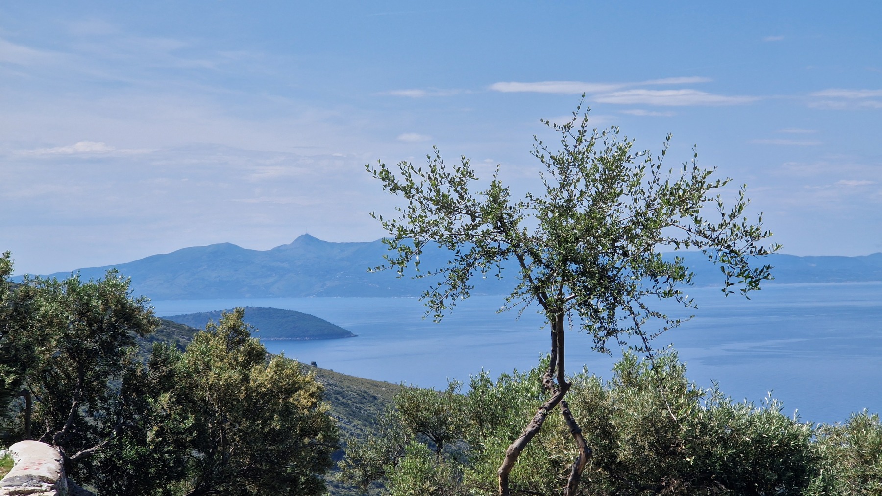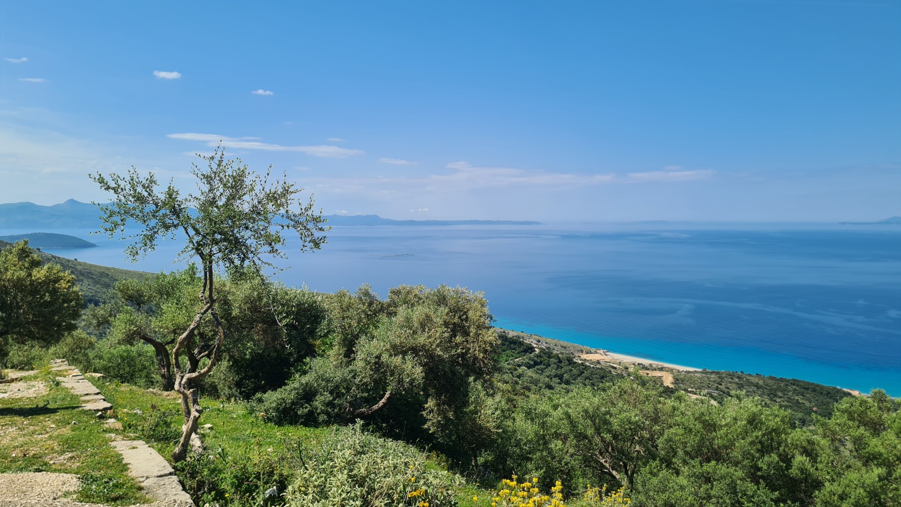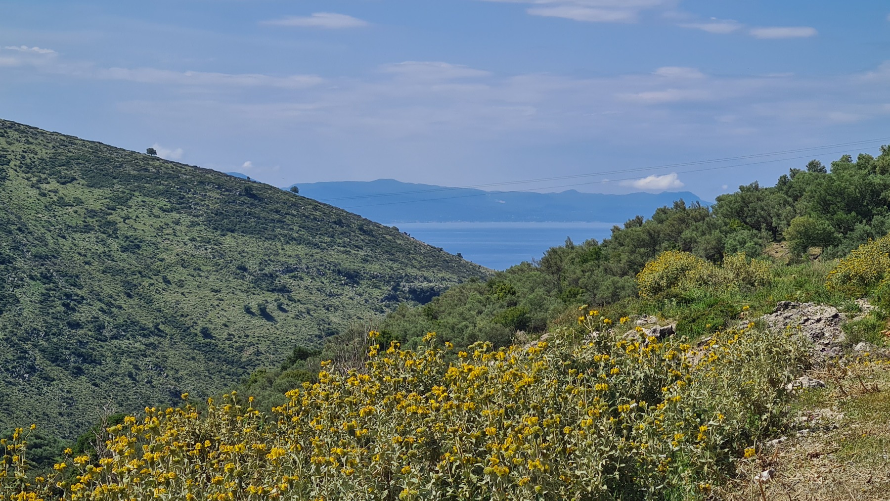 Nous avons suivi l’Eurovelo 8 (qui elle même suit la route du littoral « SH8 ») jusqu’au village de Piqeras où nous avons déjeuné. Au passage nous avons pu y voir des panoramas superbes sur les montagnes, sur la mer et sur l’ile de Corfou qui est encore toute proche mais aussi une vache, un troupeau de moutons, des ânes et un cyclotouriste allemand qui suit la même route en sens inverse.