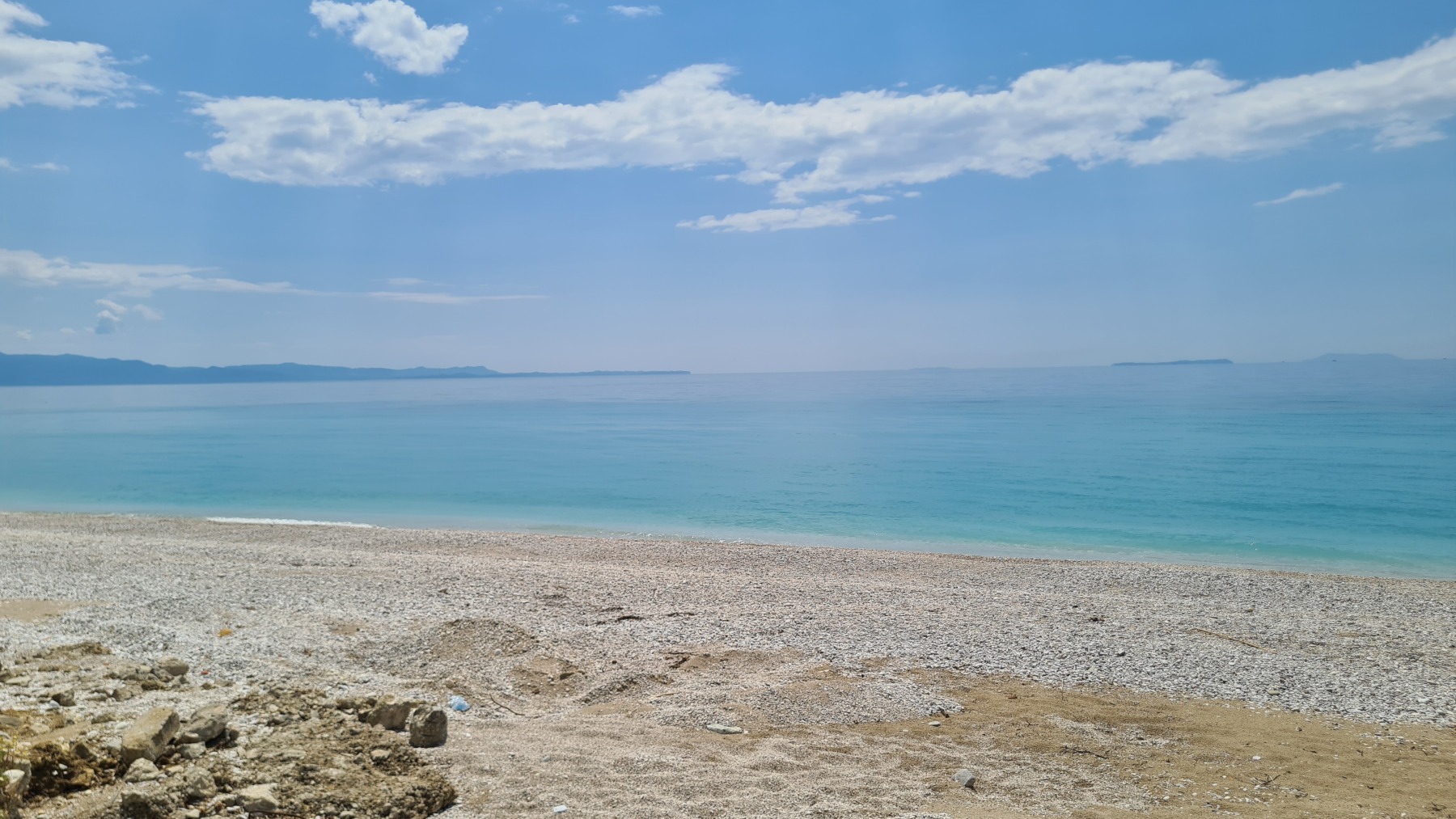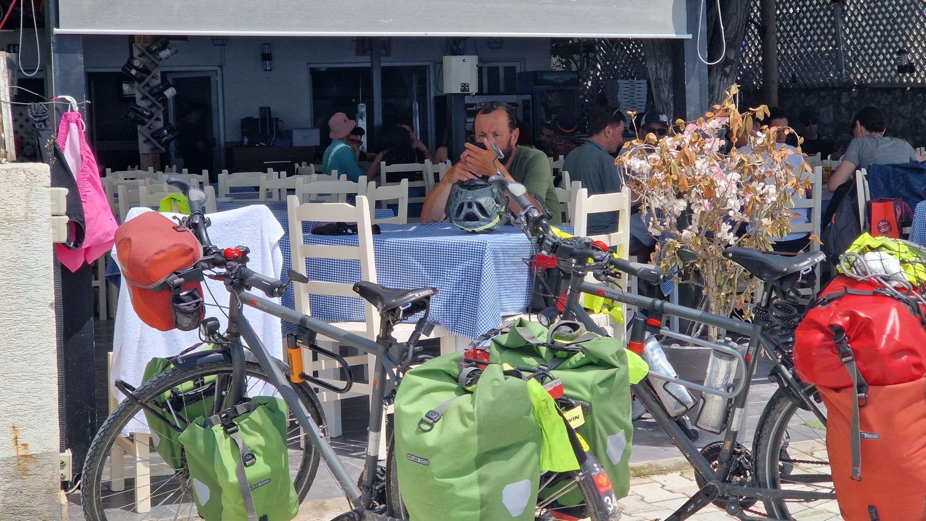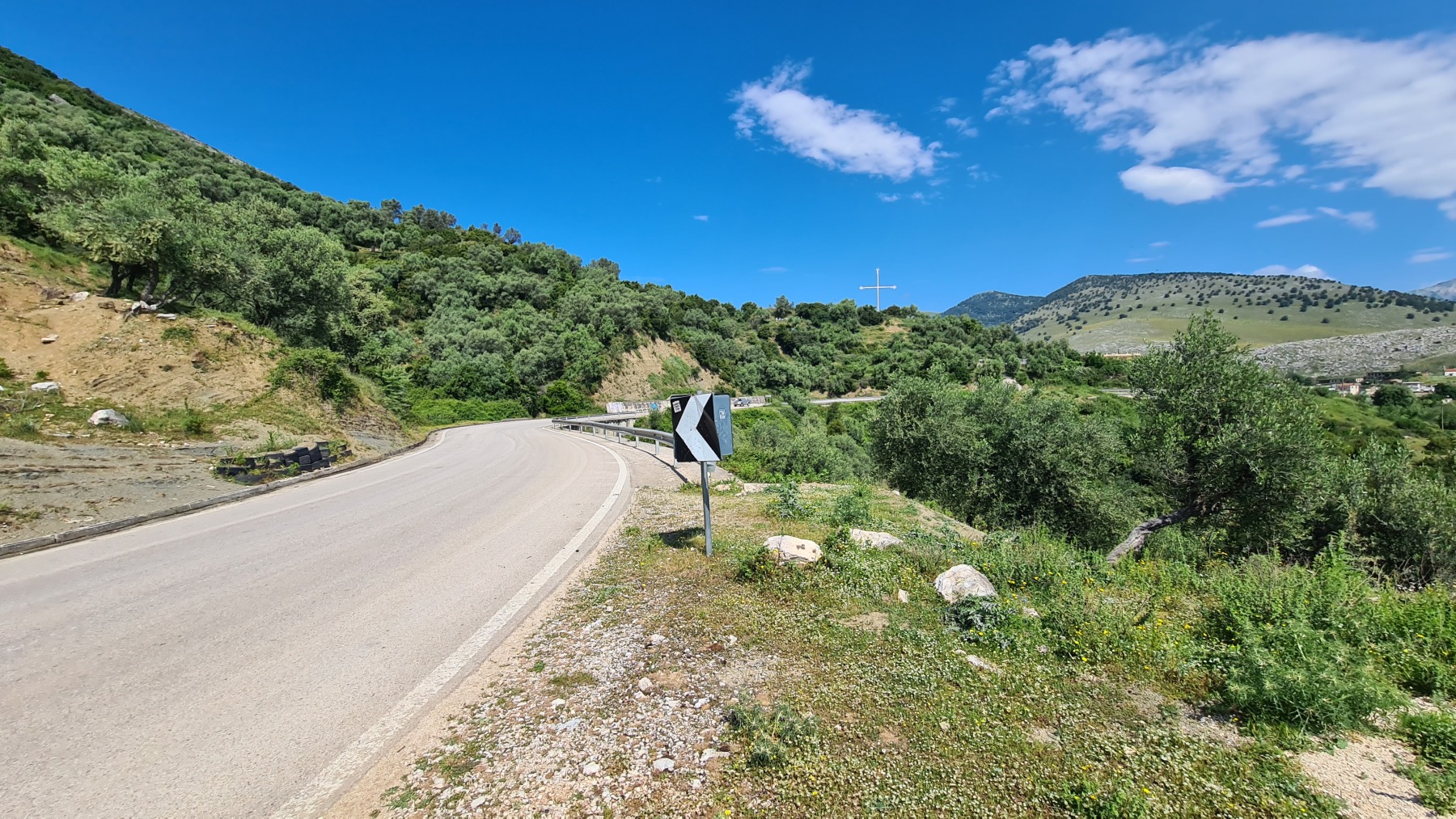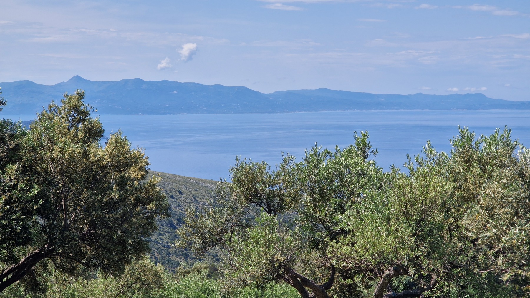 Nous avons suivi l’Eurovelo 8 (qui elle même suit la route du littoral « SH8 ») jusqu’au village de Piqeras où nous avons déjeuné. Au passage nous avons pu y voir des panoramas superbes sur les montagnes, sur la mer et sur l’ile de Corfou qui est encore toute proche mais aussi une vache, un troupeau de moutons, des ânes et un cyclotouriste allemand qui suit la même route en sens inverse.
