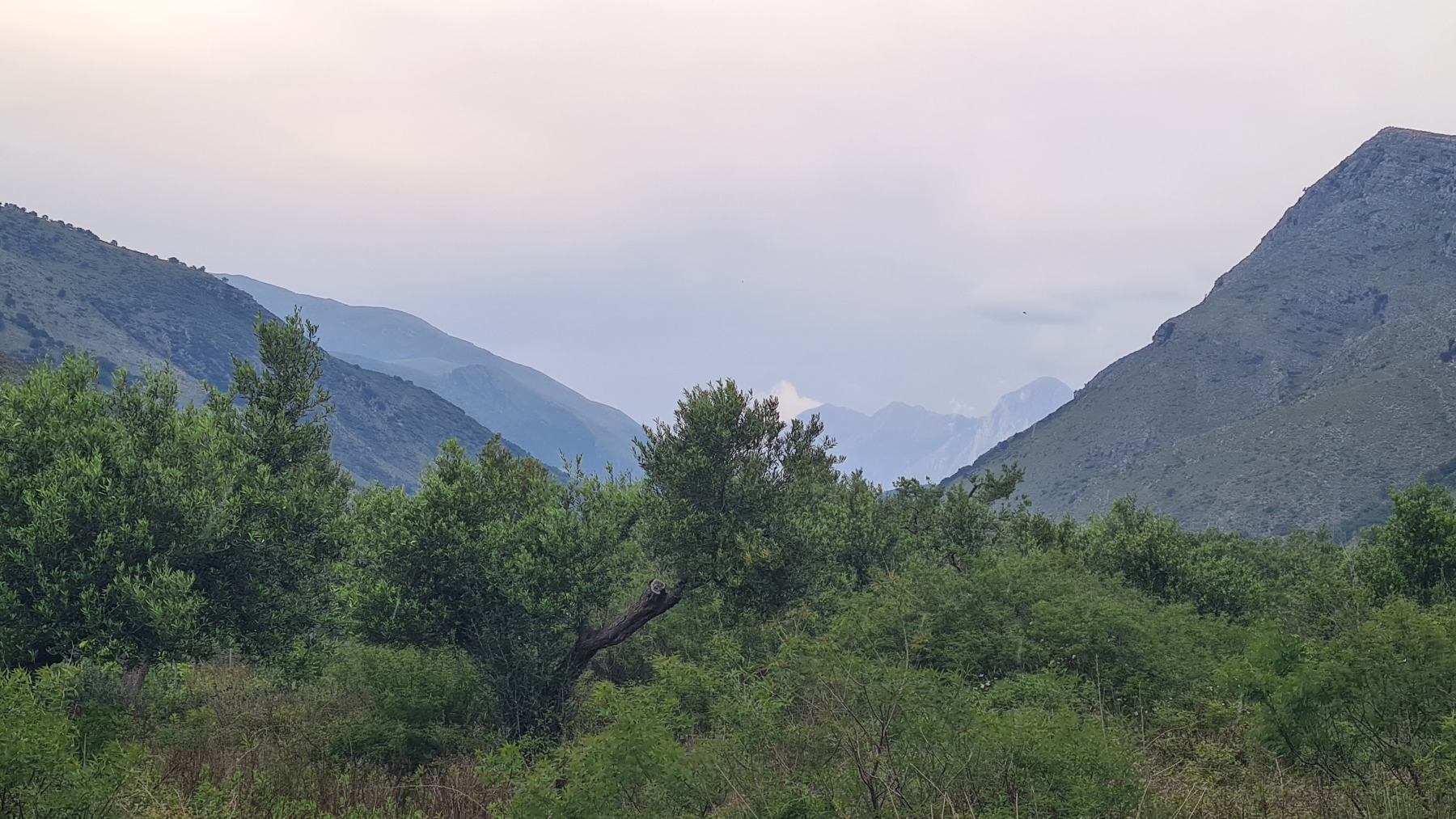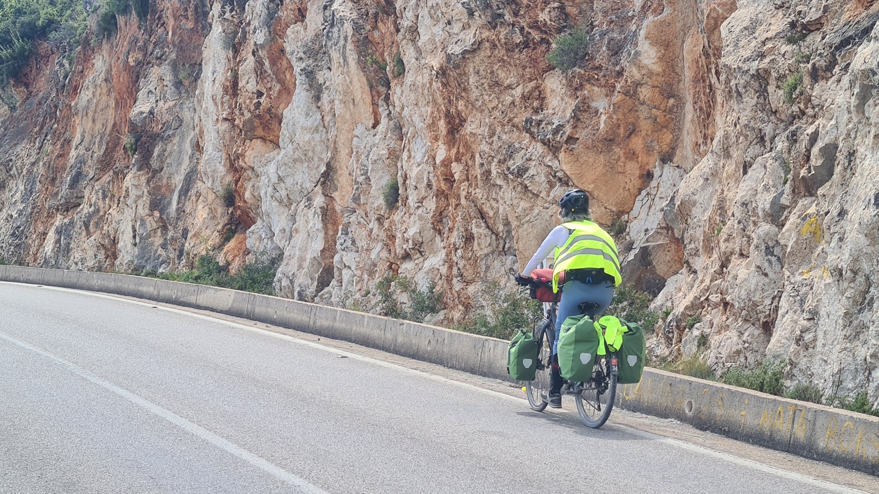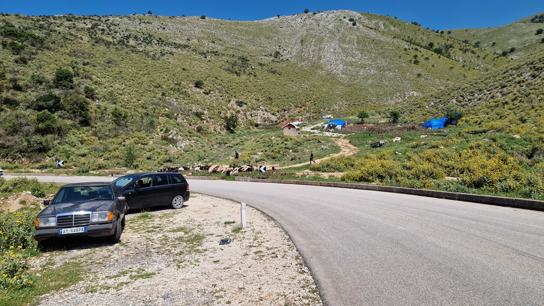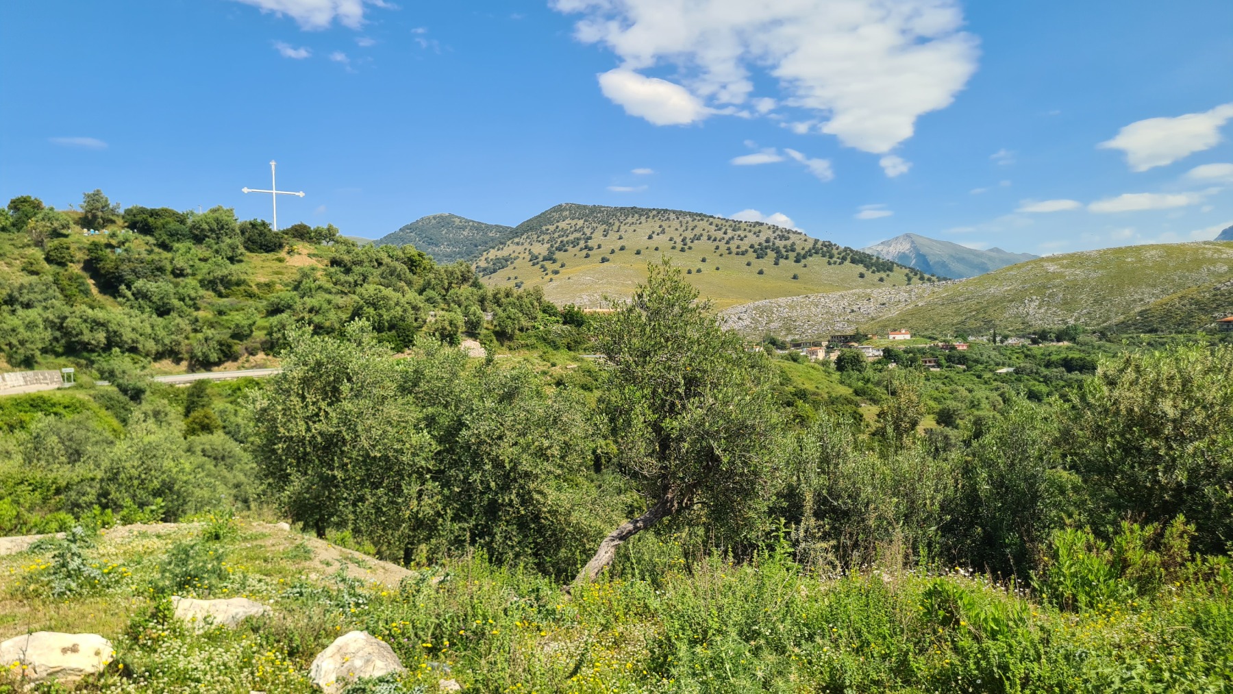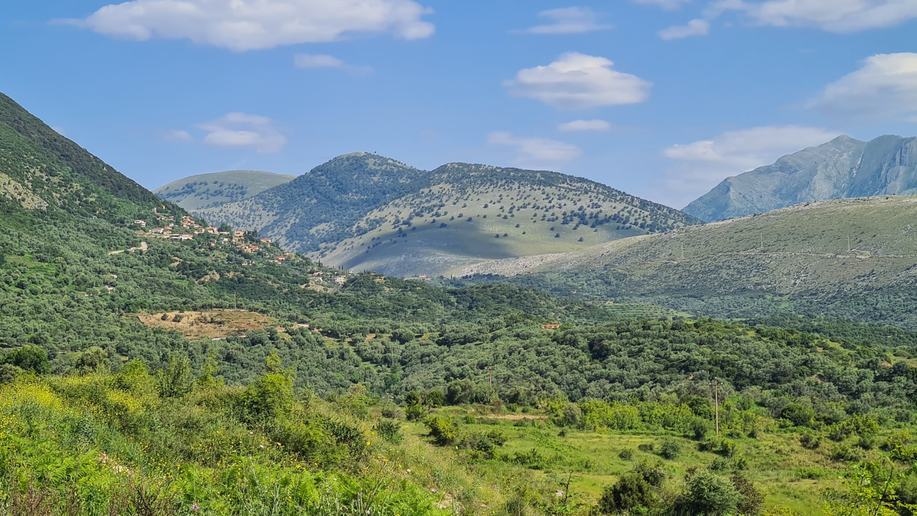 Nous avons suivi l’Eurovelo 8 (qui elle même suit la route du littoral « SH8 ») jusqu’au village de Piqeras où nous avons déjeuné. Au passage nous avons pu y voir des panoramas superbes sur les montagnes, sur la mer et sur l’ile de Corfou qui est encore toute proche mais aussi une vache, un troupeau de moutons, des ânes et un cyclotouriste allemand qui suit la même route en sens inverse.
