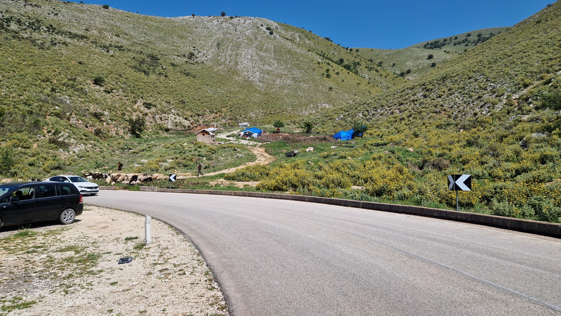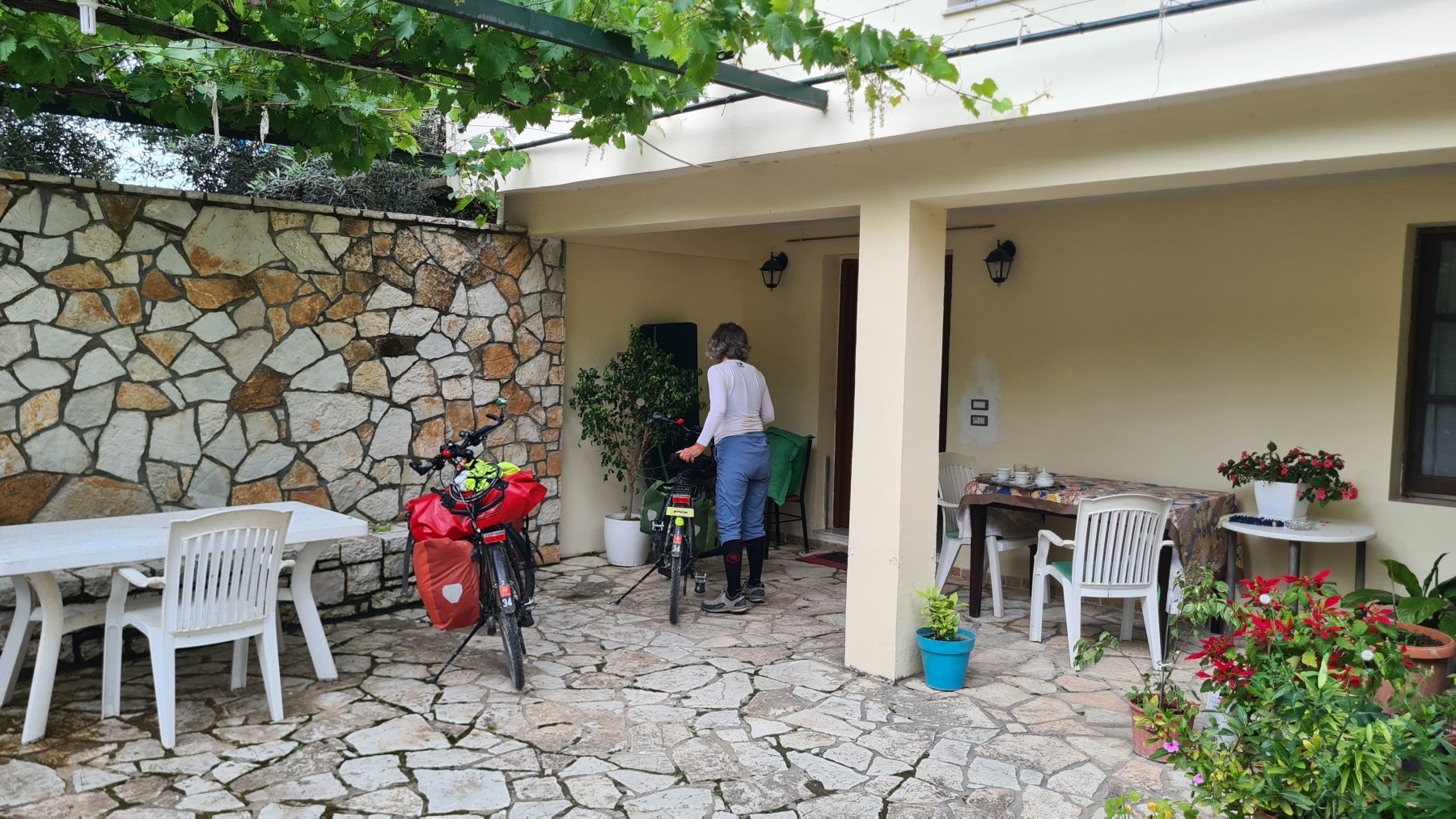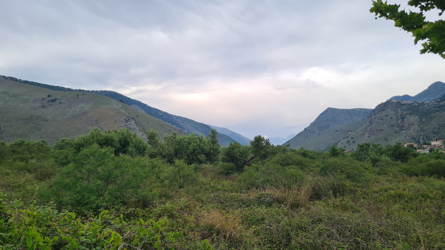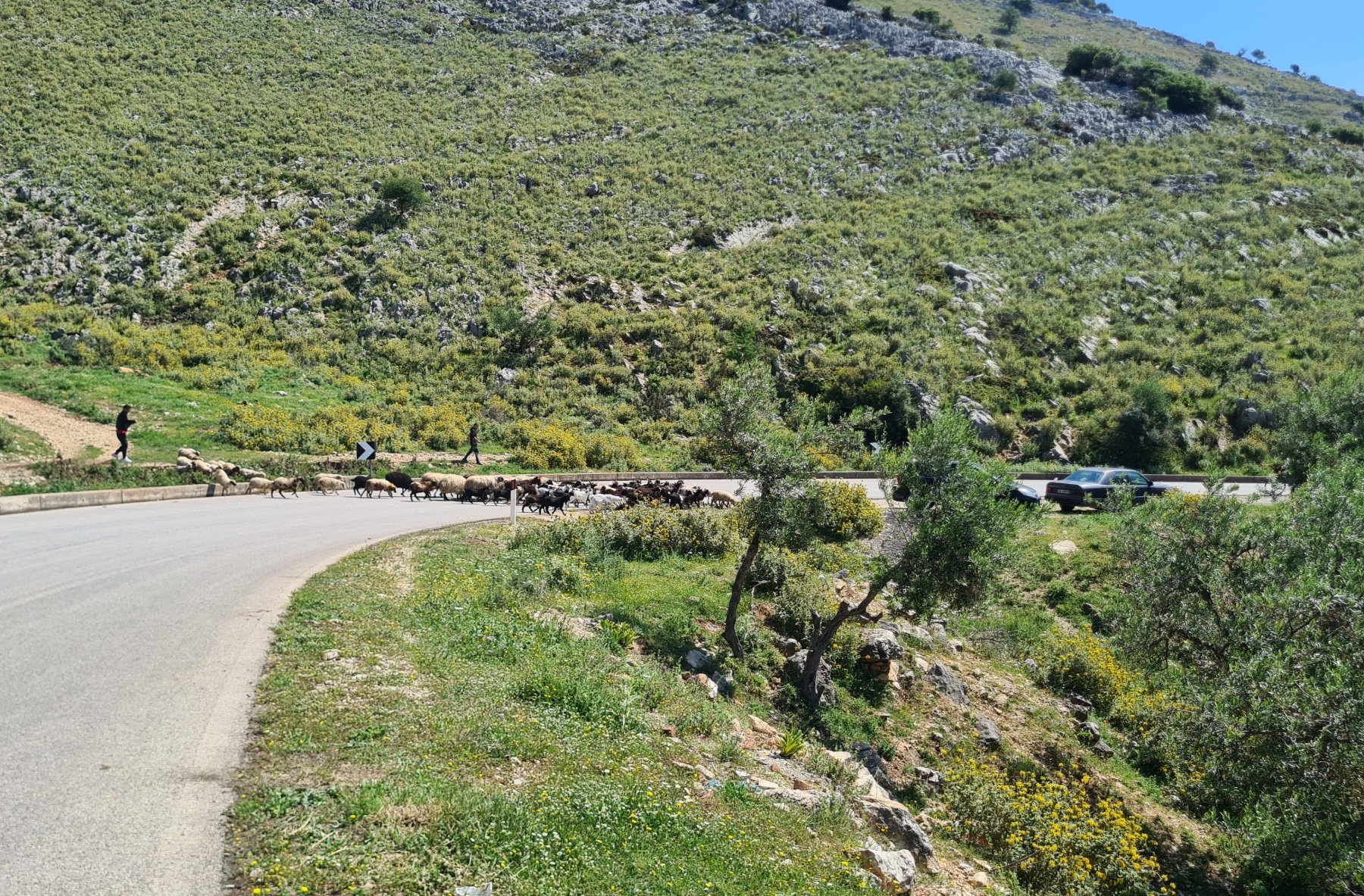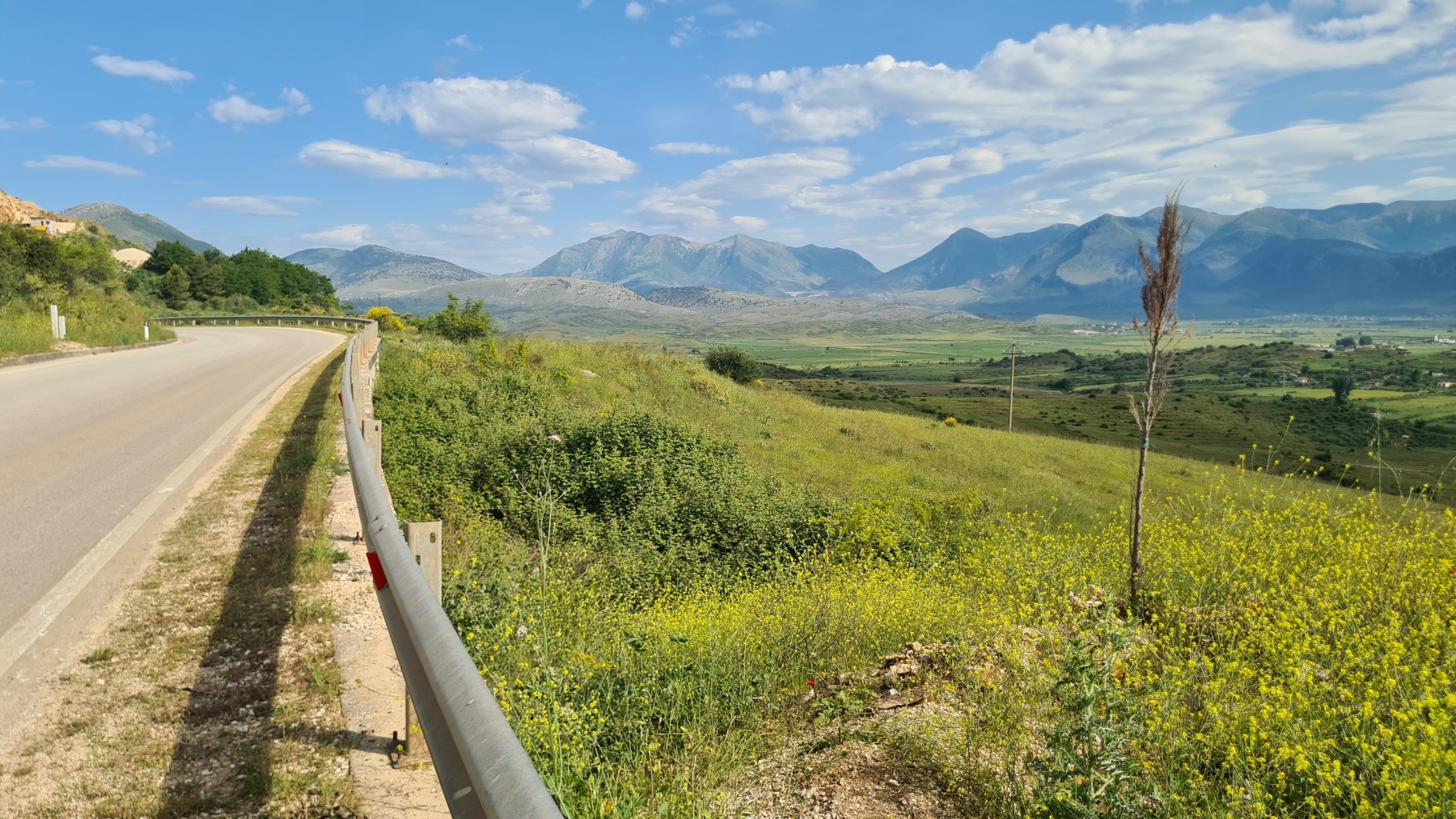 Nous avons suivi l’Eurovelo 8 (qui elle même suit la route du littoral « SH8 ») jusqu’au village de Piqeras où nous avons déjeuné. Au passage nous avons pu y voir des panoramas superbes sur les montagnes, sur la mer et sur l’ile de Corfou qui est encore toute proche mais aussi une vache, un troupeau de moutons, des ânes et un cyclotouriste allemand qui suit la même route en sens inverse.
