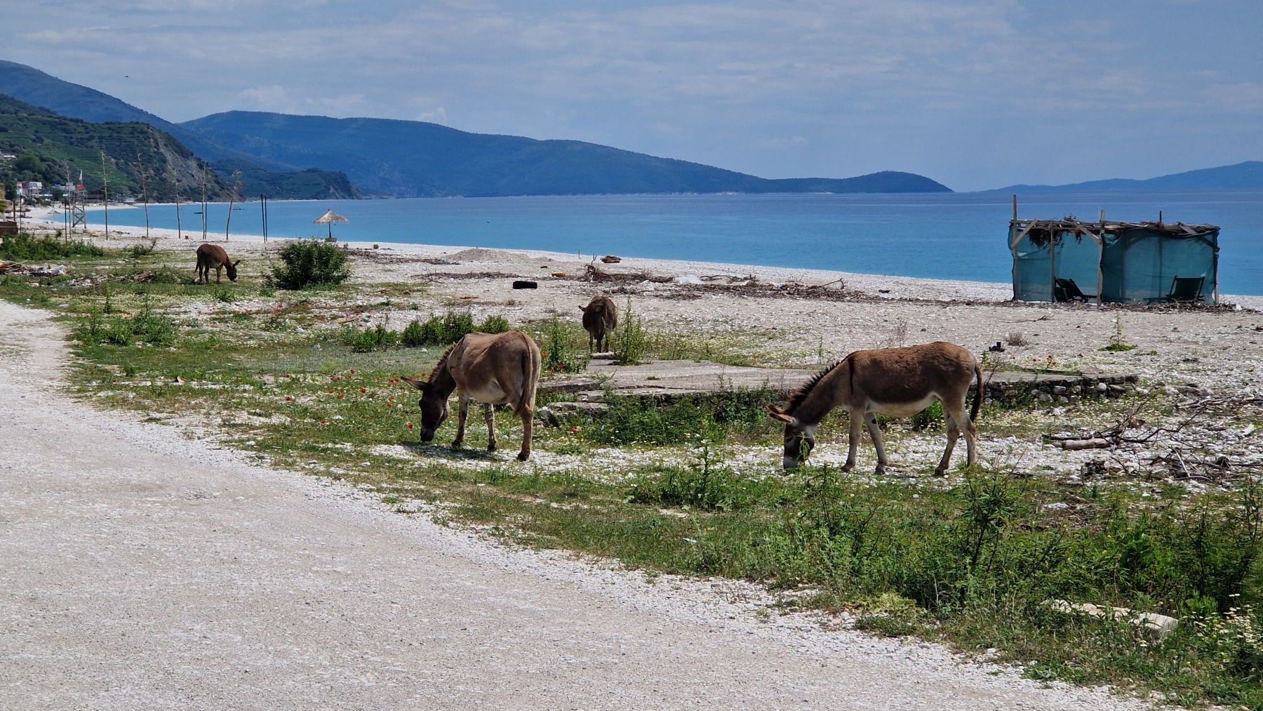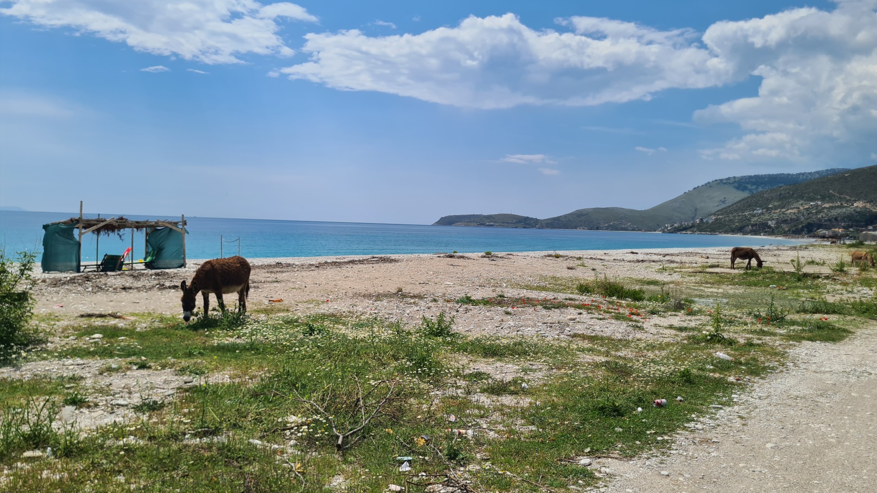 Après le déjeuner, Gisèle nous a trouvé une variante qui descend à la plage de Borsh par une piste un peu « gravel » pour suivre la plage où on trouve quelques touristes mais aussi des vaches et des ânes.