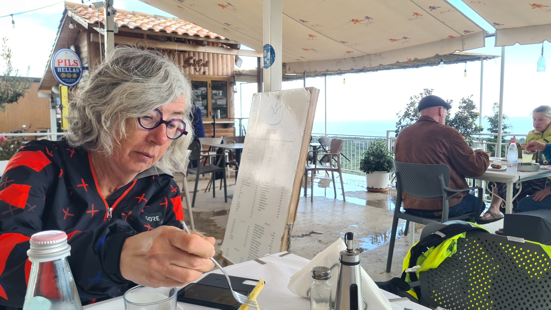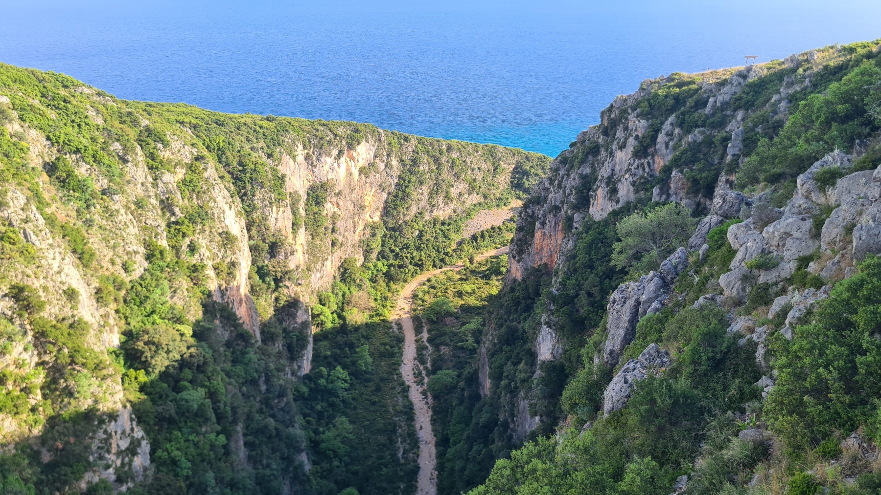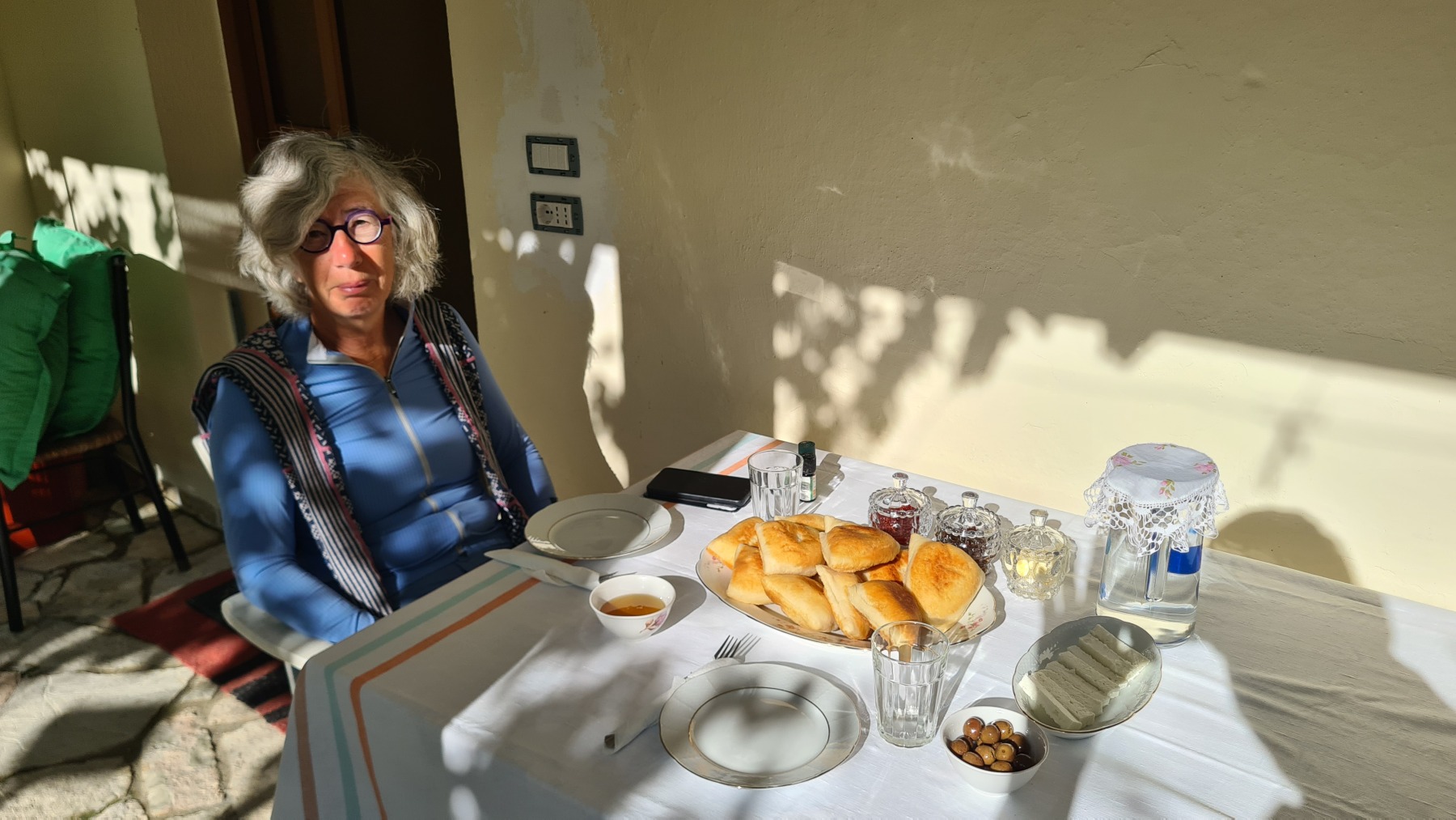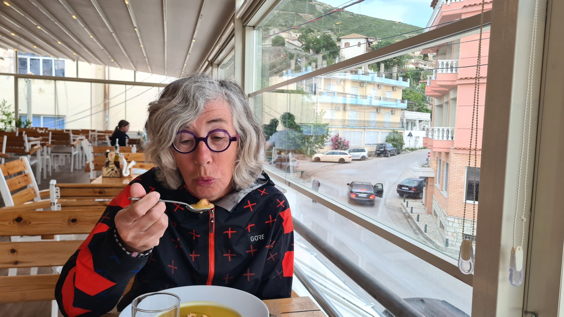 Ce soir nous dormons dans un Airnb dans le hameau d’Ilias, un hameau de quelques maisons au dessus du ravin et de la plage de Gjipe. Nous y avons été accueilli par la mère du propriétaire qui ne parle ni anglais ni français et compense par beaucoup de gentillesse. Elle nous a offert un café (turc) et deux petits verres d’une boisson transparente. Gisèle qui a cru que c’était de l’eau a failli s’étouffer en avalant une rasade de raki.