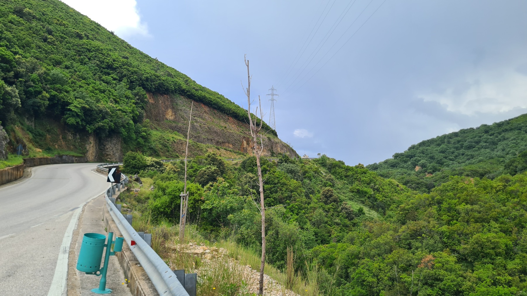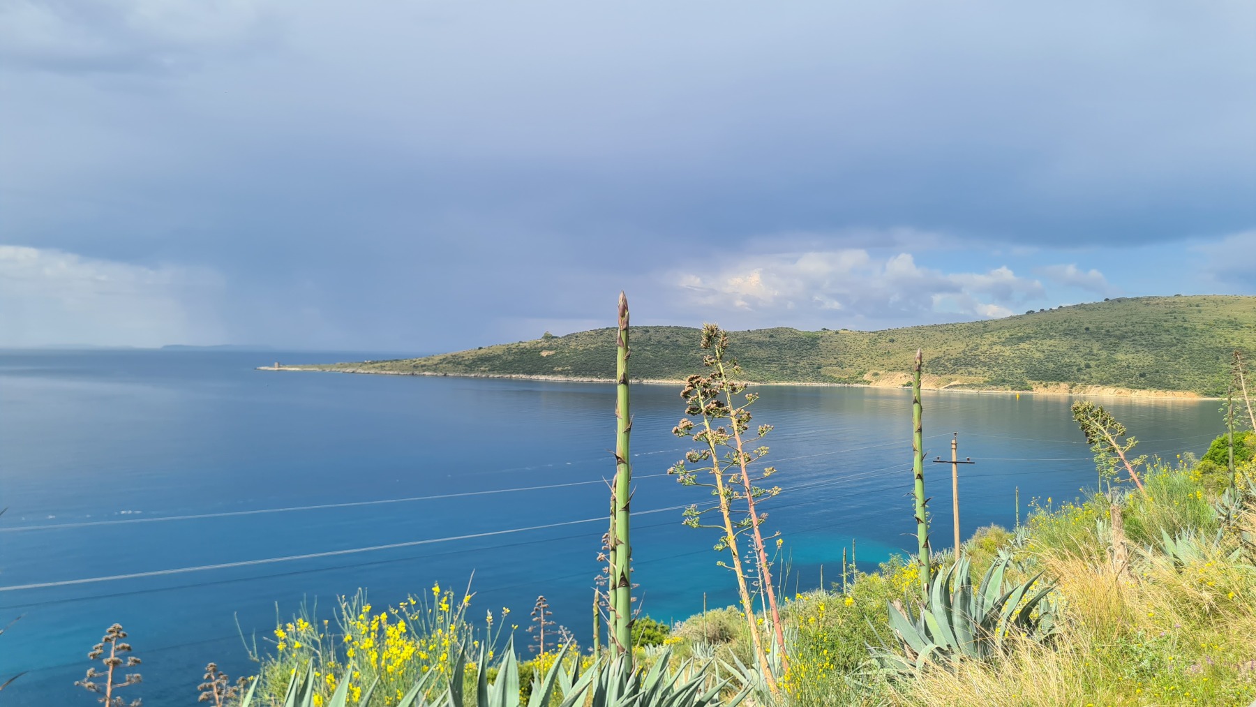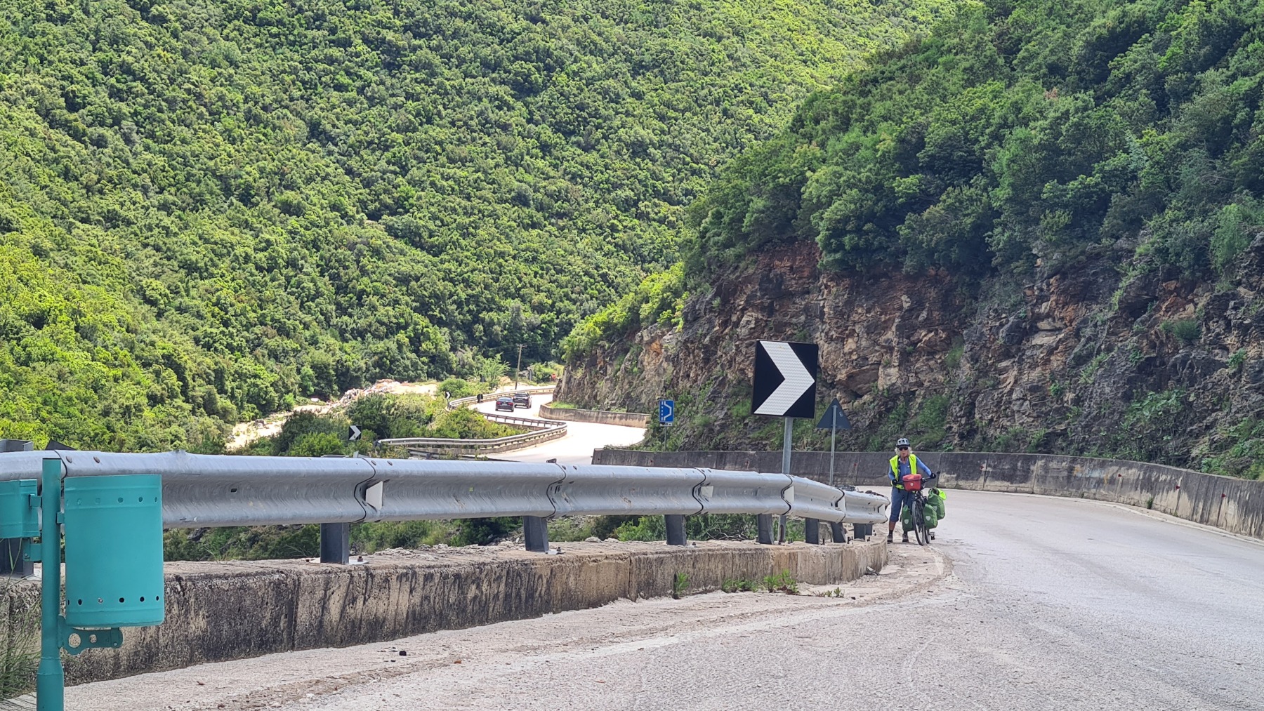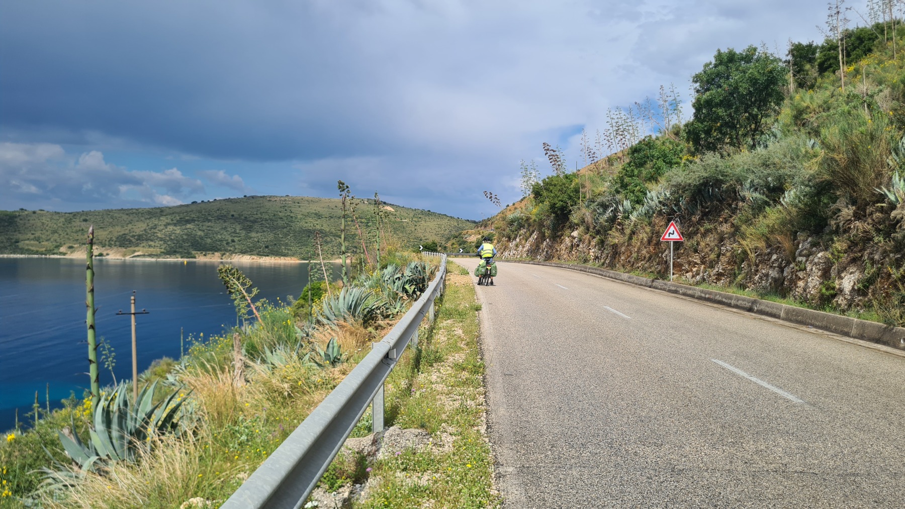 La météo étant de plus en plus menaçante et prévoyant des risques d’orages toute la journée j’avais prévu une nouvelle étape assez courte. On a eu une première alerte avec quelques goutes quelques kilomètres après le départ juste en face du château de Porto Palermo et on a trouvé refuge dans un café judicieusement placé.