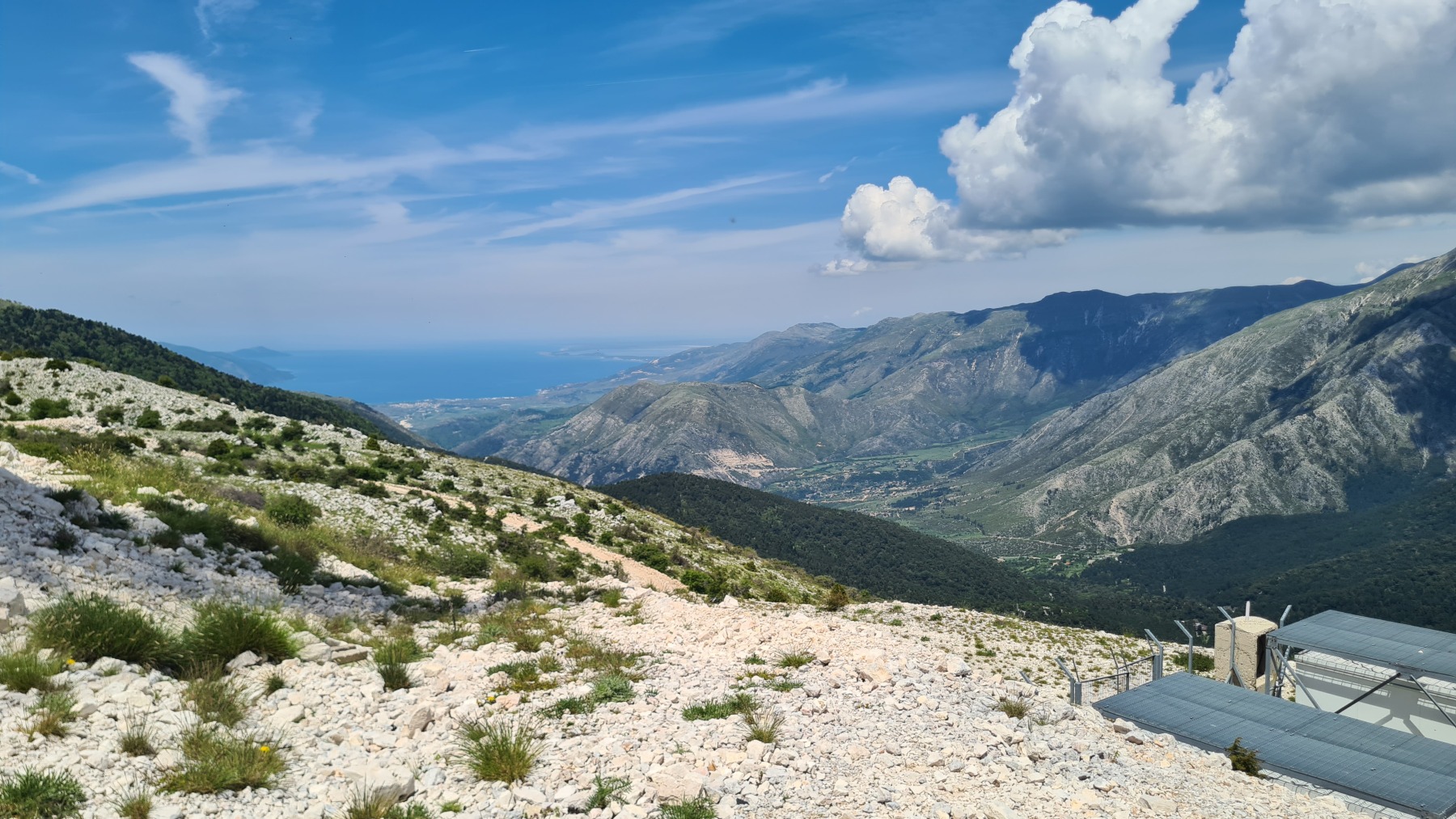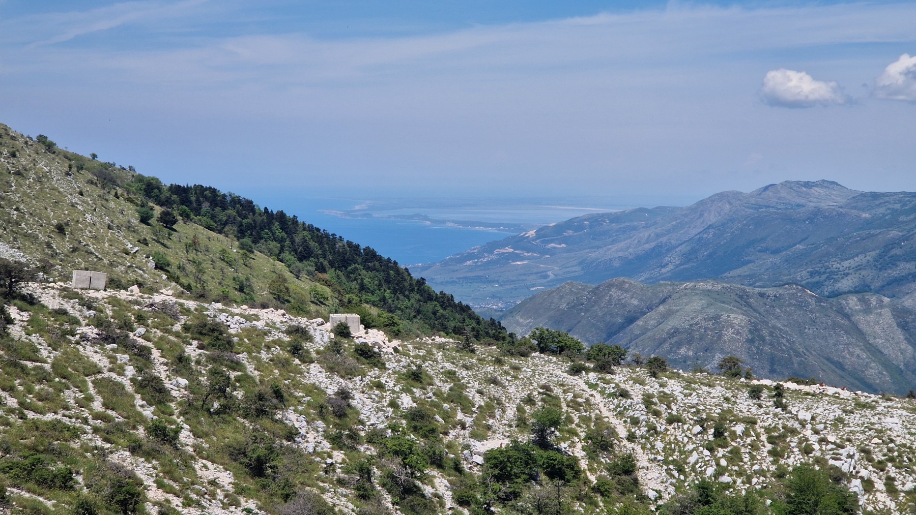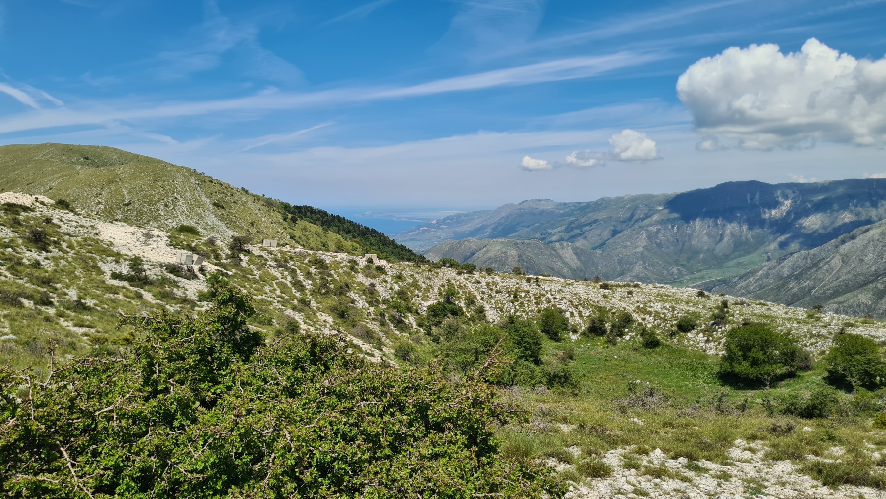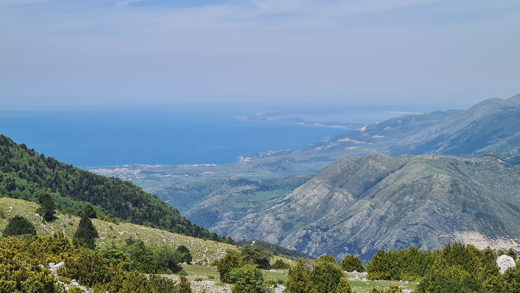 La randonnée s’est avérée bien agréable. Elle débute par une belle montée dans la forêt avant de déboucher sur le col de Thellë et sa vue sur la mer et la montagne (il y a plusieurs sommets à plus de 2000 m très proches de la mer). Elle se poursuit sur un sentier alternant crêtes et balcons jusqu’au Maja Thanasit, défiguré, il est vrai, par ses antennes qui surplombe la mer de ses 1352 m. Le retour se fait par la piste d’accès aux antennes qui nous descend jusqu’au col de Llogara, lieu de nos exploits d’hier que l’on voit très bien de la piste (ainsi que le chantier du tunnel qui permettra aux camions d’éviter la route du col), puis par la route et un sentier jusqu’à notre bungalow.
