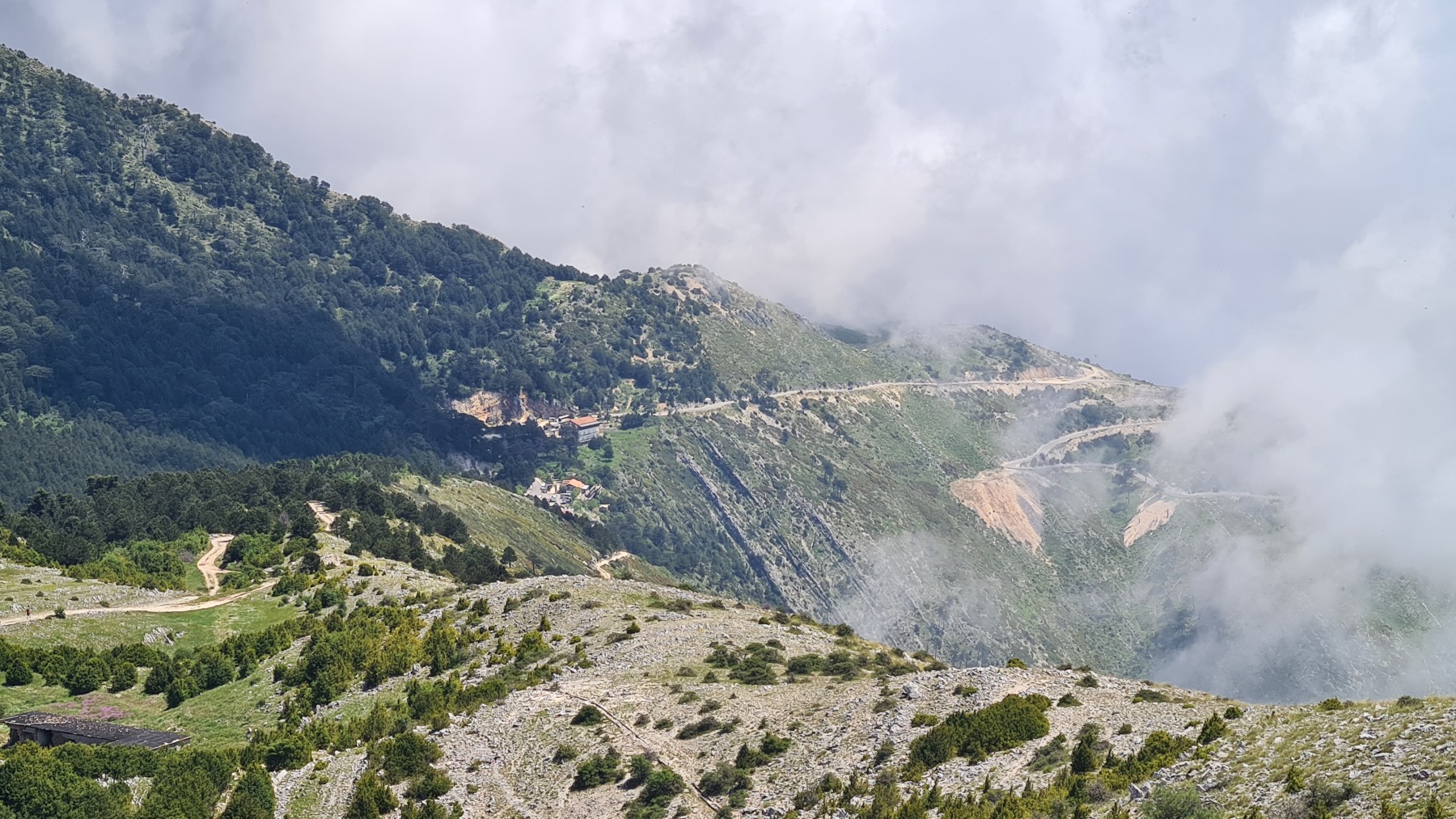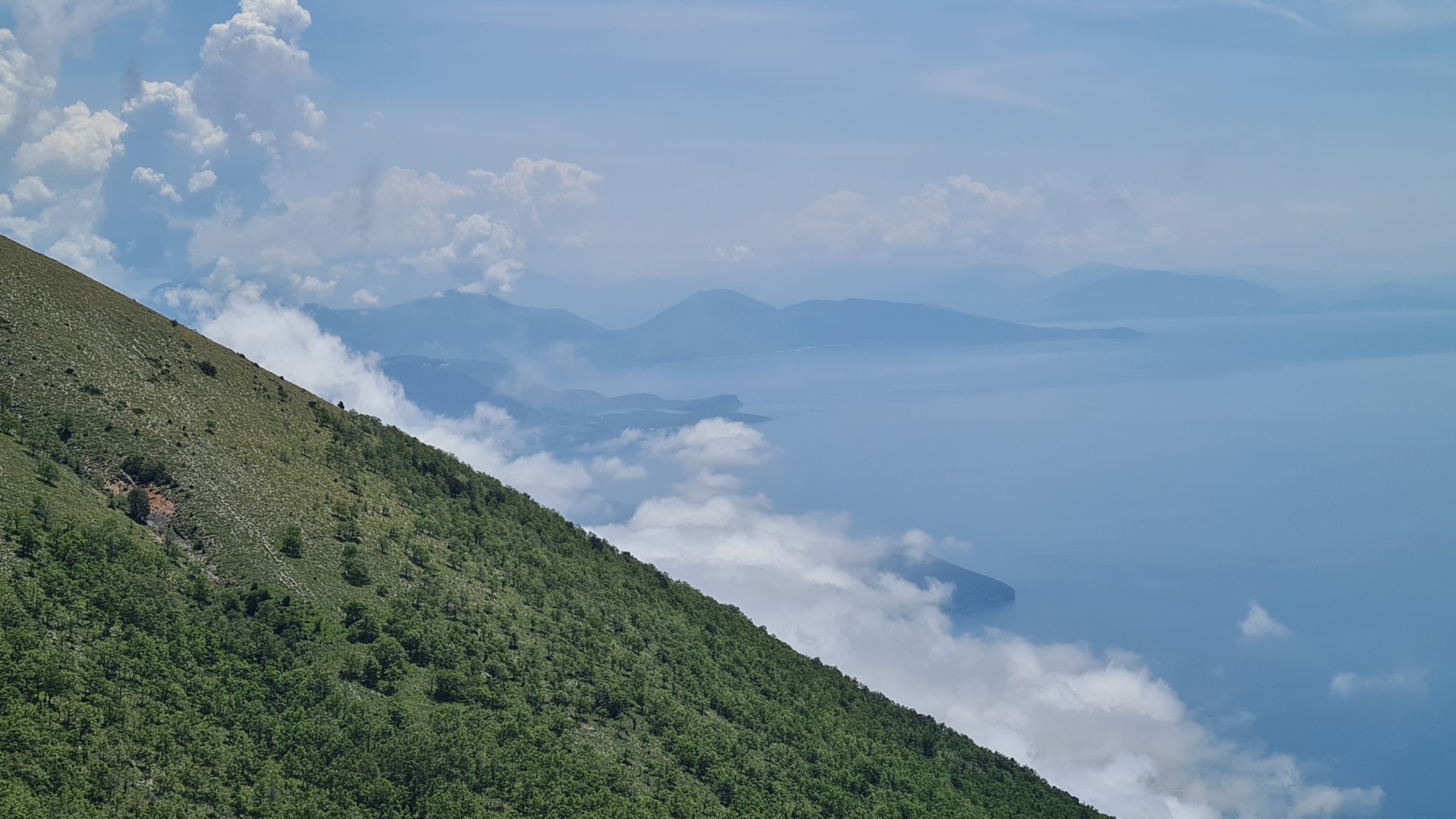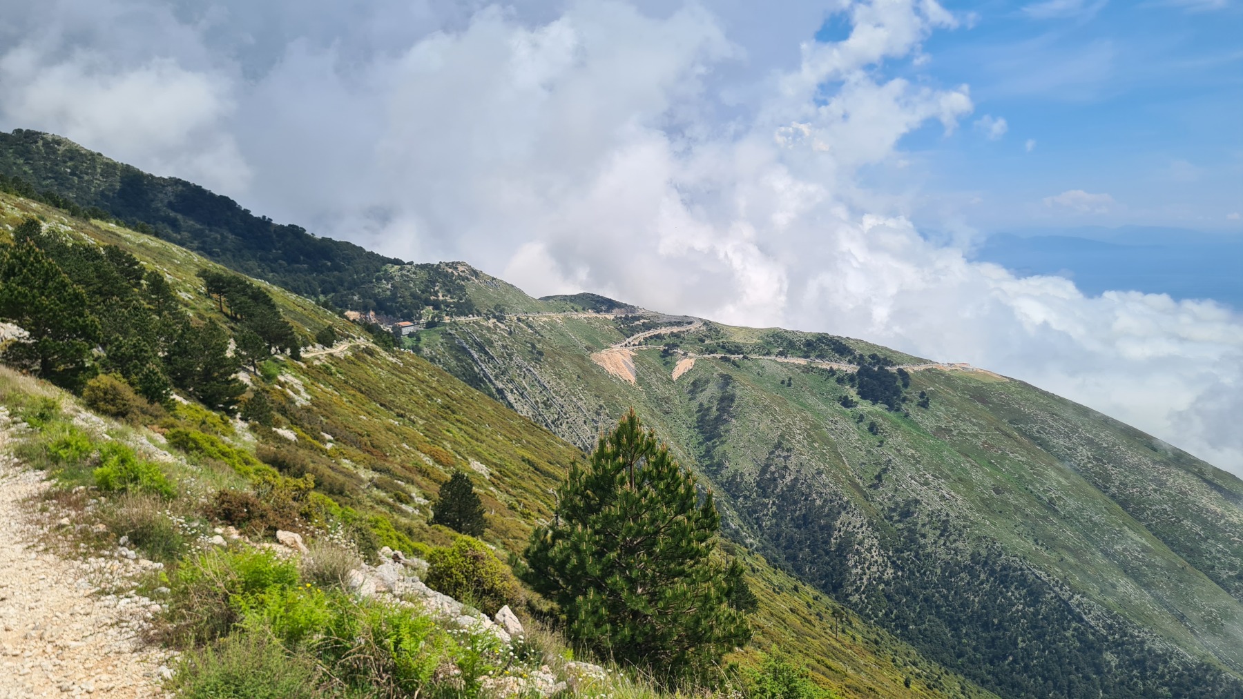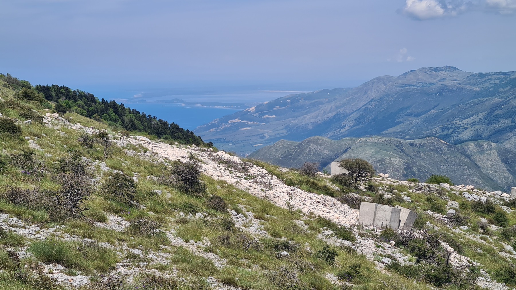 La randonnée s’est avérée bien agréable. Elle débute par une belle montée dans la forêt avant de déboucher sur le col de Thellë et sa vue sur la mer et la montagne (il y a plusieurs sommets à plus de 2000 m très proches de la mer). Elle se poursuit sur un sentier alternant crêtes et balcons jusqu’au Maja Thanasit, défiguré, il est vrai, par ses antennes qui surplombe la mer de ses 1352 m. Le retour se fait par la piste d’accès aux antennes qui nous descend jusqu’au col de Llogara, lieu de nos exploits d’hier que l’on voit très bien de la piste (ainsi que le chantier du tunnel qui permettra aux camions d’éviter la route du col), puis par la route et un sentier jusqu’à notre bungalow.