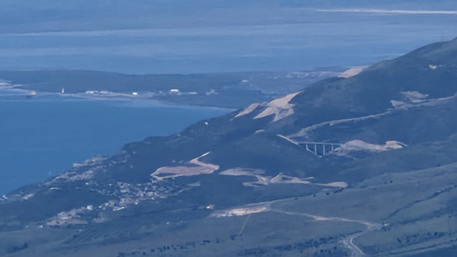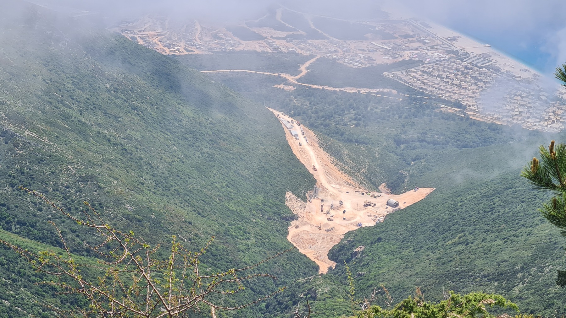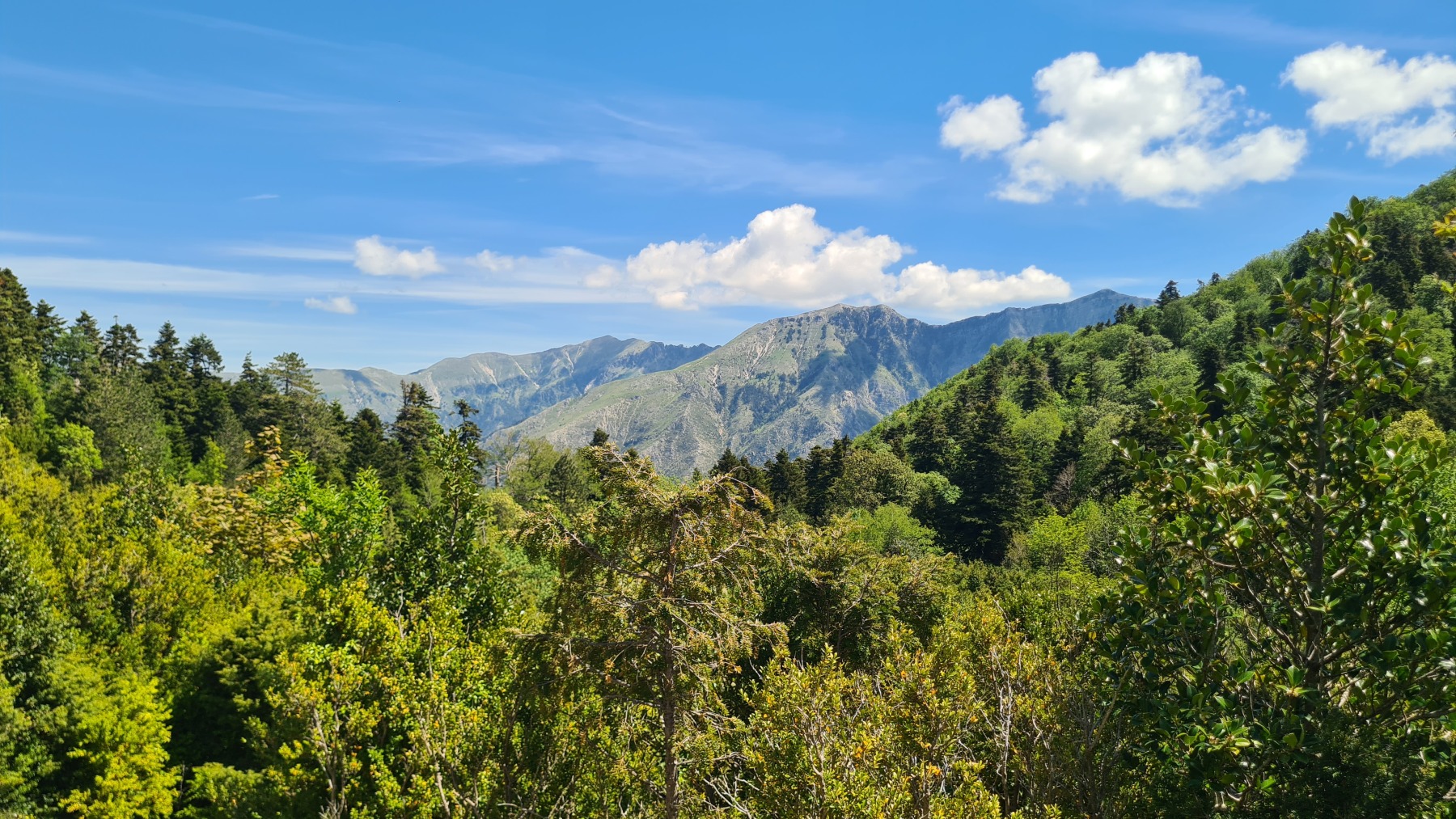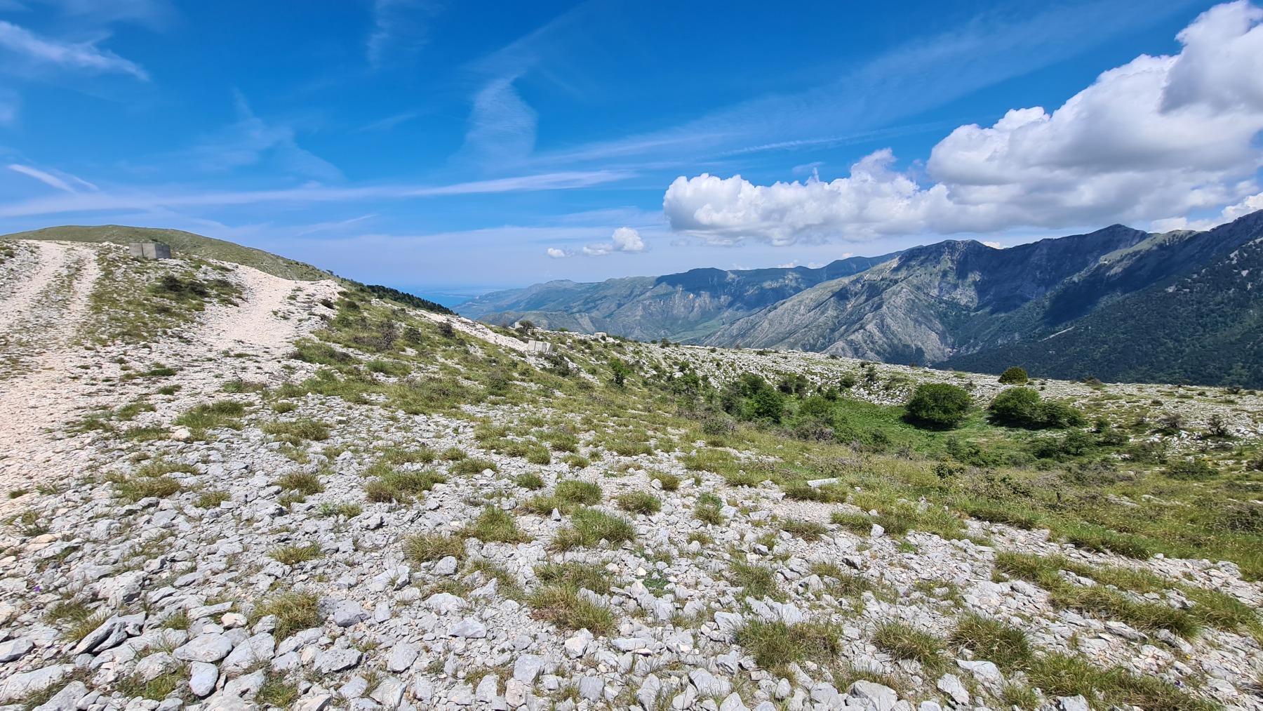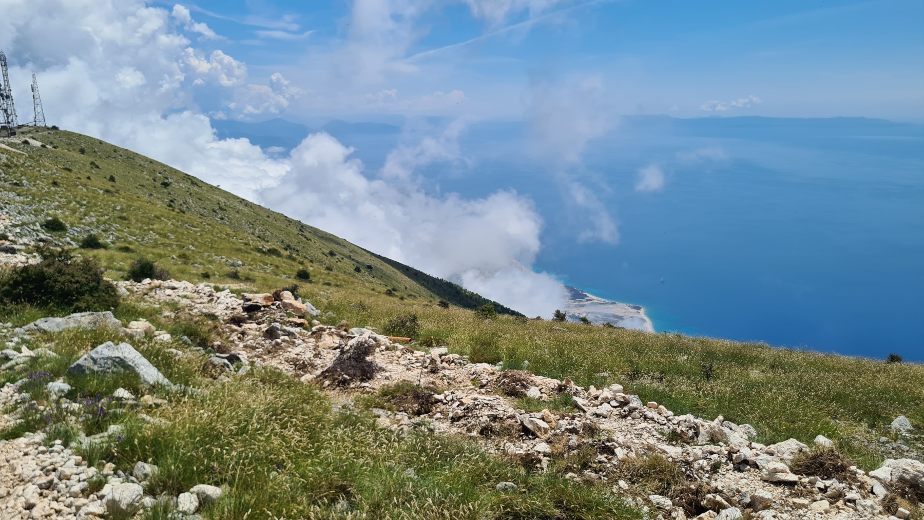 La randonnée s’est avérée bien agréable. Elle débute par une belle montée dans la forêt avant de déboucher sur le col de Thellë et sa vue sur la mer et la montagne (il y a plusieurs sommets à plus de 2000 m très proches de la mer). Elle se poursuit sur un sentier alternant crêtes et balcons jusqu’au Maja Thanasit, défiguré, il est vrai, par ses antennes qui surplombe la mer de ses 1352 m. Le retour se fait par la piste d’accès aux antennes qui nous descend jusqu’au col de Llogara, lieu de nos exploits d’hier que l’on voit très bien de la piste (ainsi que le chantier du tunnel qui permettra aux camions d’éviter la route du col), puis par la route et un sentier jusqu’à notre bungalow.