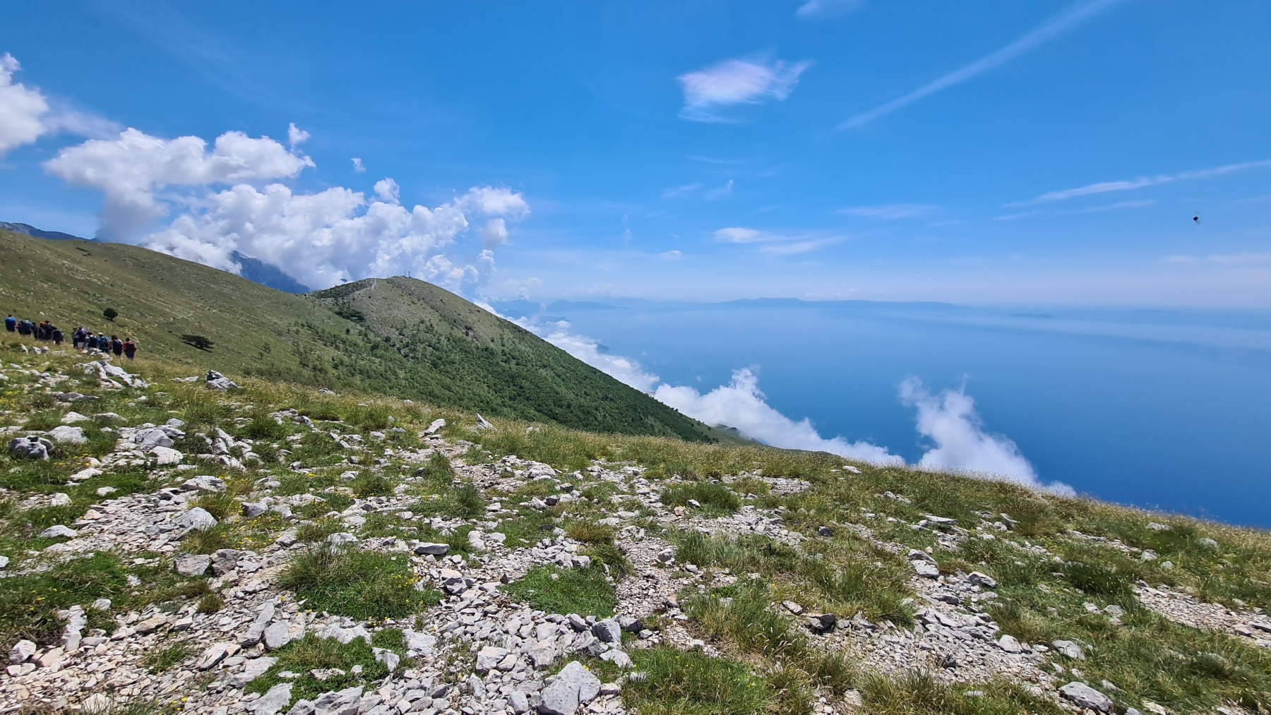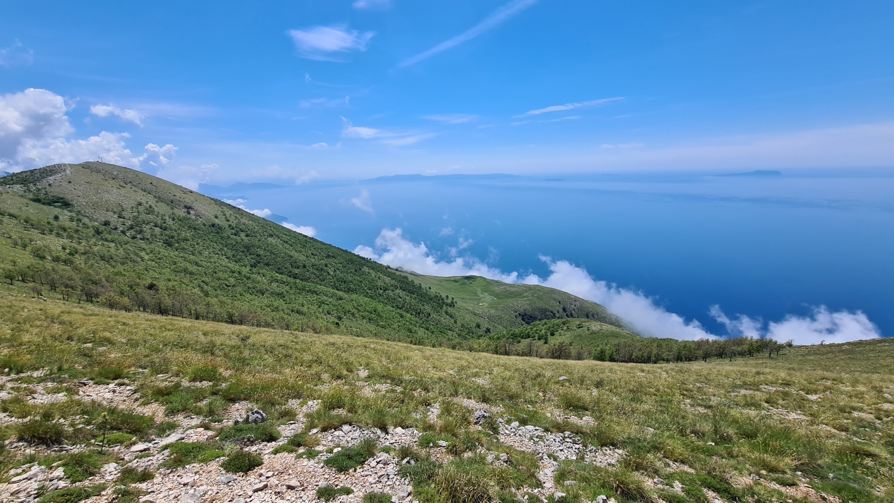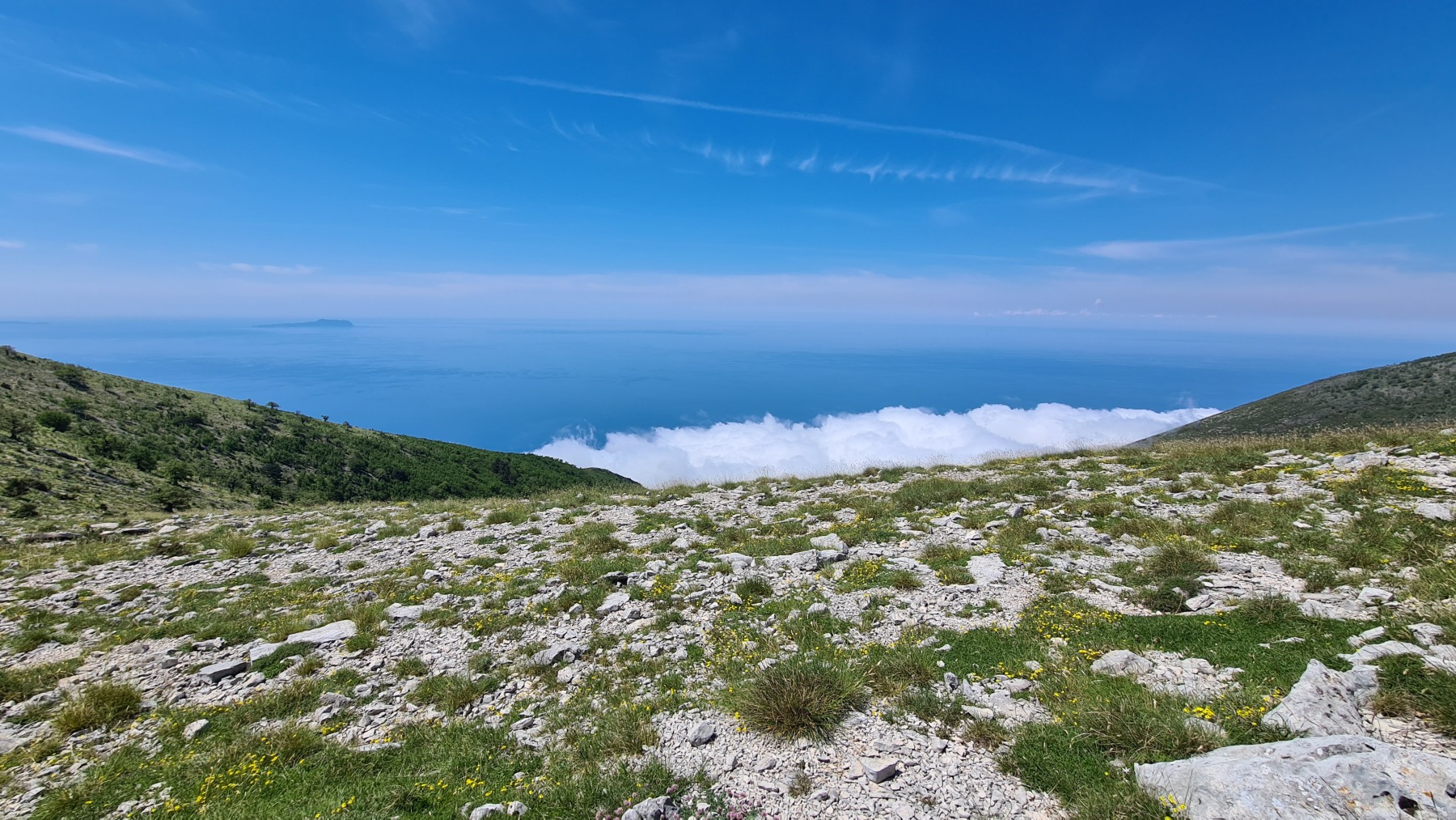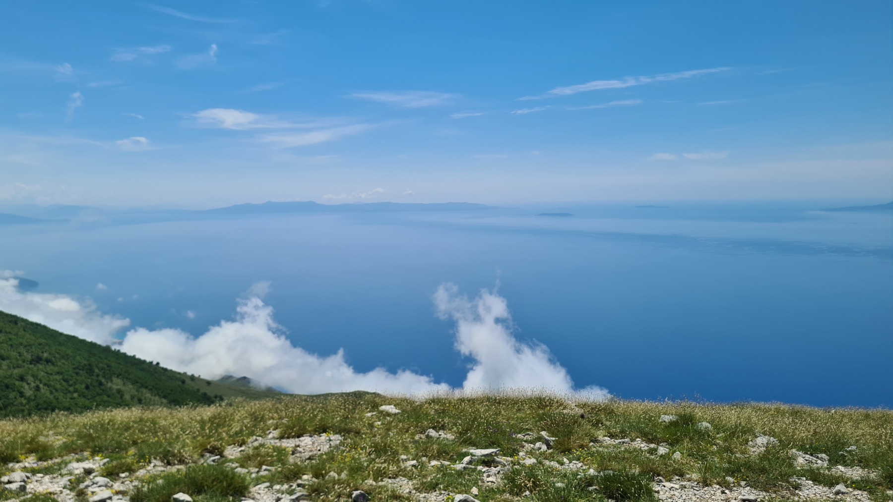 La randonnée s’est avérée bien agréable. Elle débute par une belle montée dans la forêt avant de déboucher sur le col de Thellë et sa vue sur la mer et la montagne (il y a plusieurs sommets à plus de 2000 m très proches de la mer). Elle se poursuit sur un sentier alternant crêtes et balcons jusqu’au Maja Thanasit, défiguré, il est vrai, par ses antennes qui surplombe la mer de ses 1352 m. Le retour se fait par la piste d’accès aux antennes qui nous descend jusqu’au col de Llogara, lieu de nos exploits d’hier que l’on voit très bien de la piste (ainsi que le chantier du tunnel qui permettra aux camions d’éviter la route du col), puis par la route et un sentier jusqu’à notre bungalow.