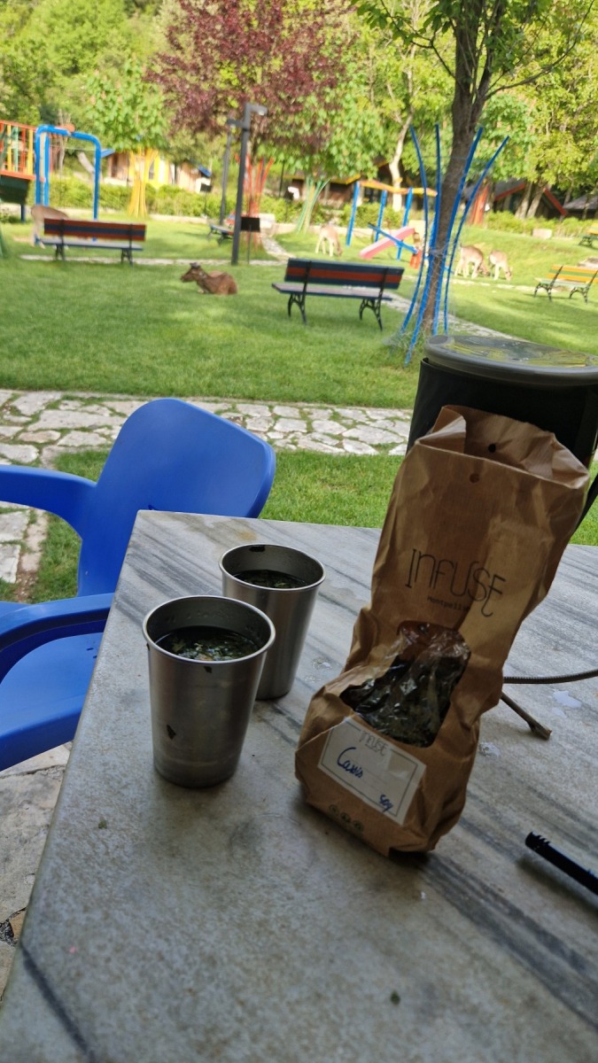 De retour à notre bungalow, j’ai fait bouillir de l’eau (il est conseillé de se méfier de l’eau du robinet en Albanie) et en ai profité pour nous préparer une petite tisane…